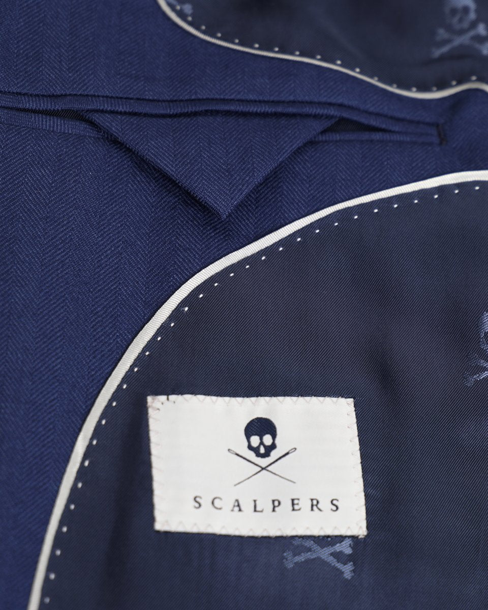 Traje de espiguilla. Blazer con cierre con botones, cuello con solapas de muesca y manga larga. Pantalón con cierre con botón y cremallera.
