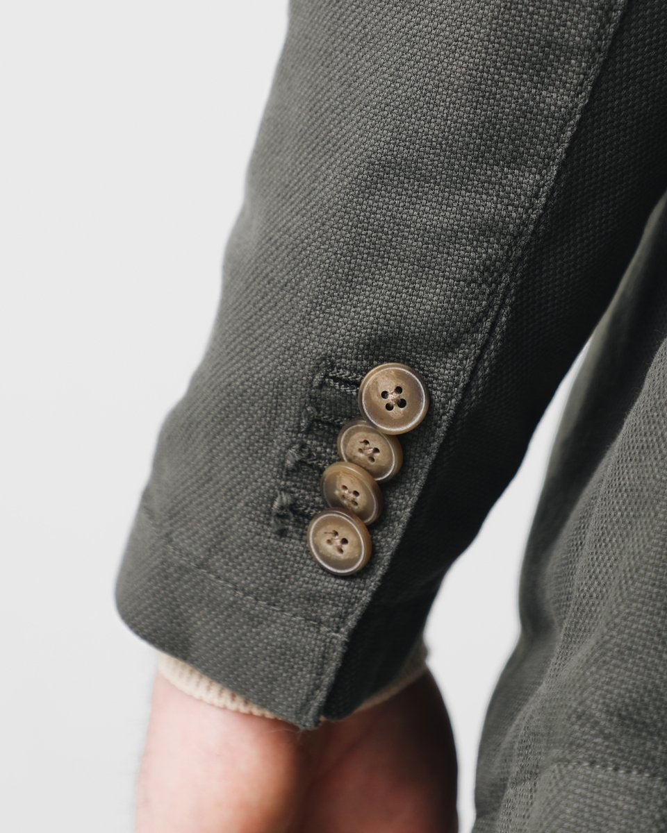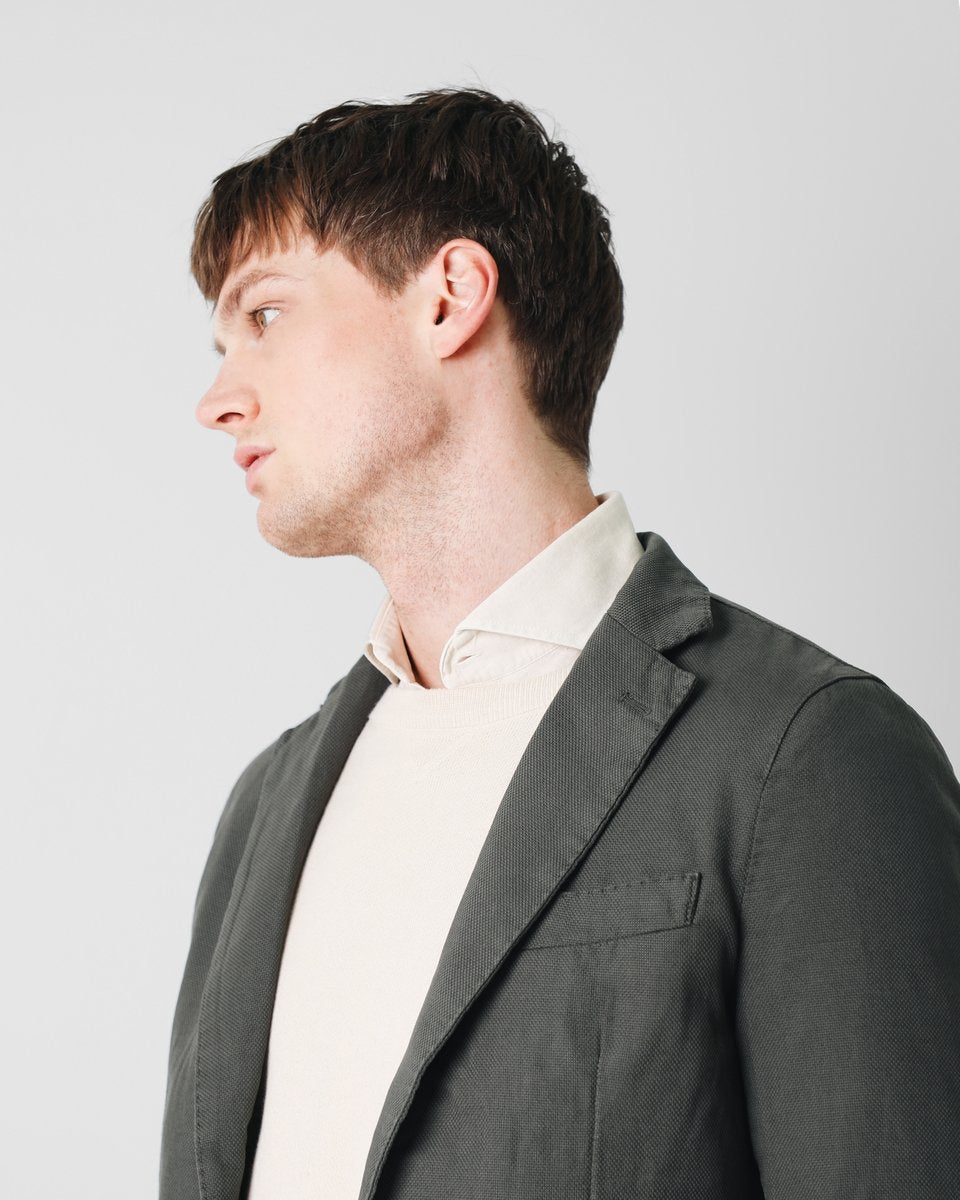 Blazer desestructurada confeccionada en mezcla de lino y algodón. Corte Slim Fit, cuello con solapas de pico, cierre cruzado con dos botones. Tiene dos bolsillos de parche frontales y uno insertado a la altura del pecho. Manga larga terminada en puño con cuatro botones y bolsillos interiores. Disponible en tres colores.