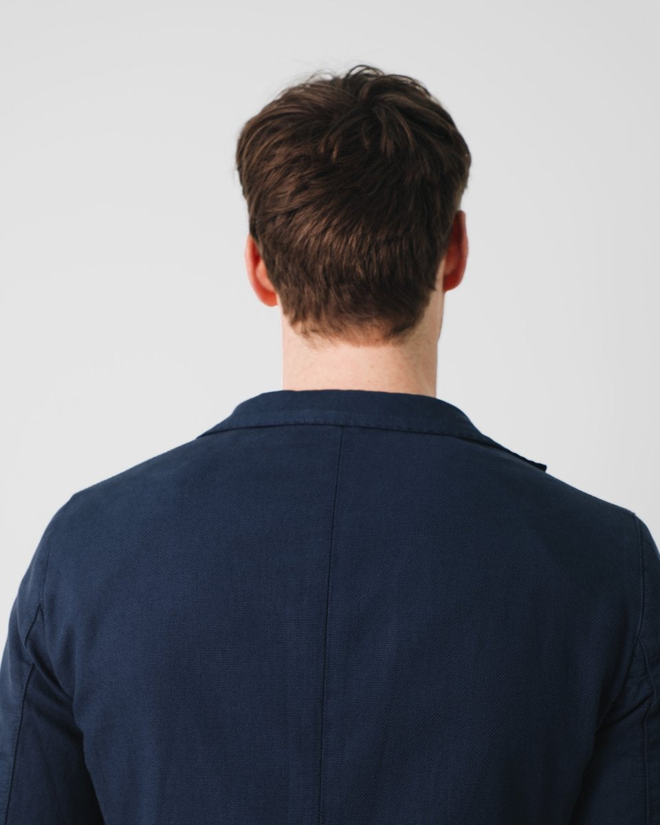 Blazer desestructurada confeccionada en mezcla de lino y algodón. Corte Slim Fit, cuello con solapas de pico, cierre cruzado con dos botones. Tiene dos bolsillos de parche frontales y uno insertado a la altura del pecho. Manga larga terminada en puño con cuatro botones y bolsillos interiores. Disponible en tres colores.