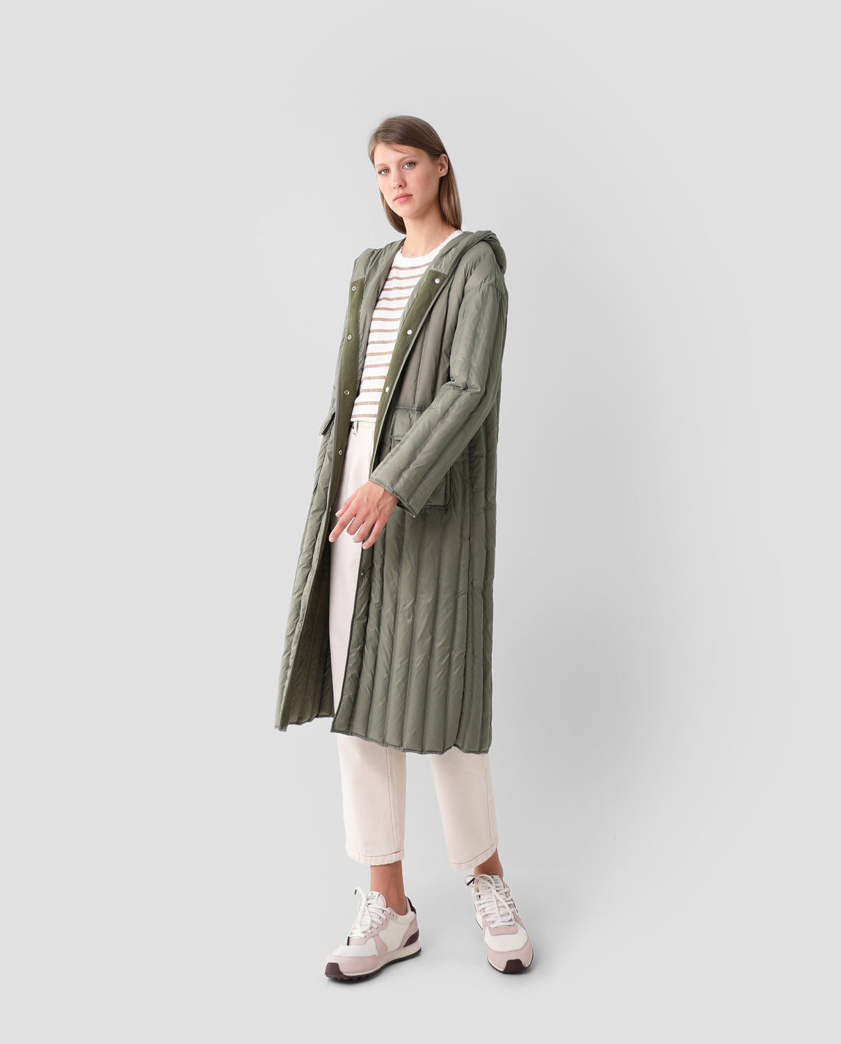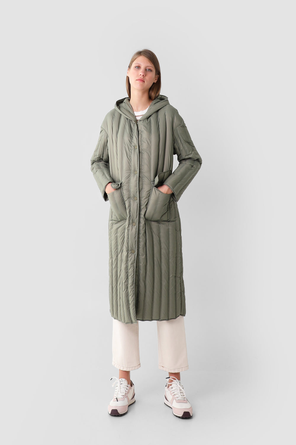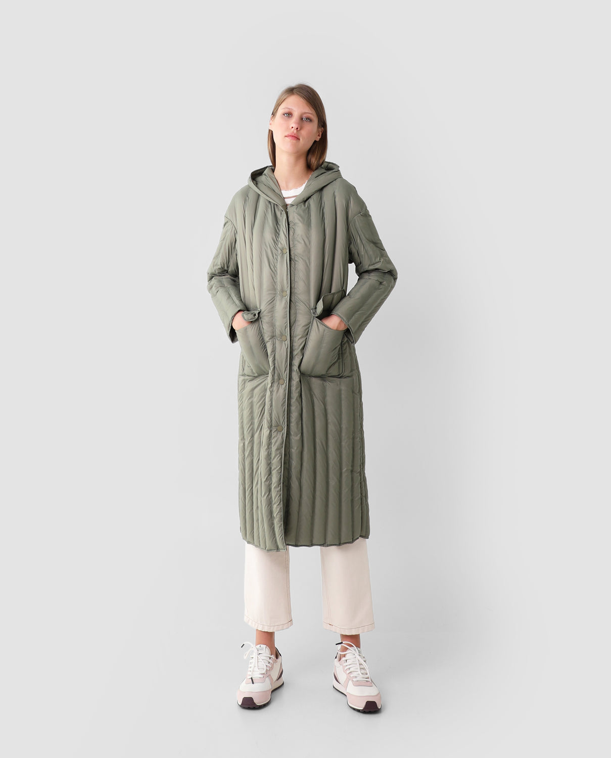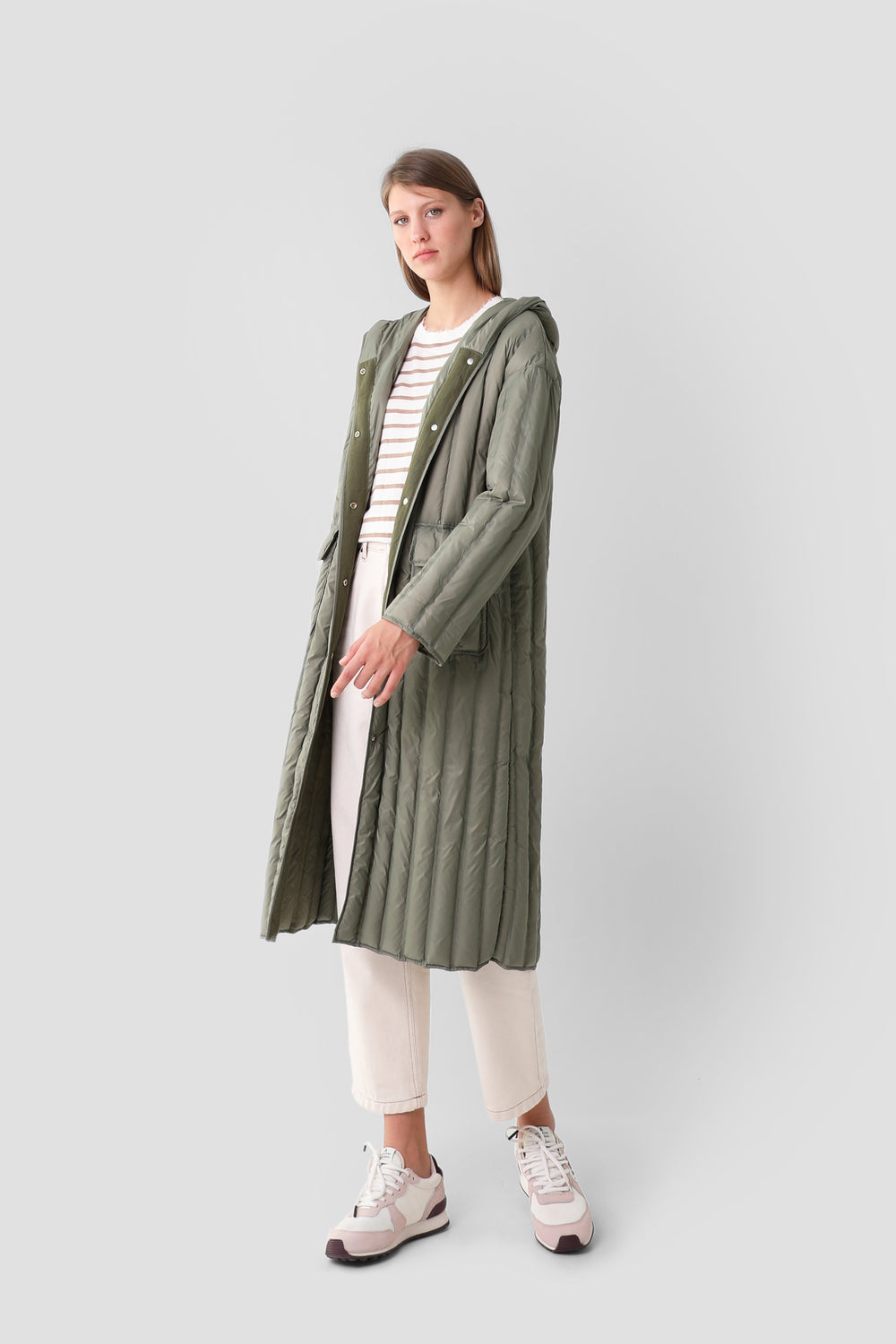 Abrigo largo acolchado confeccionado en tejido 100% nylon reciclado. Corte Regular fit, cuello con capucha y cierre con botones presión. Bolsillos de plastrón con tapeta.