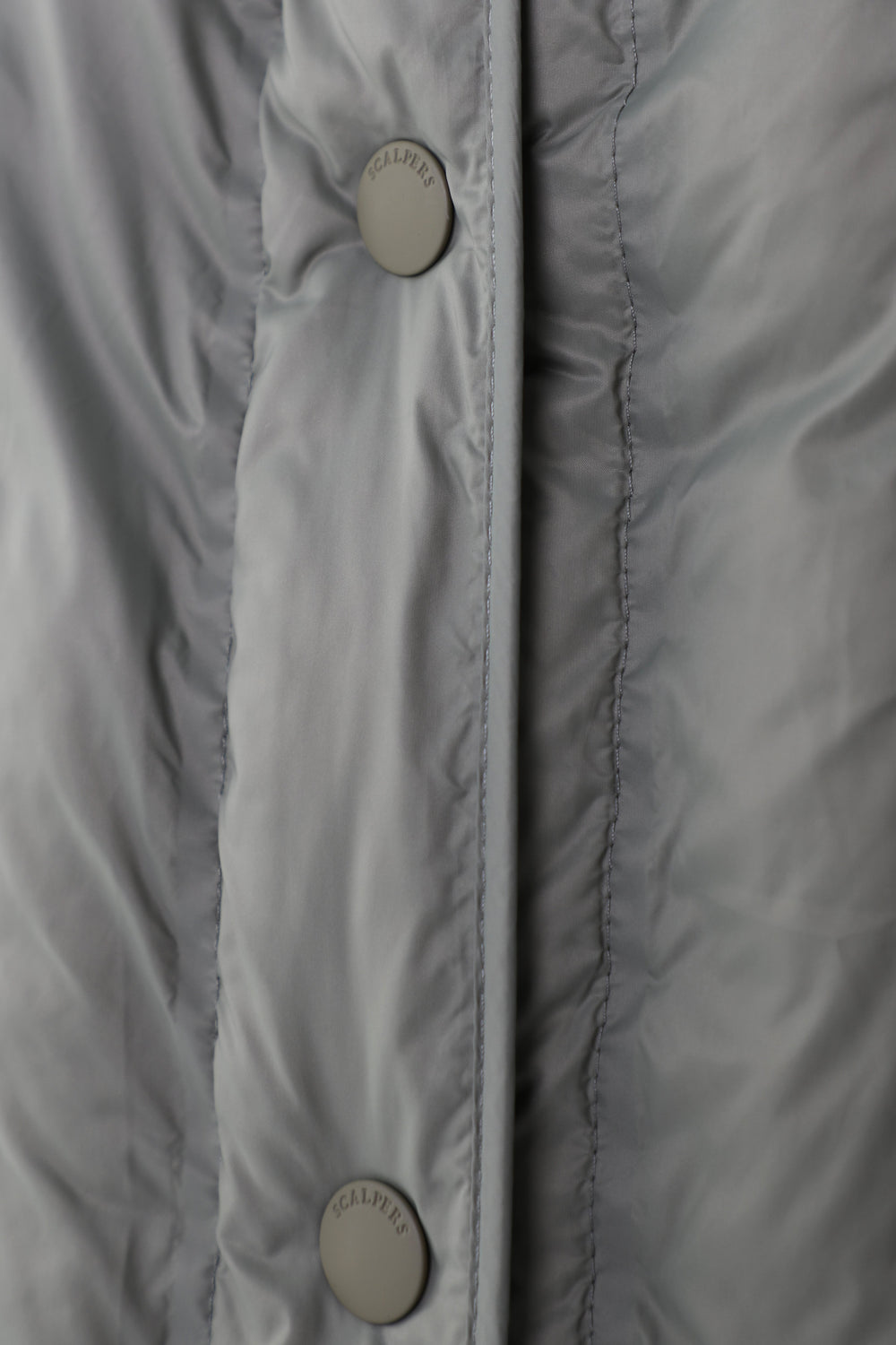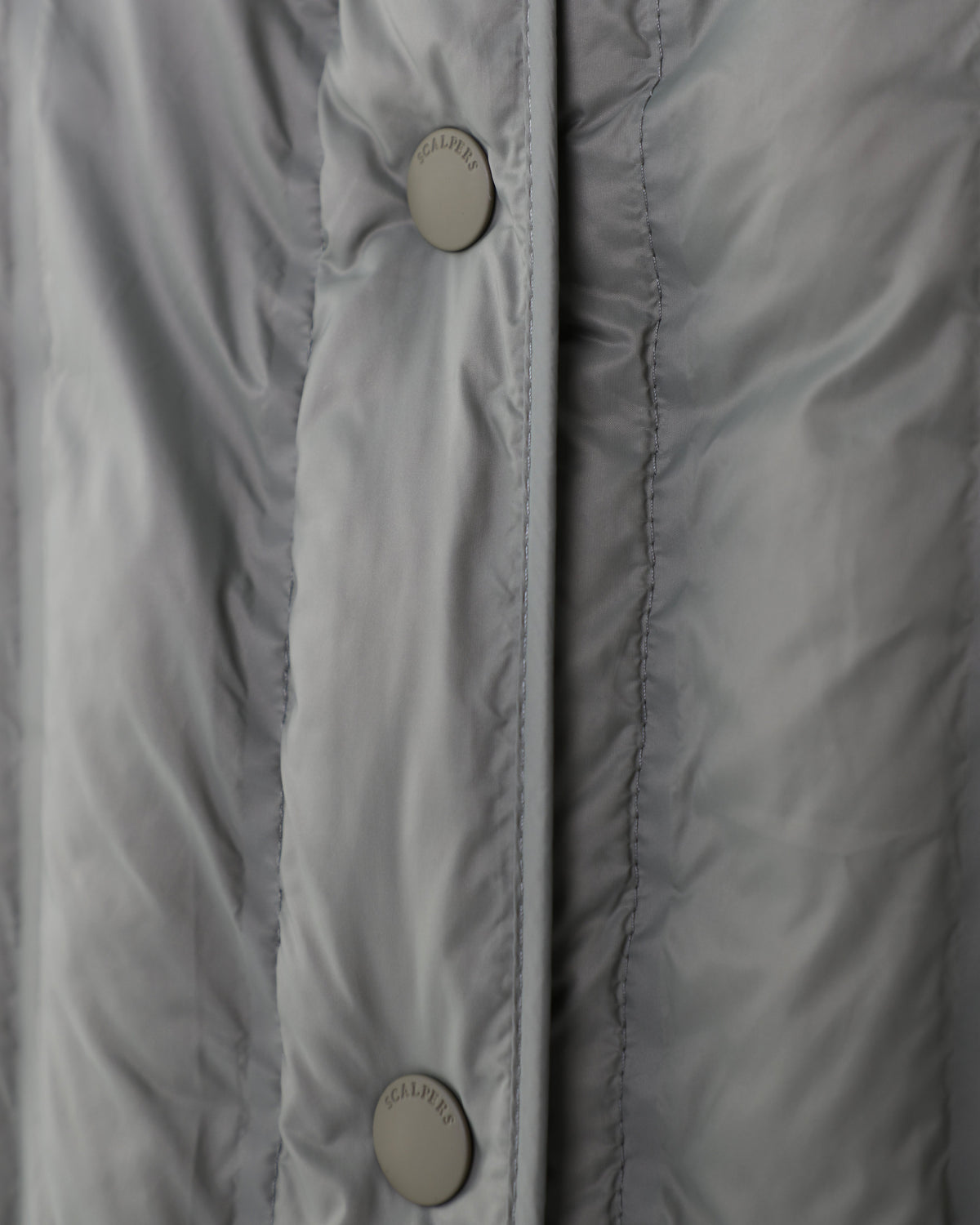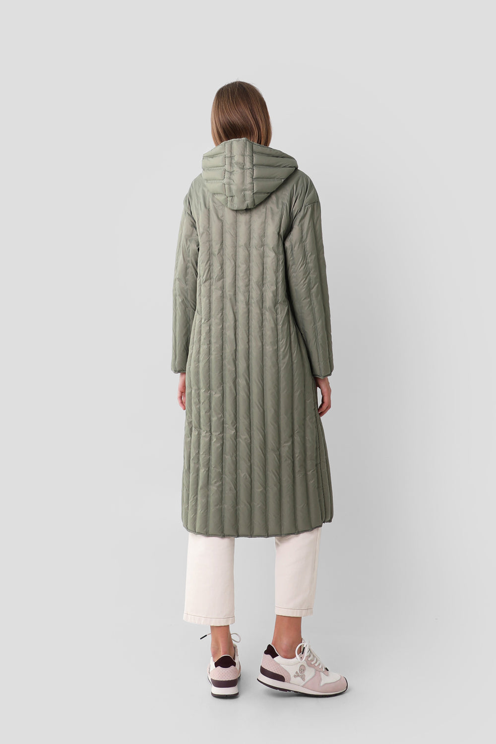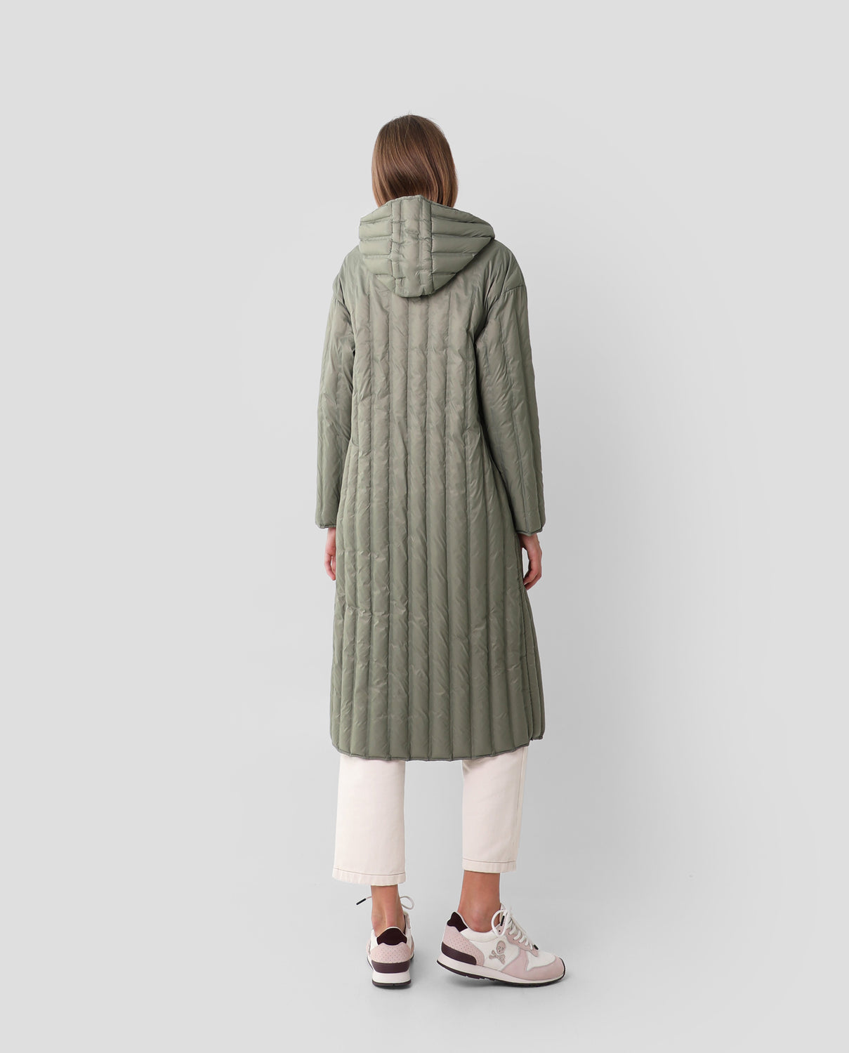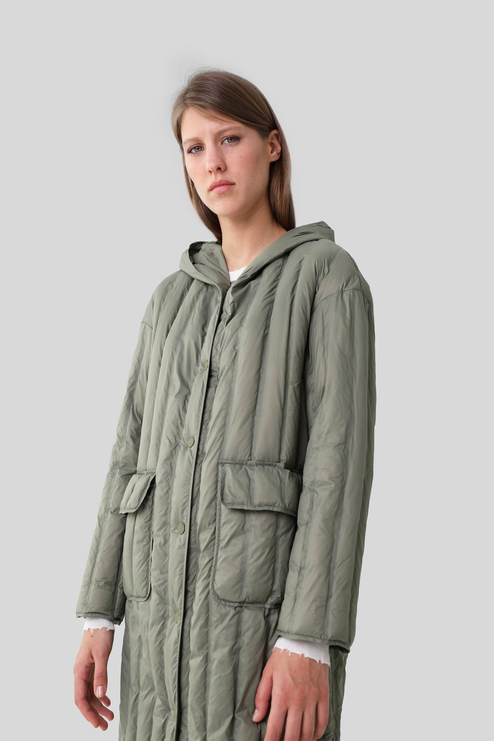 Abrigo largo acolchado confeccionado en tejido 100% nylon reciclado. Corte Regular fit, cuello con capucha y cierre con botones presión. Bolsillos de plastrón con tapeta.