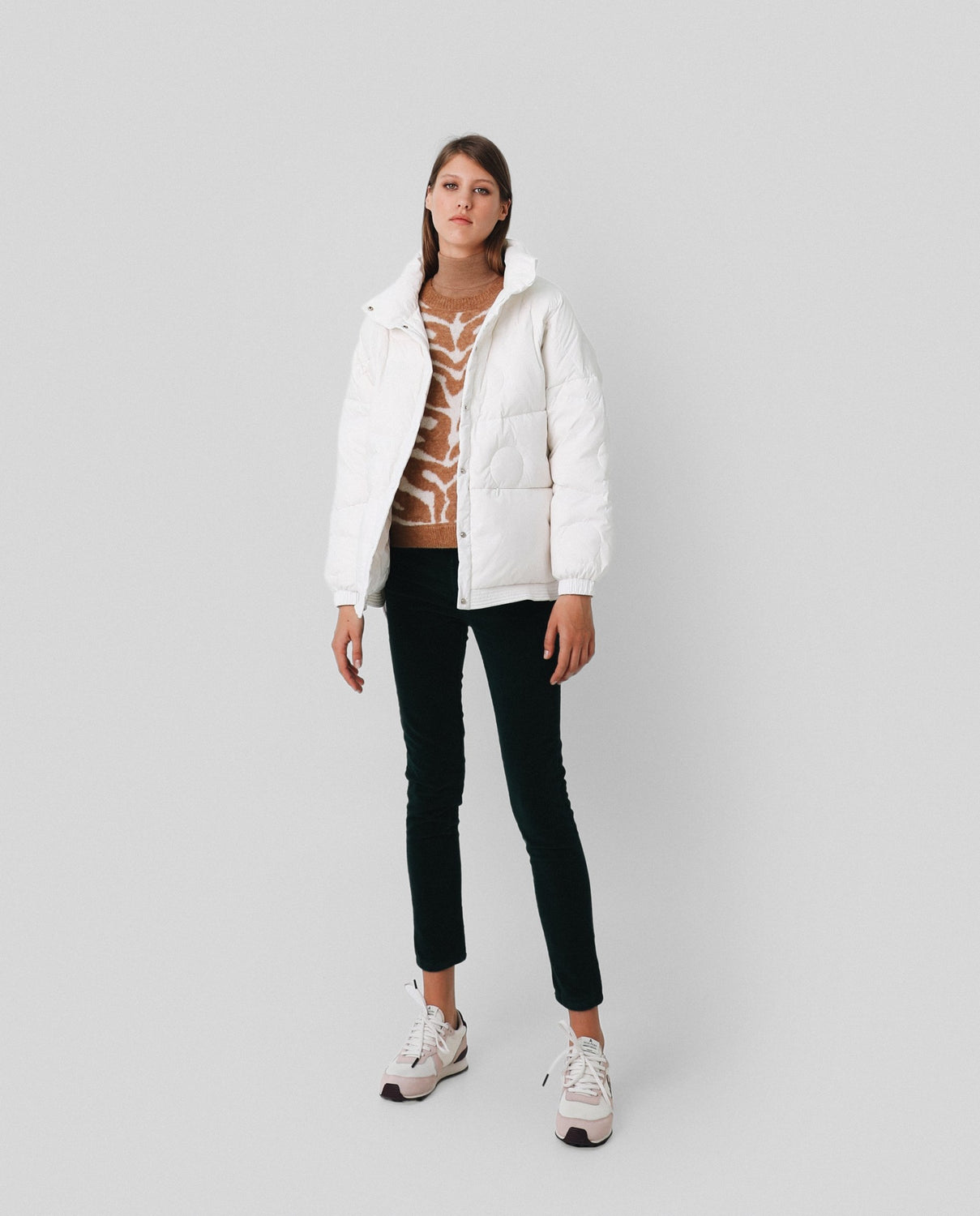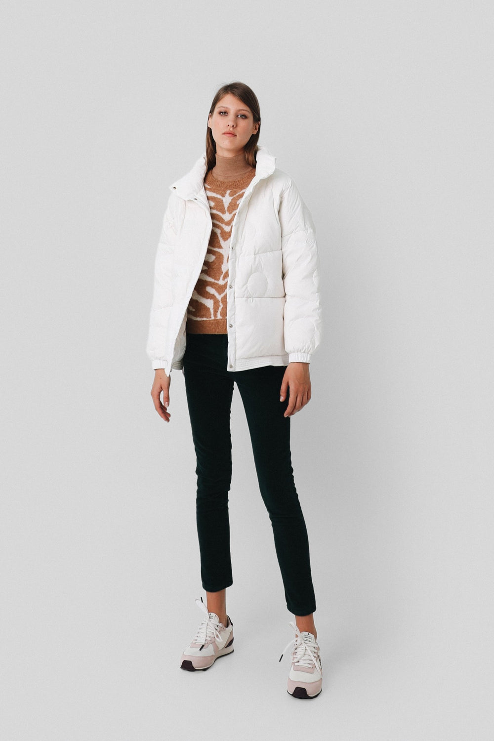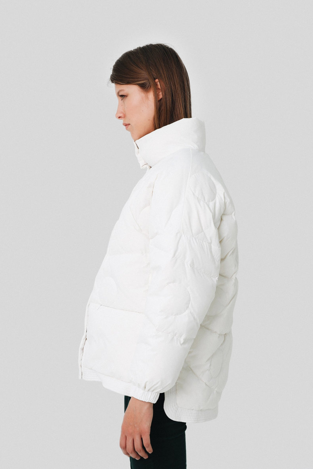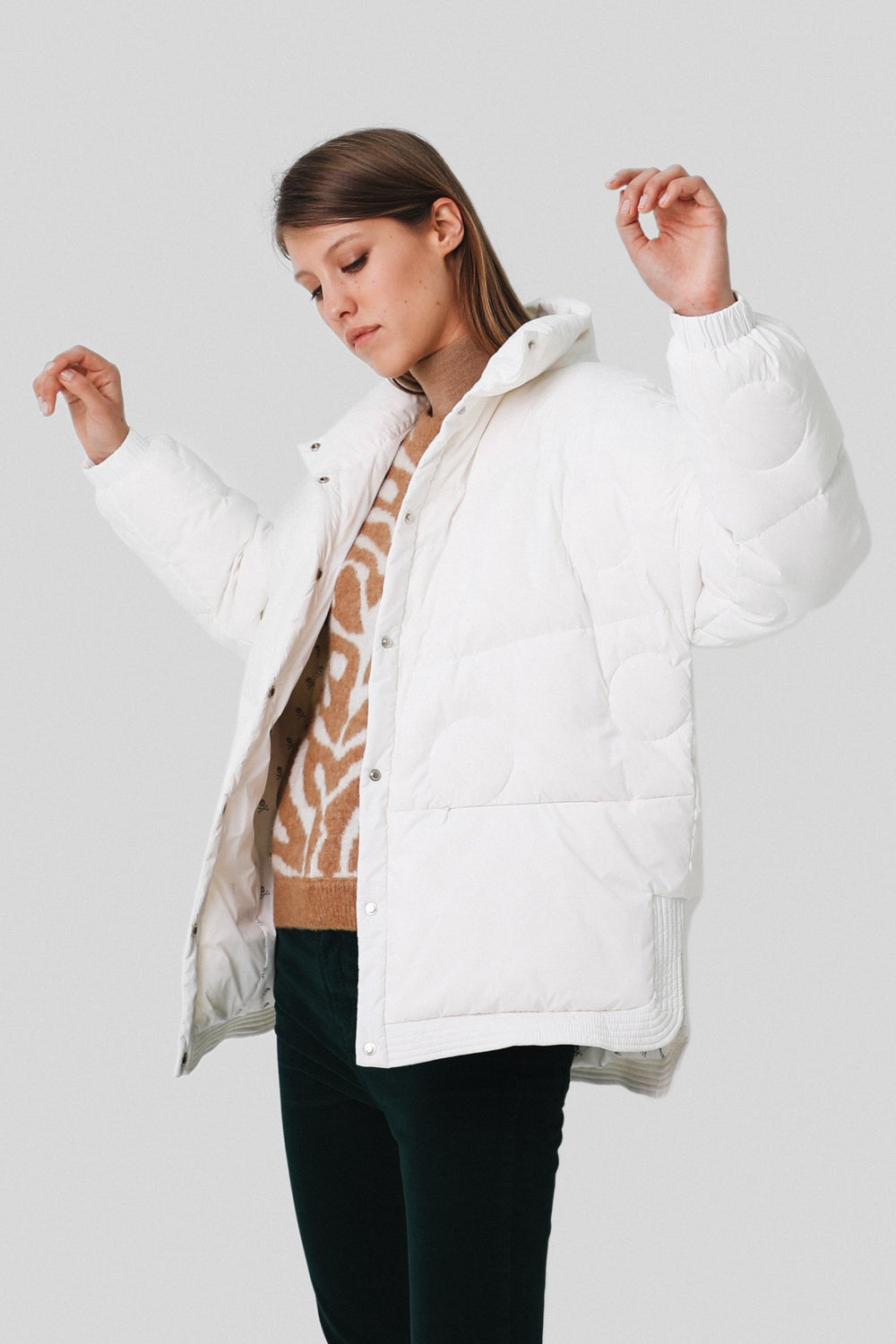 Abrigo acolchado confeccionado en tejido de nailon. Corte Regular Fit asimétrico, cuello alto y cierre con cremallera oculta por tapeta. Manga larga terminada en elástico. Bolsillos invisibles en el delantero.