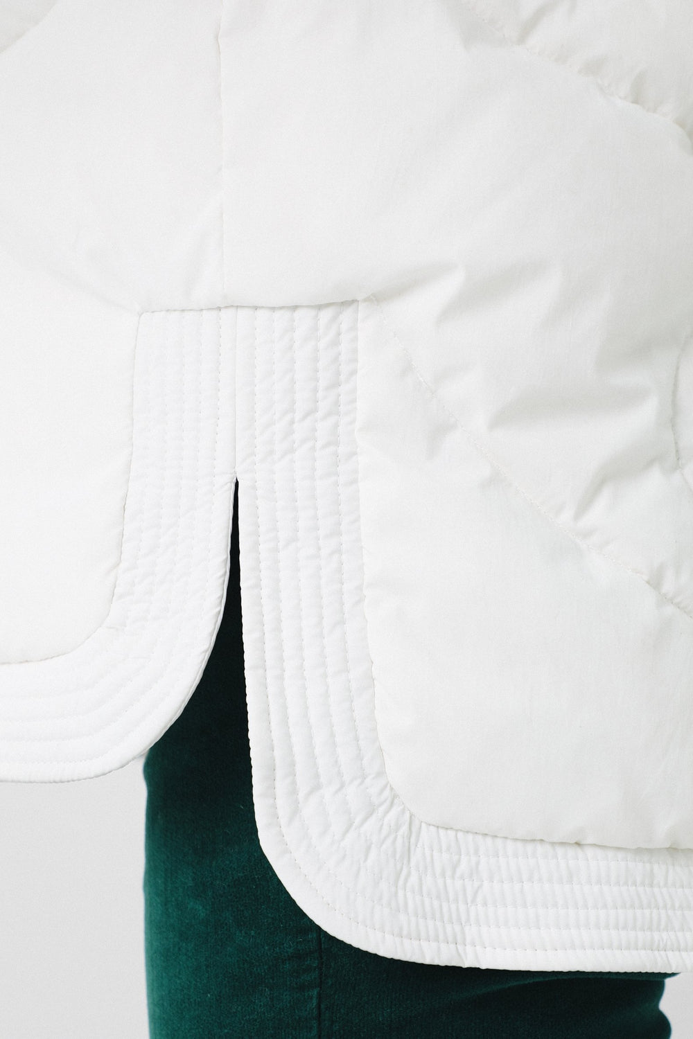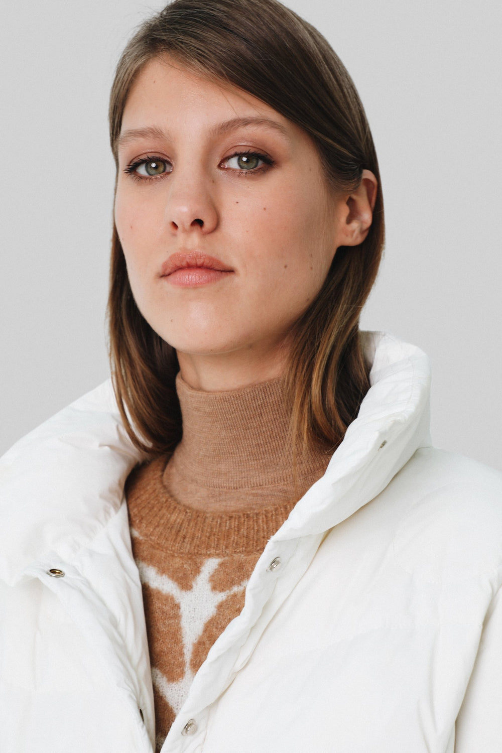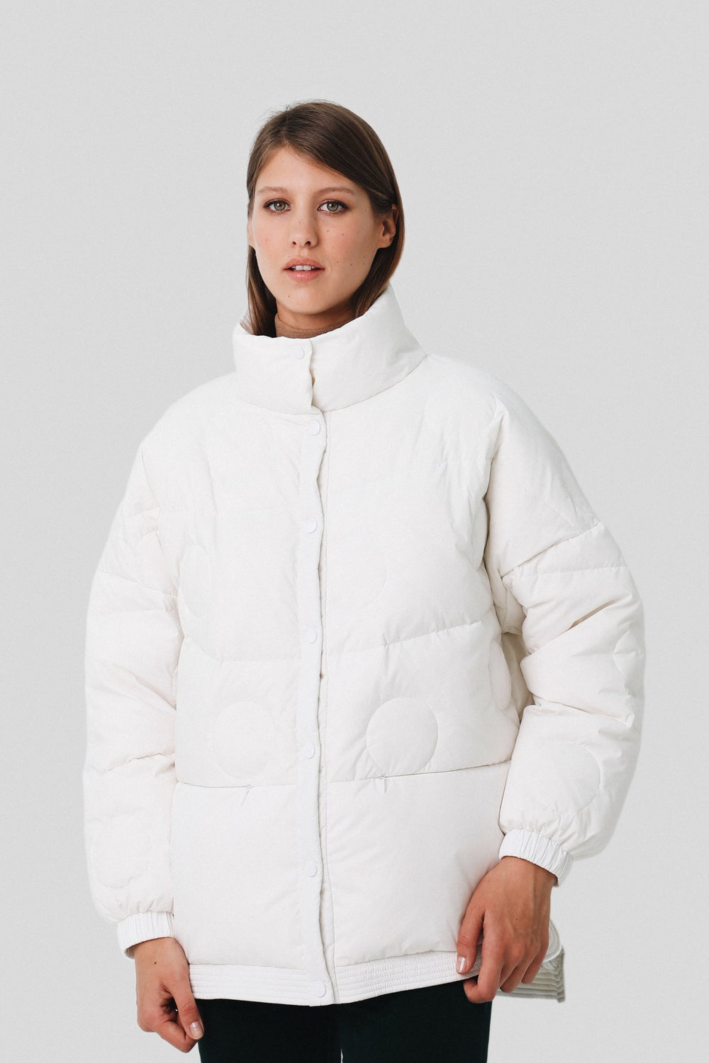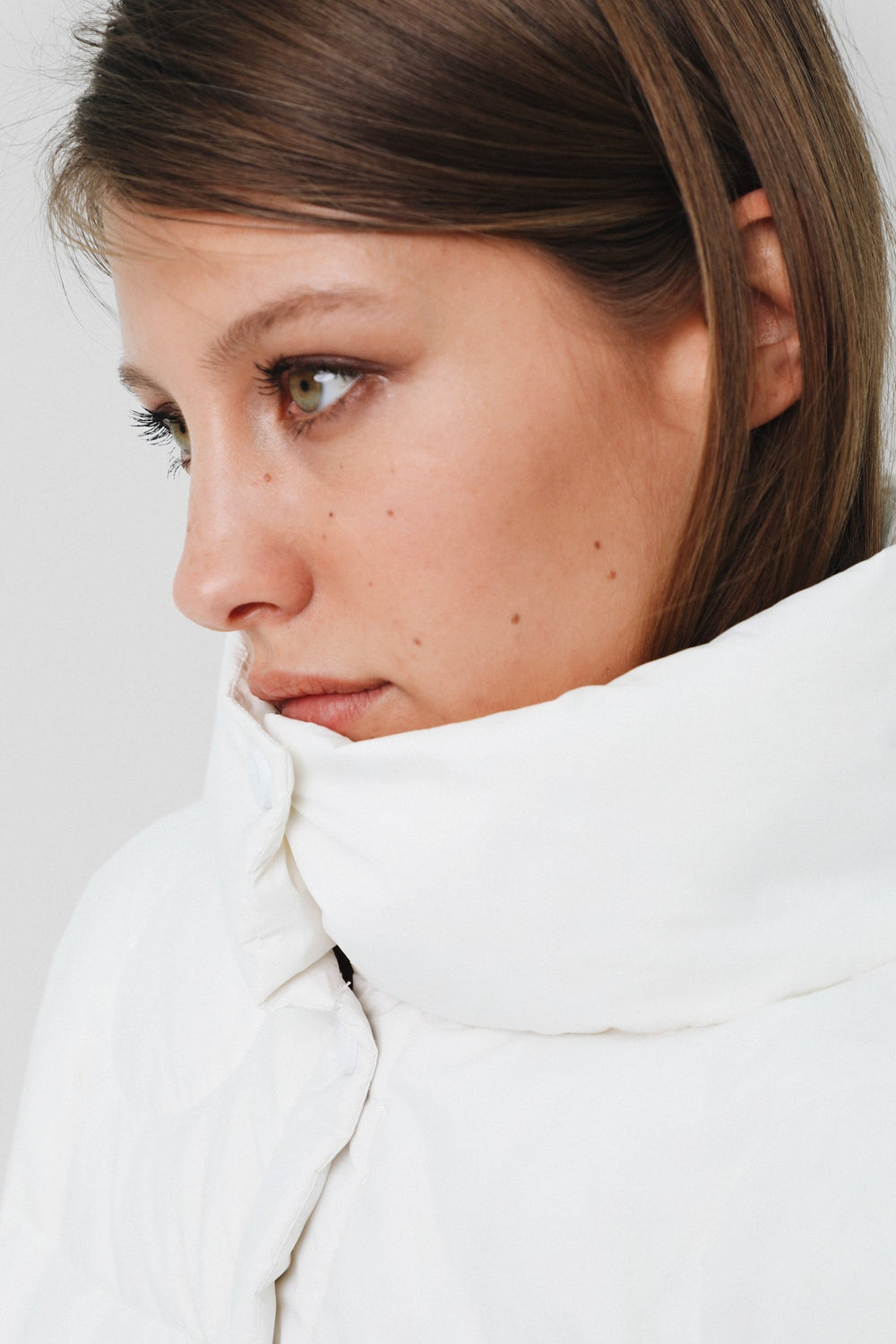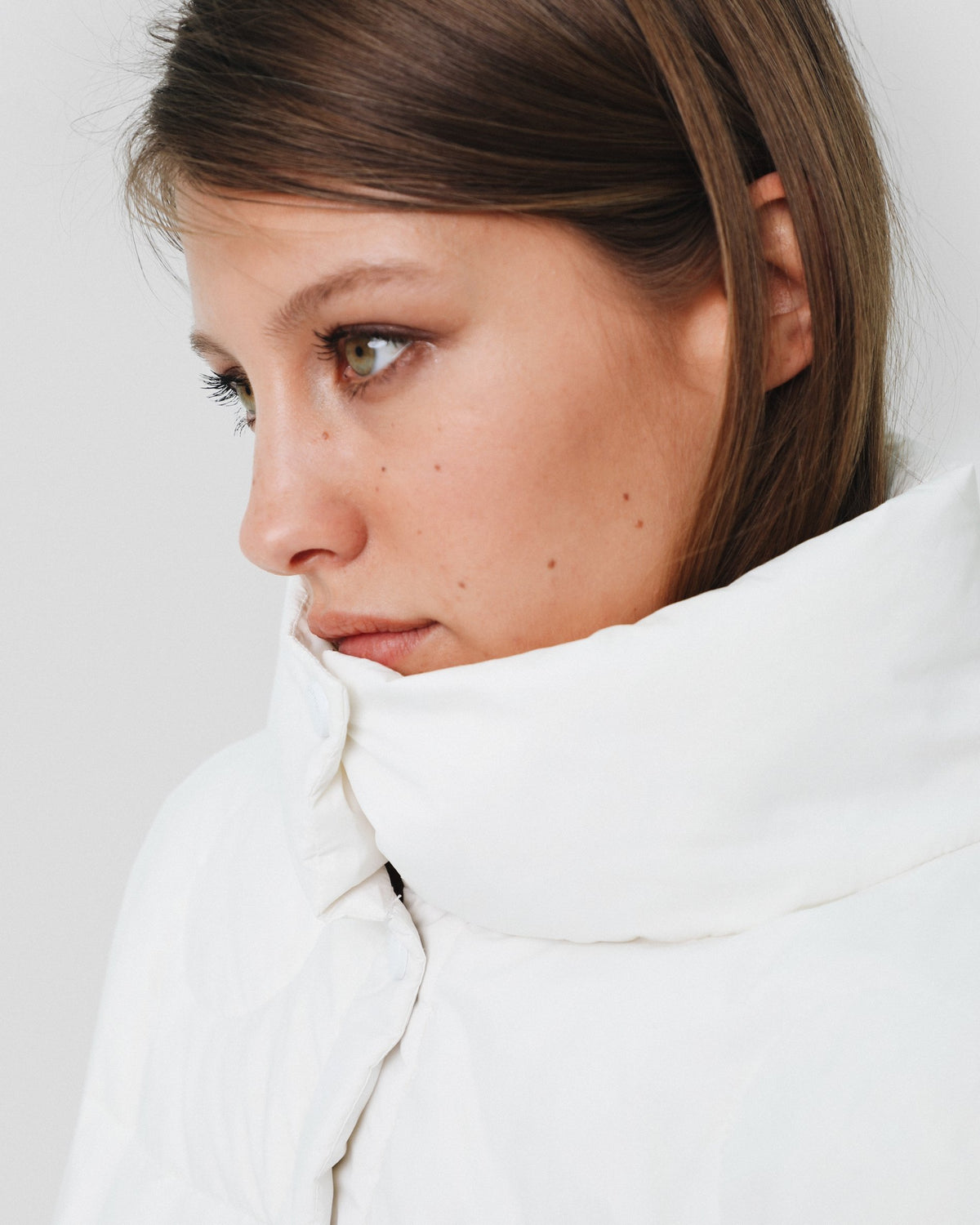 Abrigo acolchado confeccionado en tejido de nailon. Corte Regular Fit asimétrico, cuello alto y cierre con cremallera oculta por tapeta. Manga larga terminada en elástico. Bolsillos invisibles en el delantero.