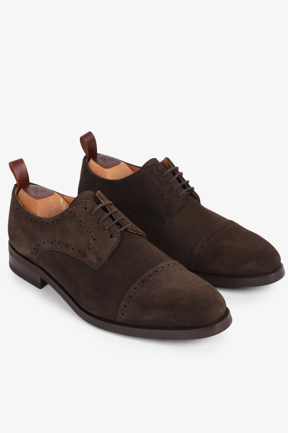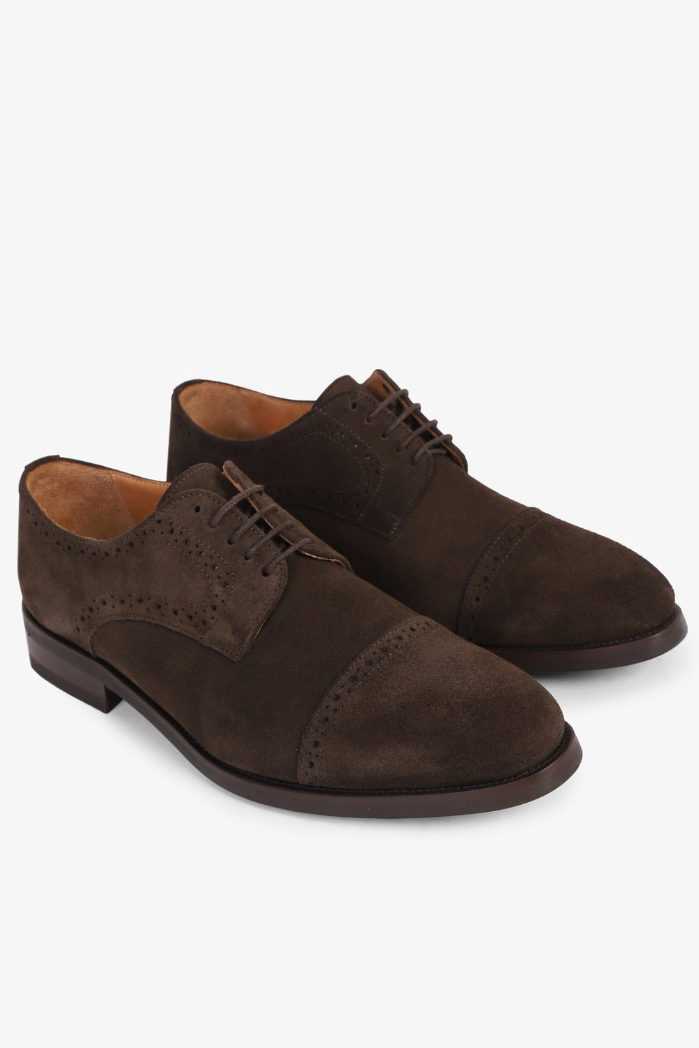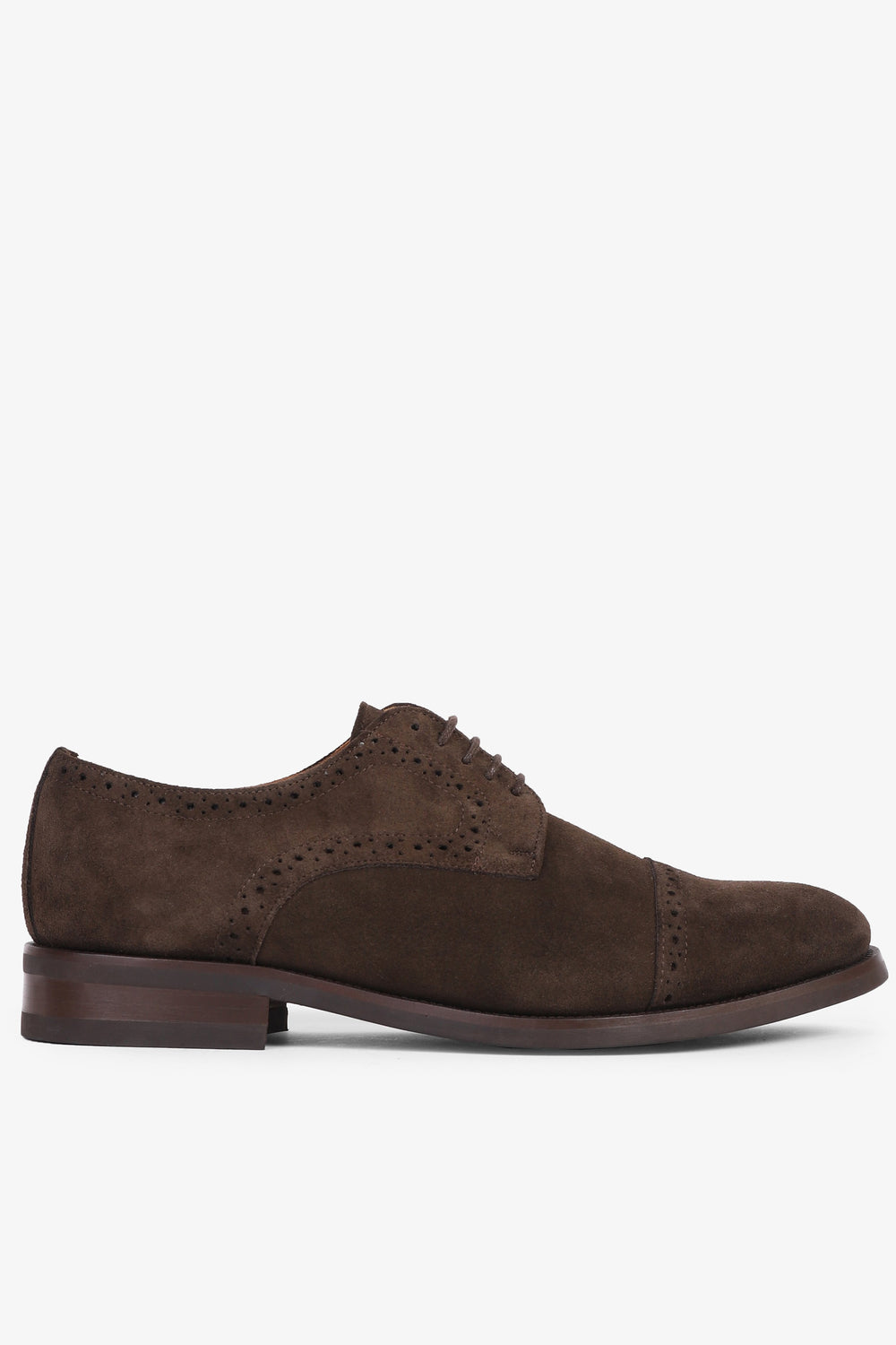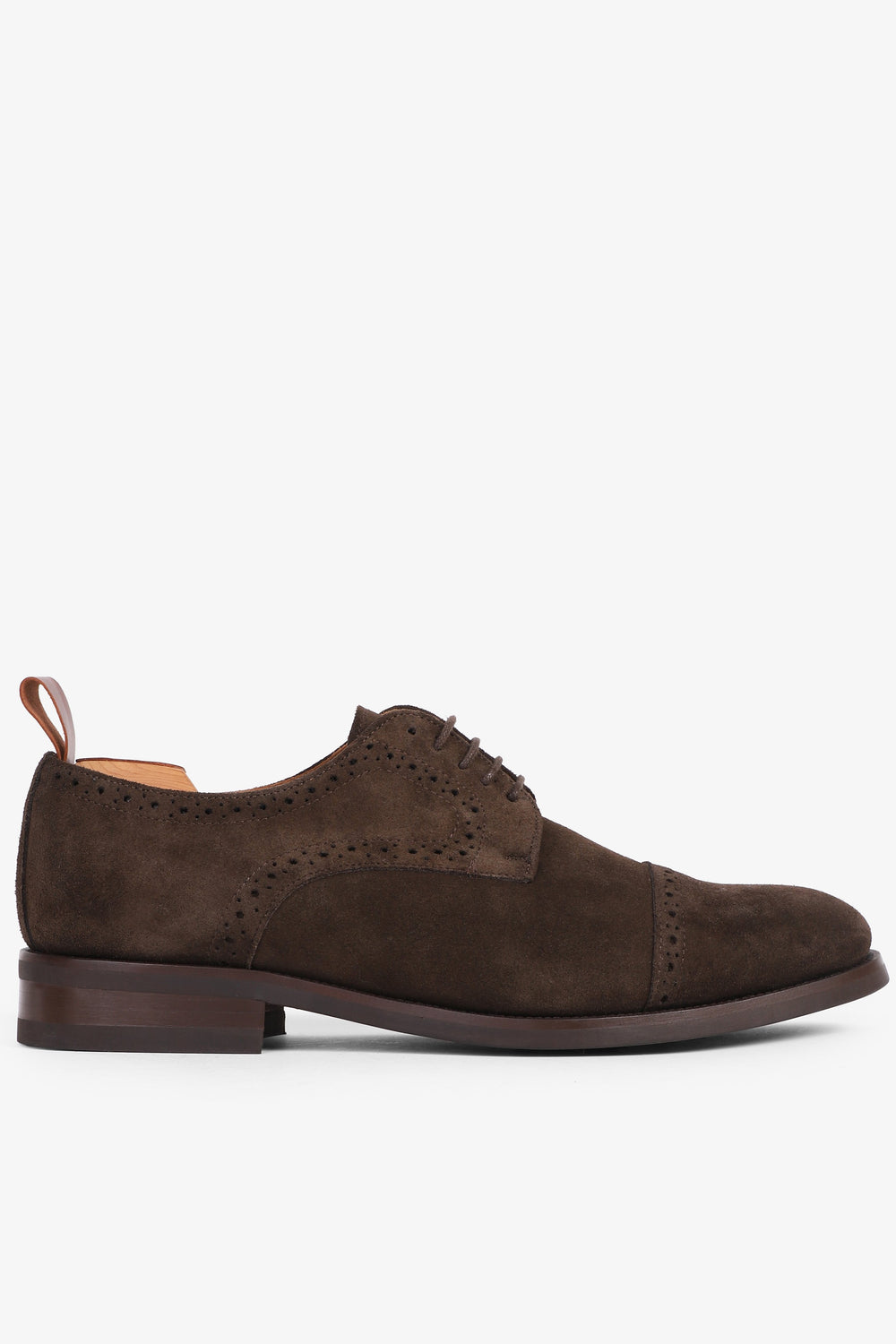 Zapatos blucher confeccionados en 100% piel con exterior de serraje. Cierre con cordones, suela de goma y puntera partida con detalle de picados. Tiene forro de piel. Fabricados en España.