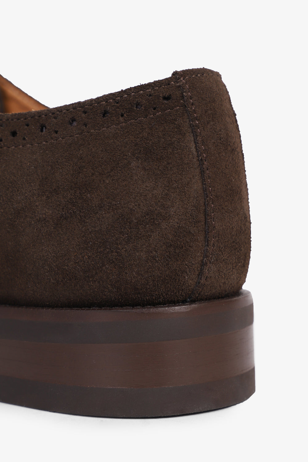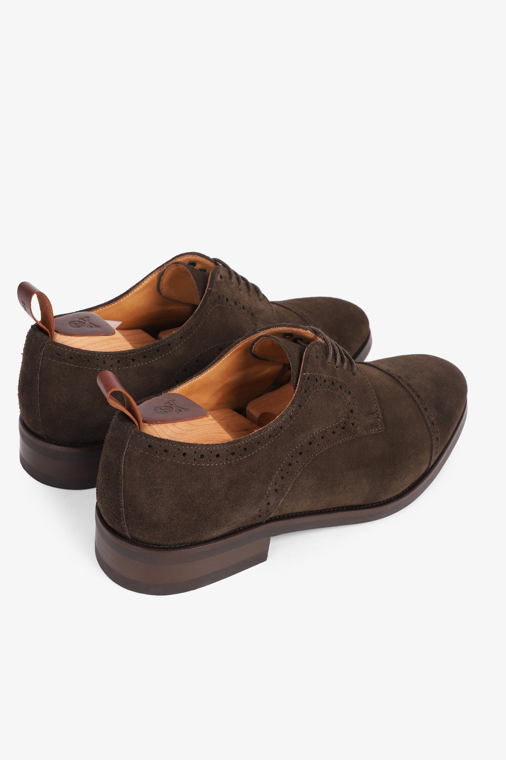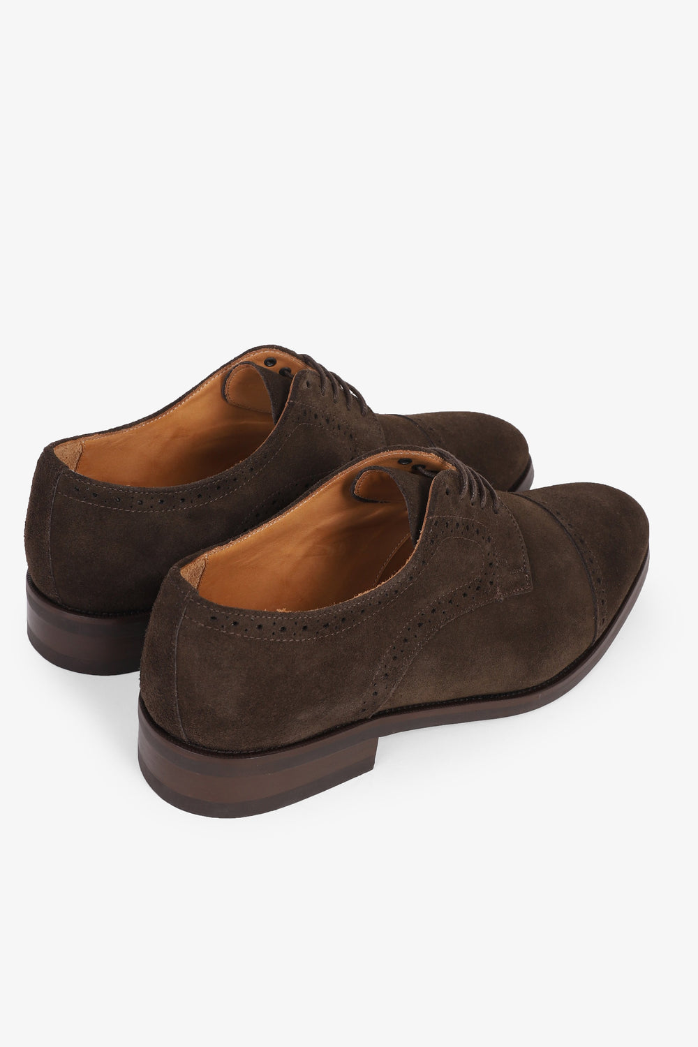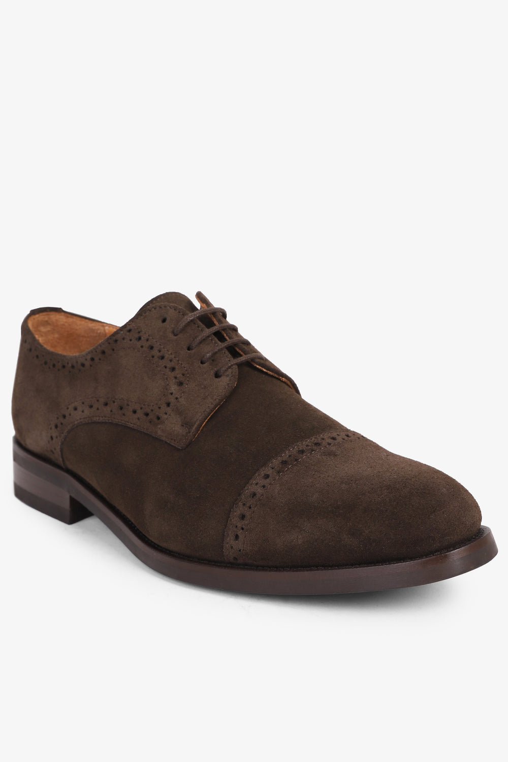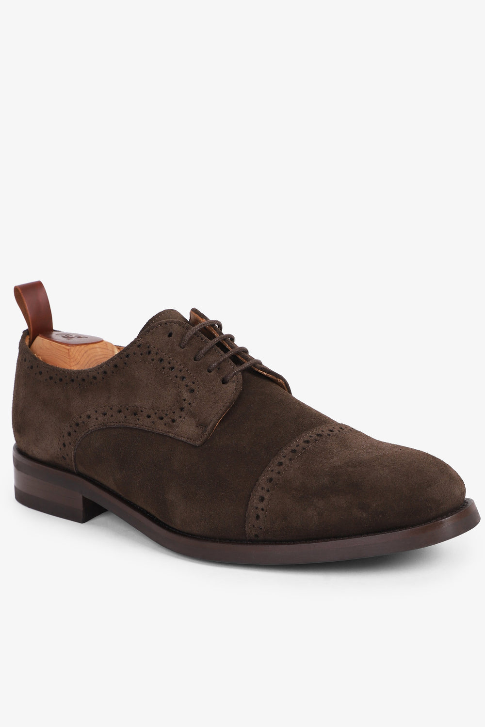 Zapatos blucher confeccionados en 100% piel con exterior de serraje. Cierre con cordones, suela de goma y puntera partida con detalle de picados. Tiene forro de piel. Fabricados en España.