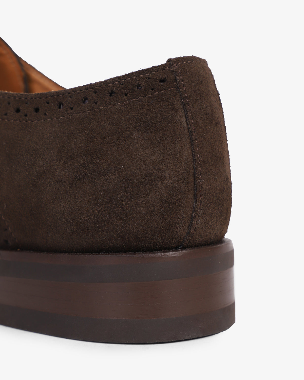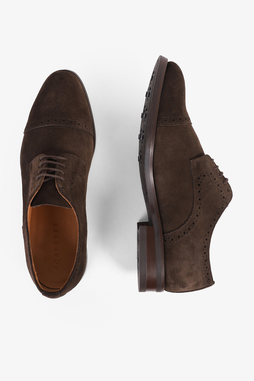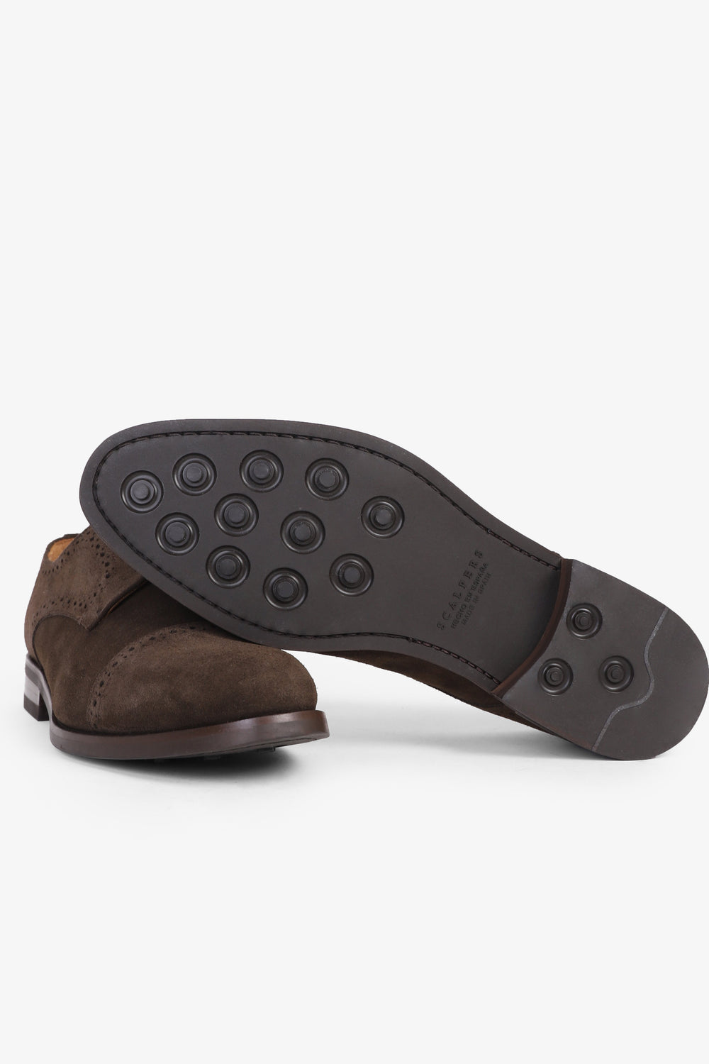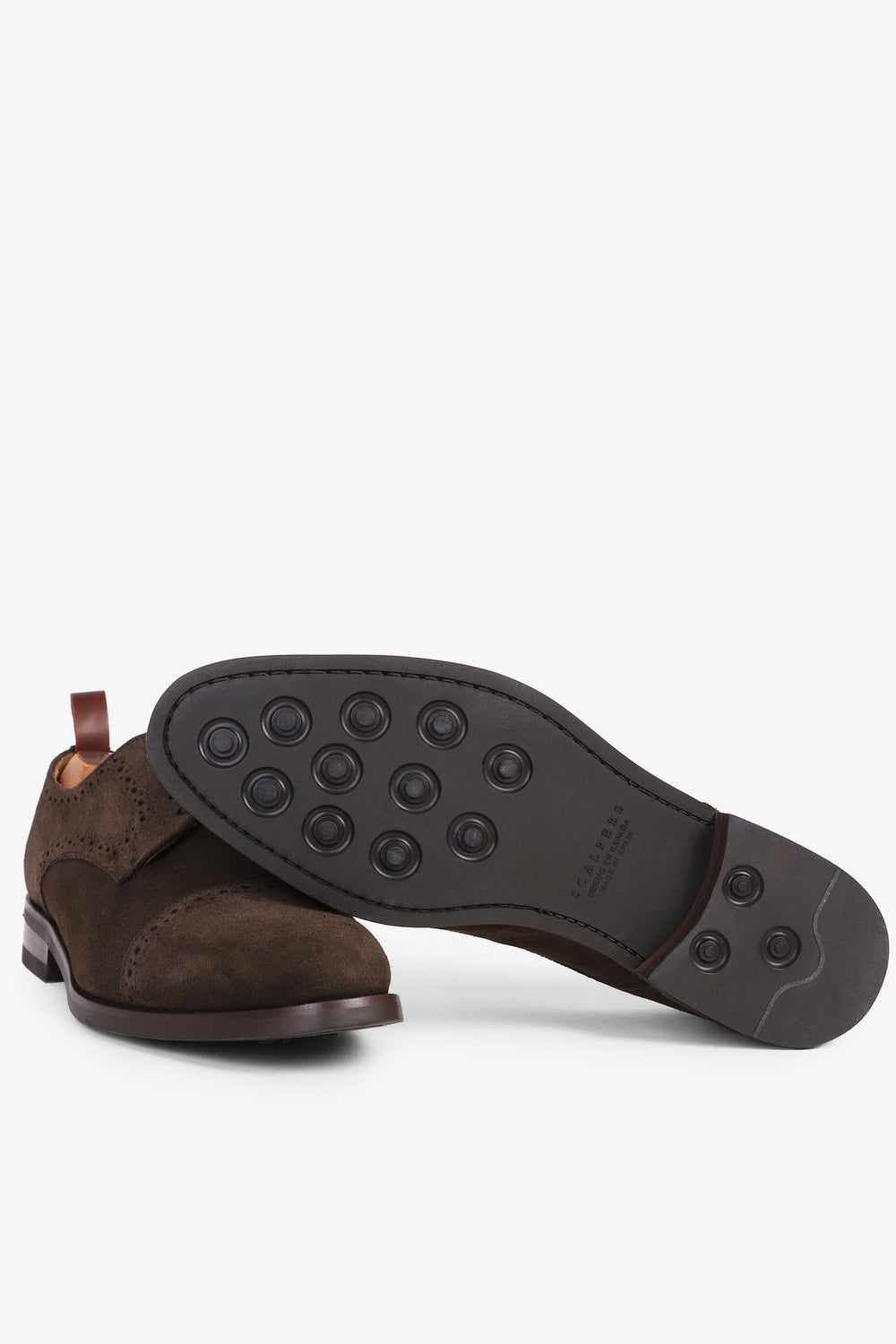 Zapatos blucher confeccionados en 100% piel con exterior de serraje. Cierre con cordones, suela de goma y puntera partida con detalle de picados. Tiene forro de piel. Fabricados en España.