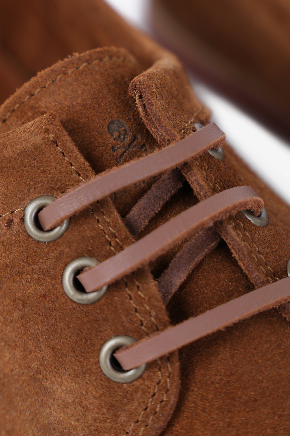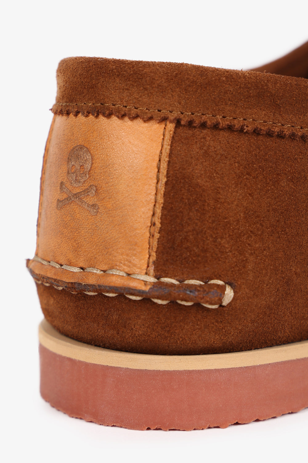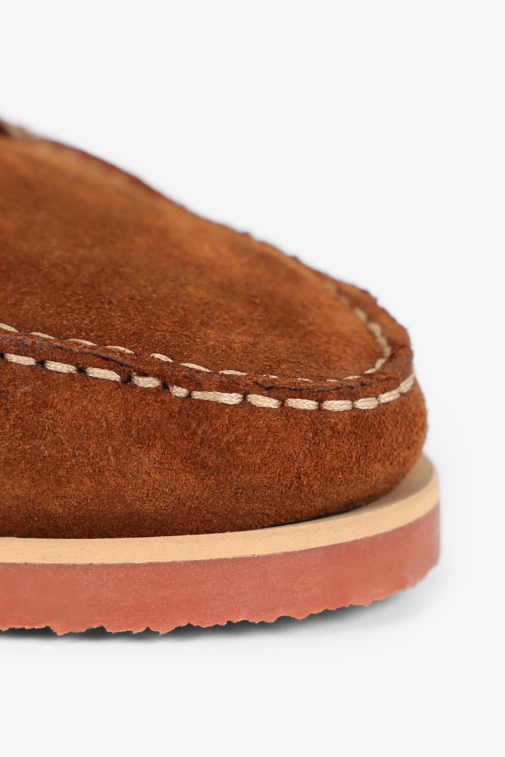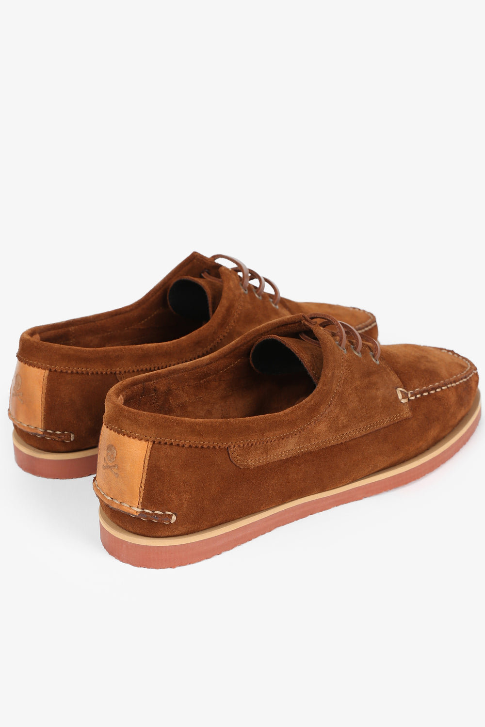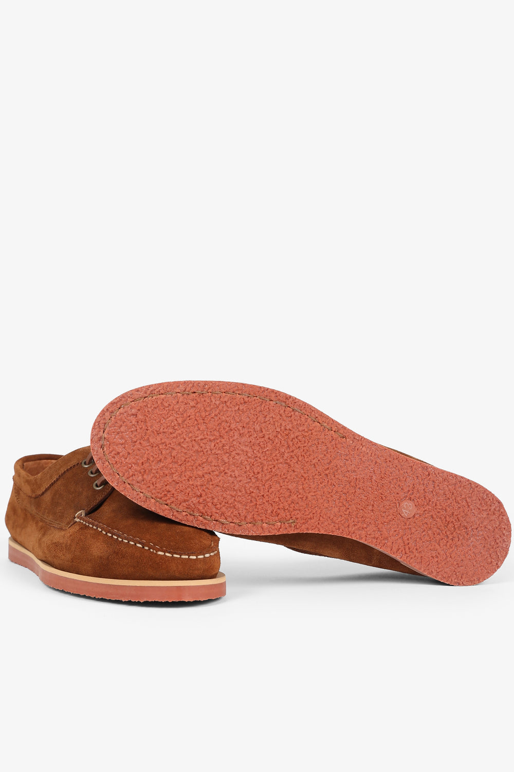 Naúticos confeccionados en serraje. Cierre con cordones de piel y suela de goma.