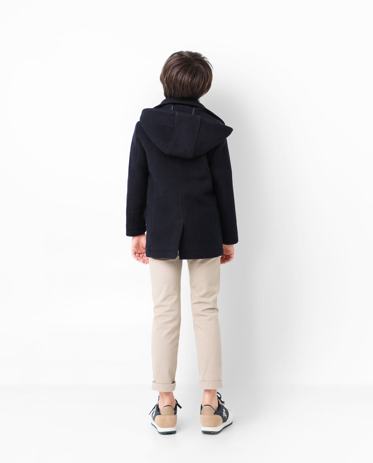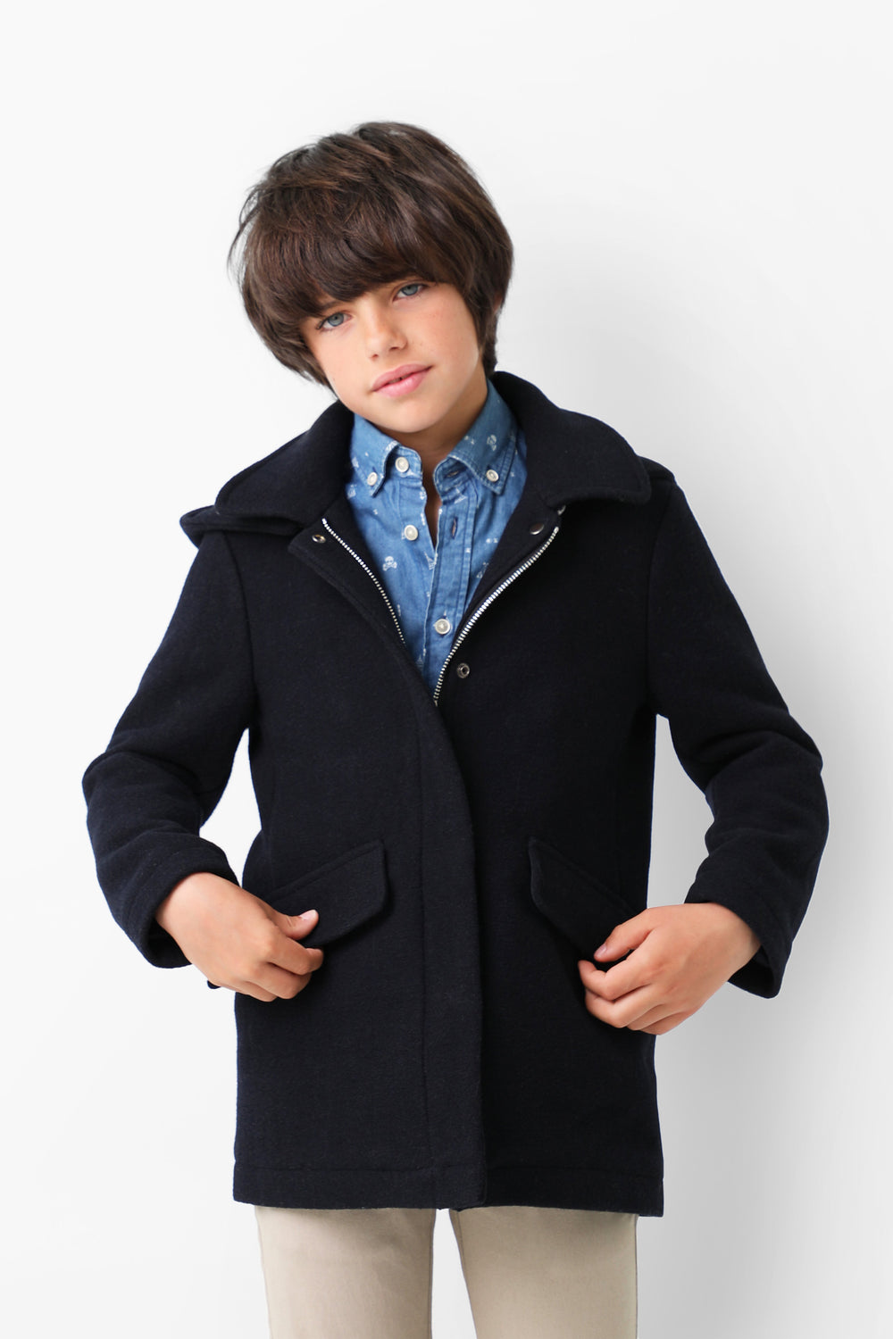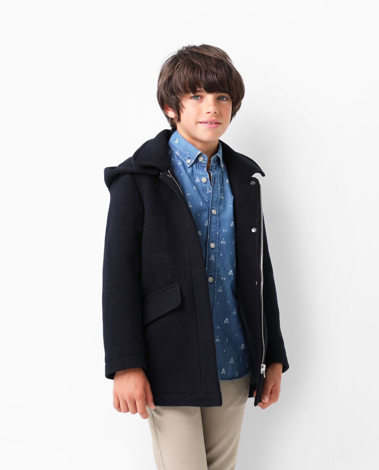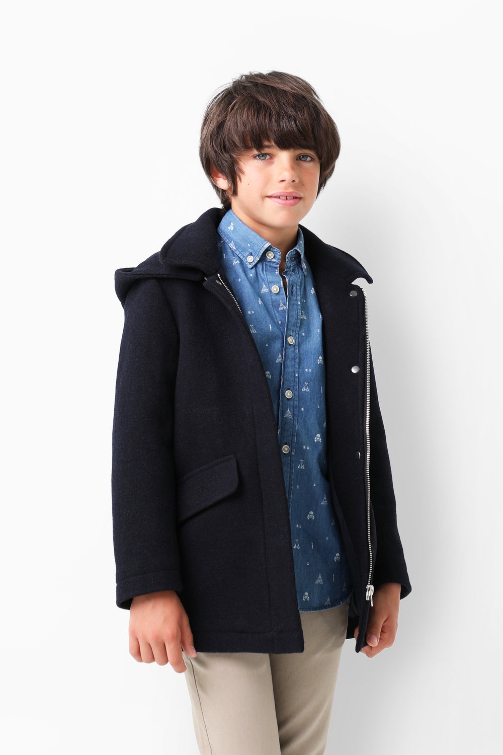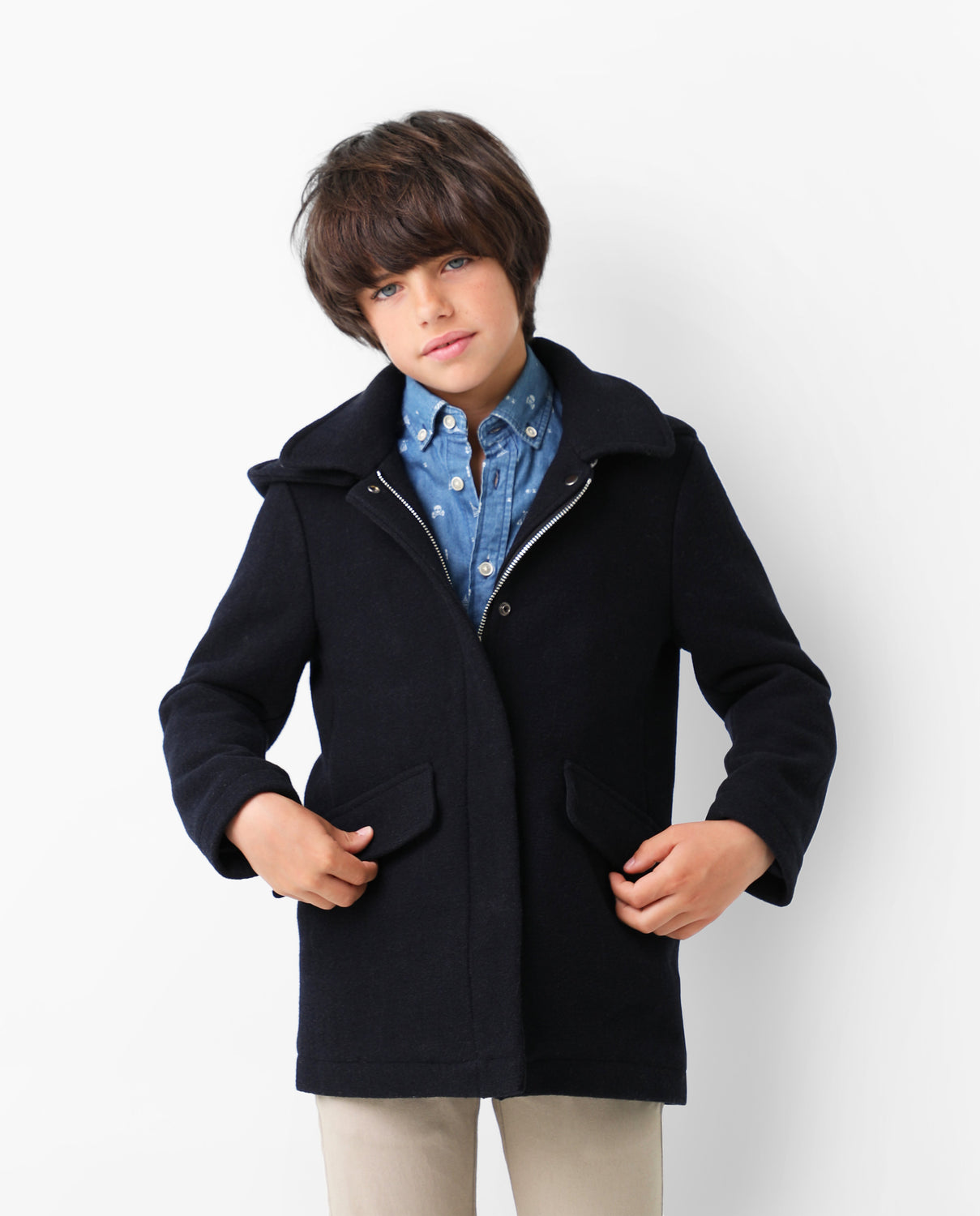Abrigo de paño confeccionado en algodón. Corte Regular Fit, cuello con capucha y cierre con cremallera. Bolsillos frontales y manga larga.