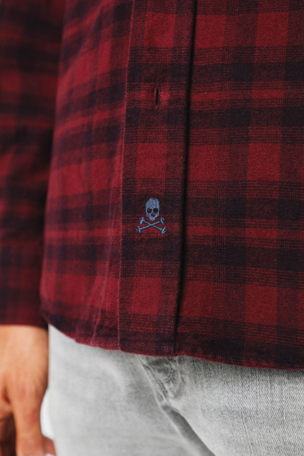 Camisa confeccionada en tejido 100% algodón. Corte Regular Fit, cuello Konika y cierre con botones. Manga larga terminada en puño simple y un bolsillo de plastrón en el pecho. Detalle de calavera bordada en el bajo de la tapeta.