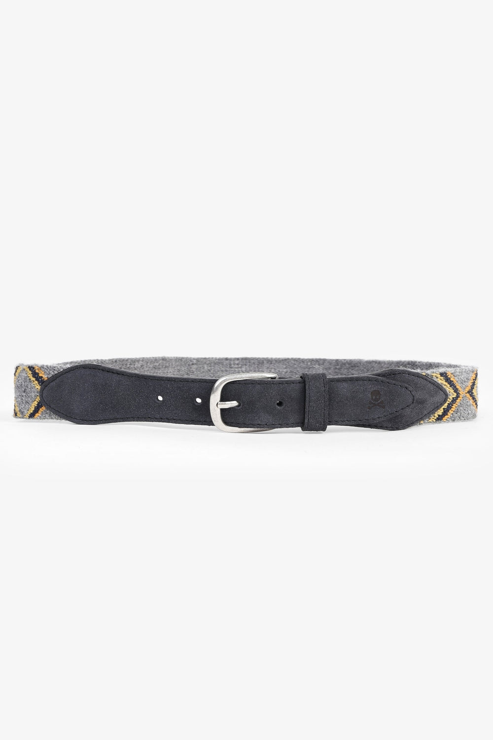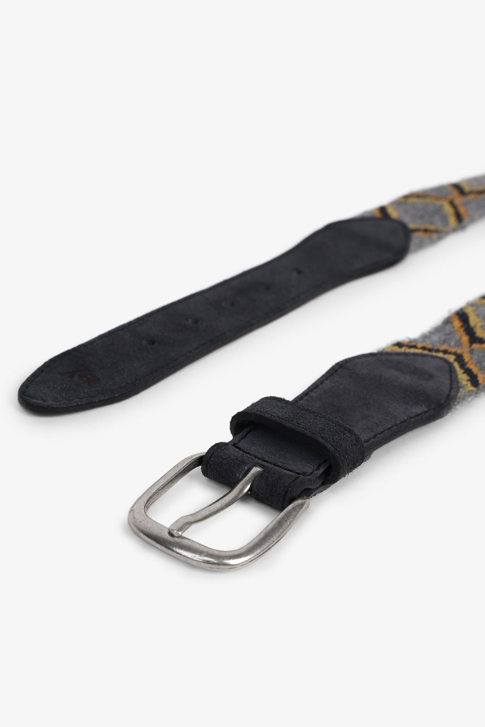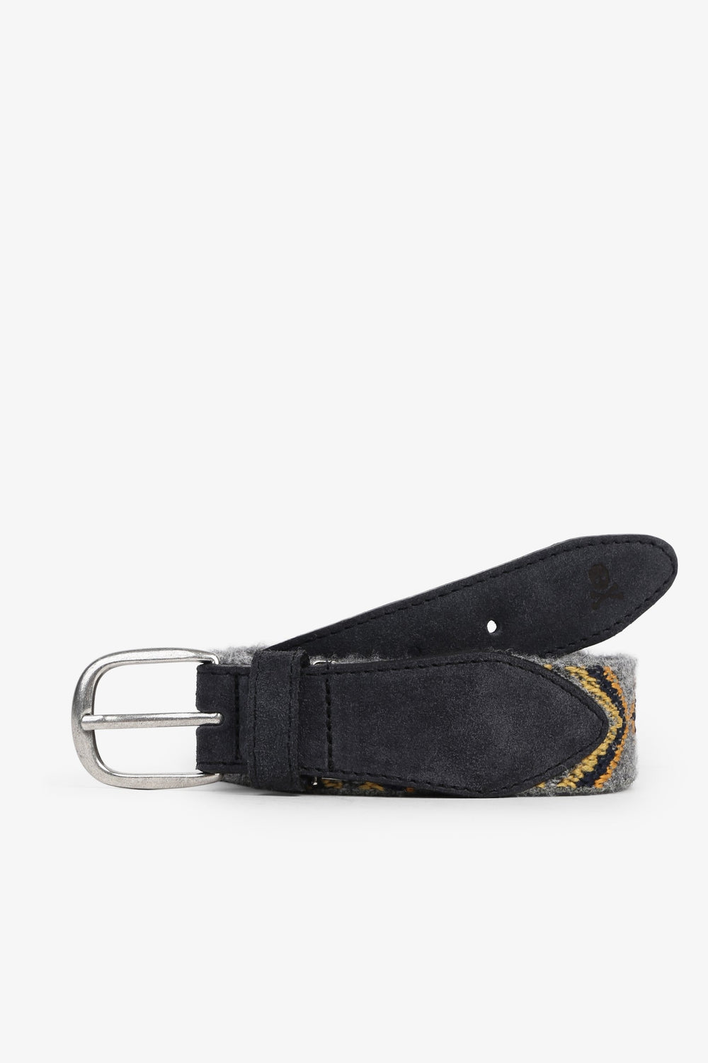 Cinturón estampado confeccionado en tejido de lana merino. Cierre con hebilla metálica y terminaciones en serraje. Pase de 30 mm. Fabricado en España.
