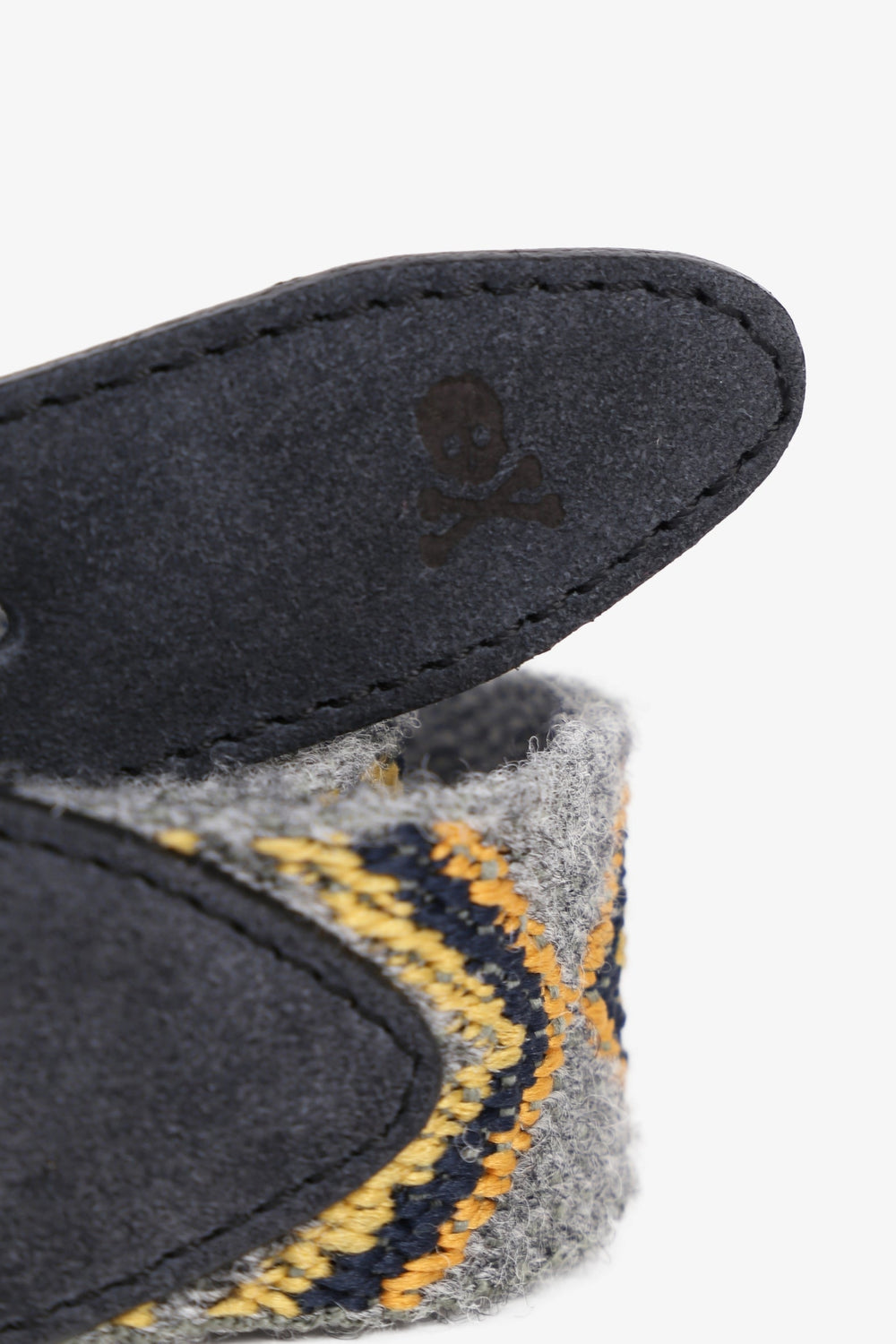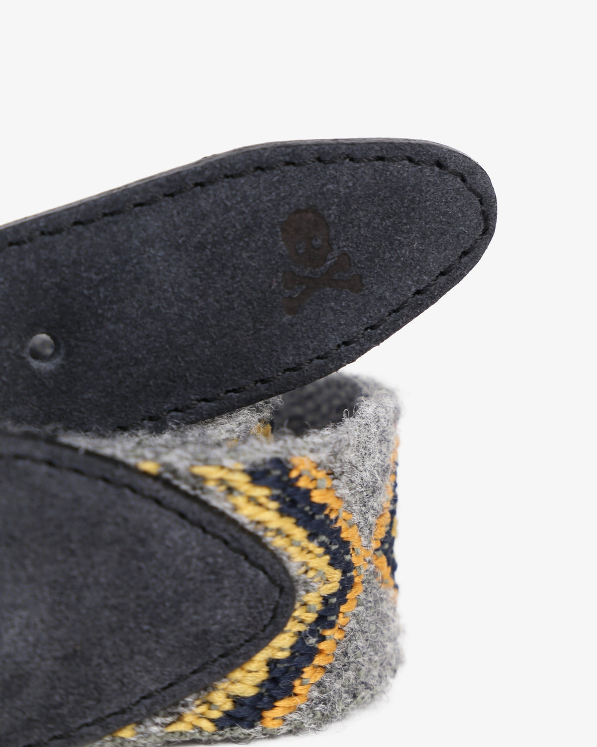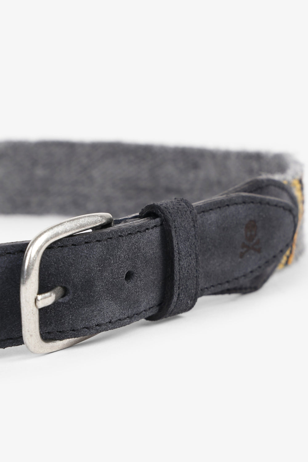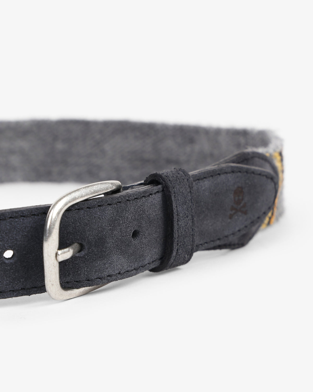 Cinturón estampado confeccionado en tejido de lana merino. Cierre con hebilla metálica y terminaciones en serraje. Pase de 30 mm. Fabricado en España.