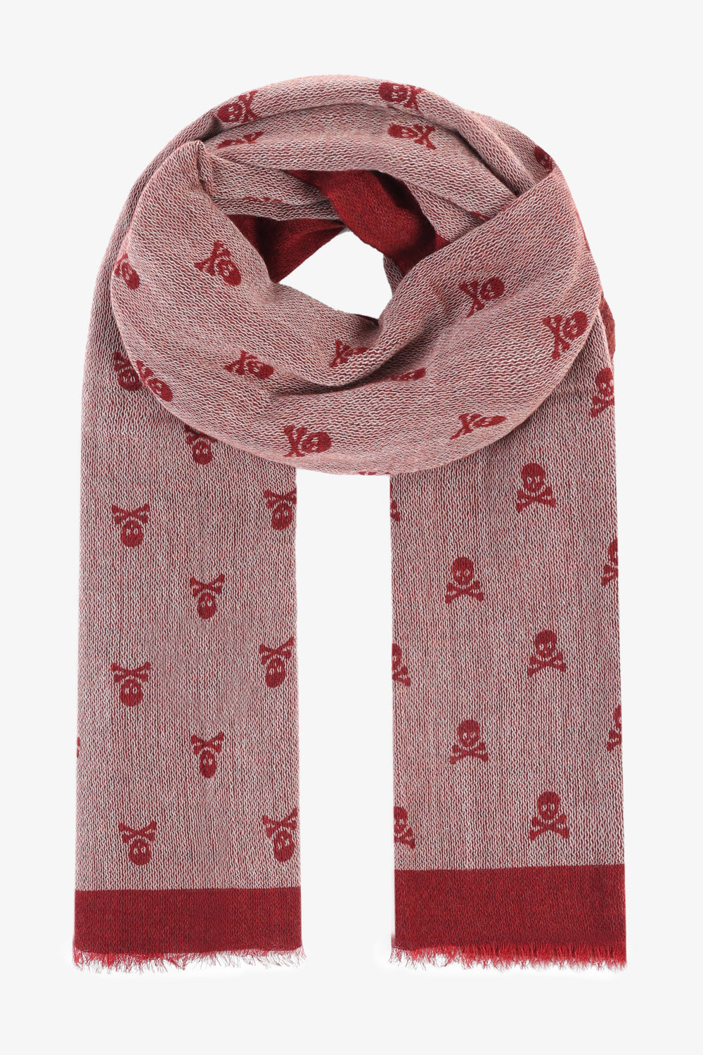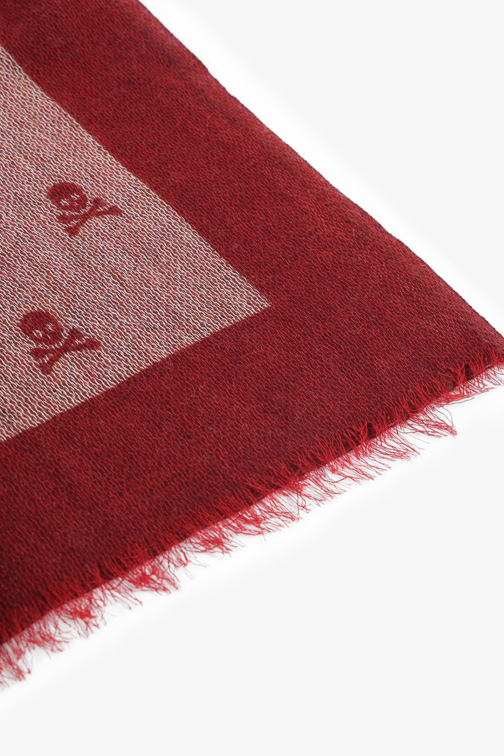 Pashmina con motivo de calaveras all over confeccionada en tejido de lana a través de procesos manuales. Detalle de flecos cortos.