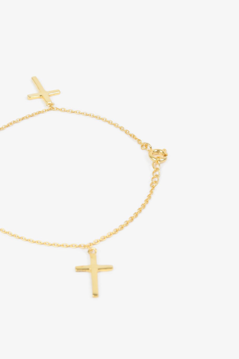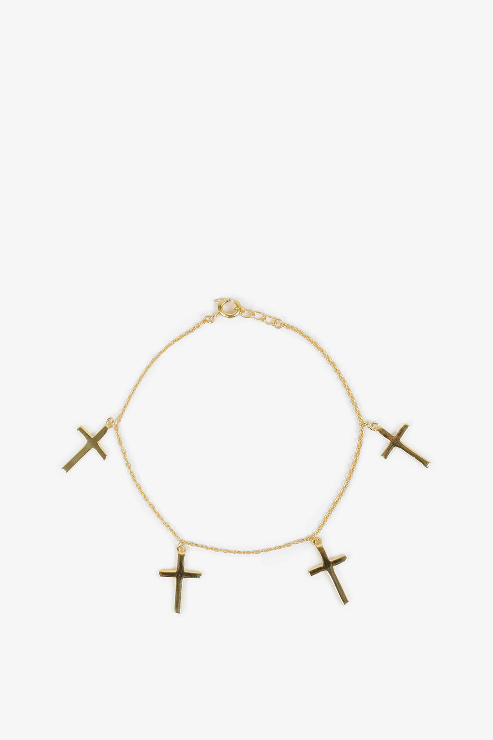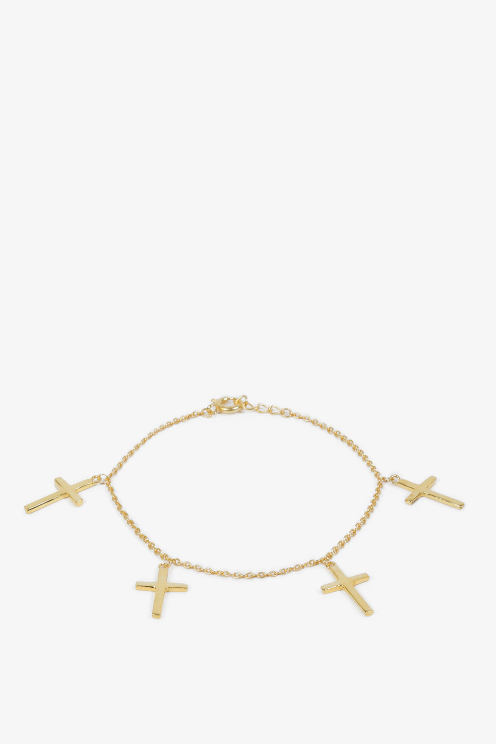 Pulsera de cadena de bronce bañada en oro de 18k. Cierre con mosquetón y cruces.