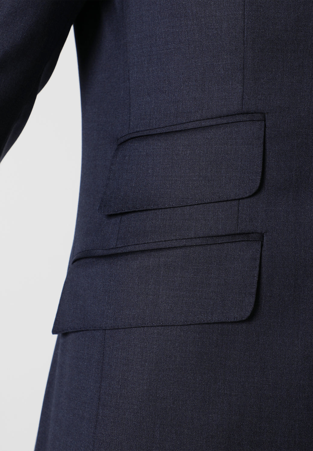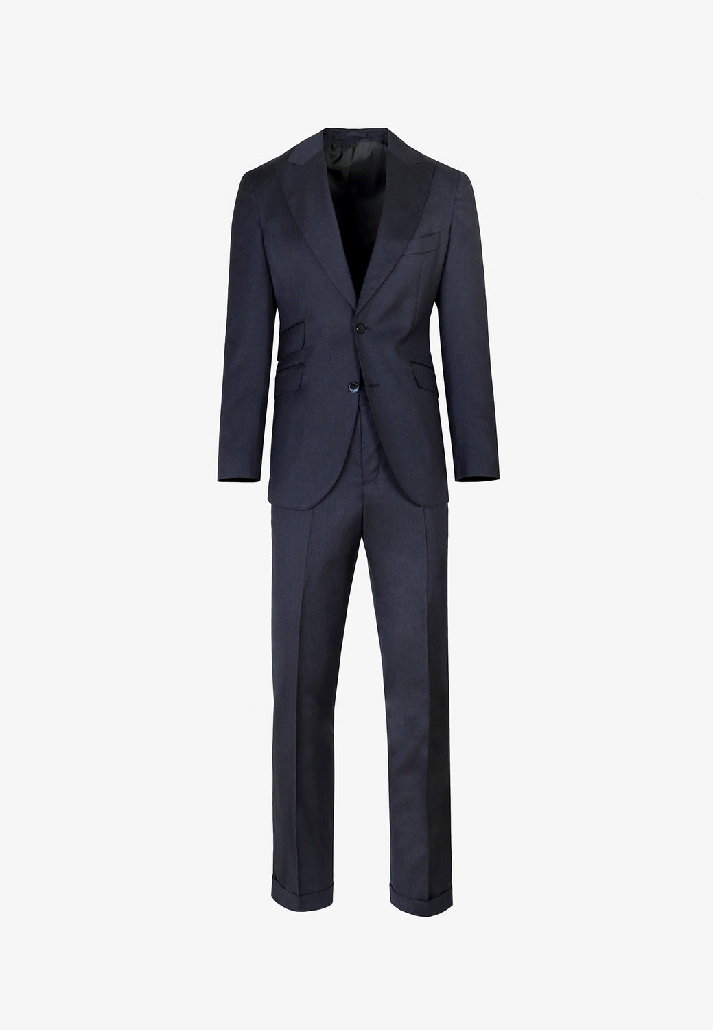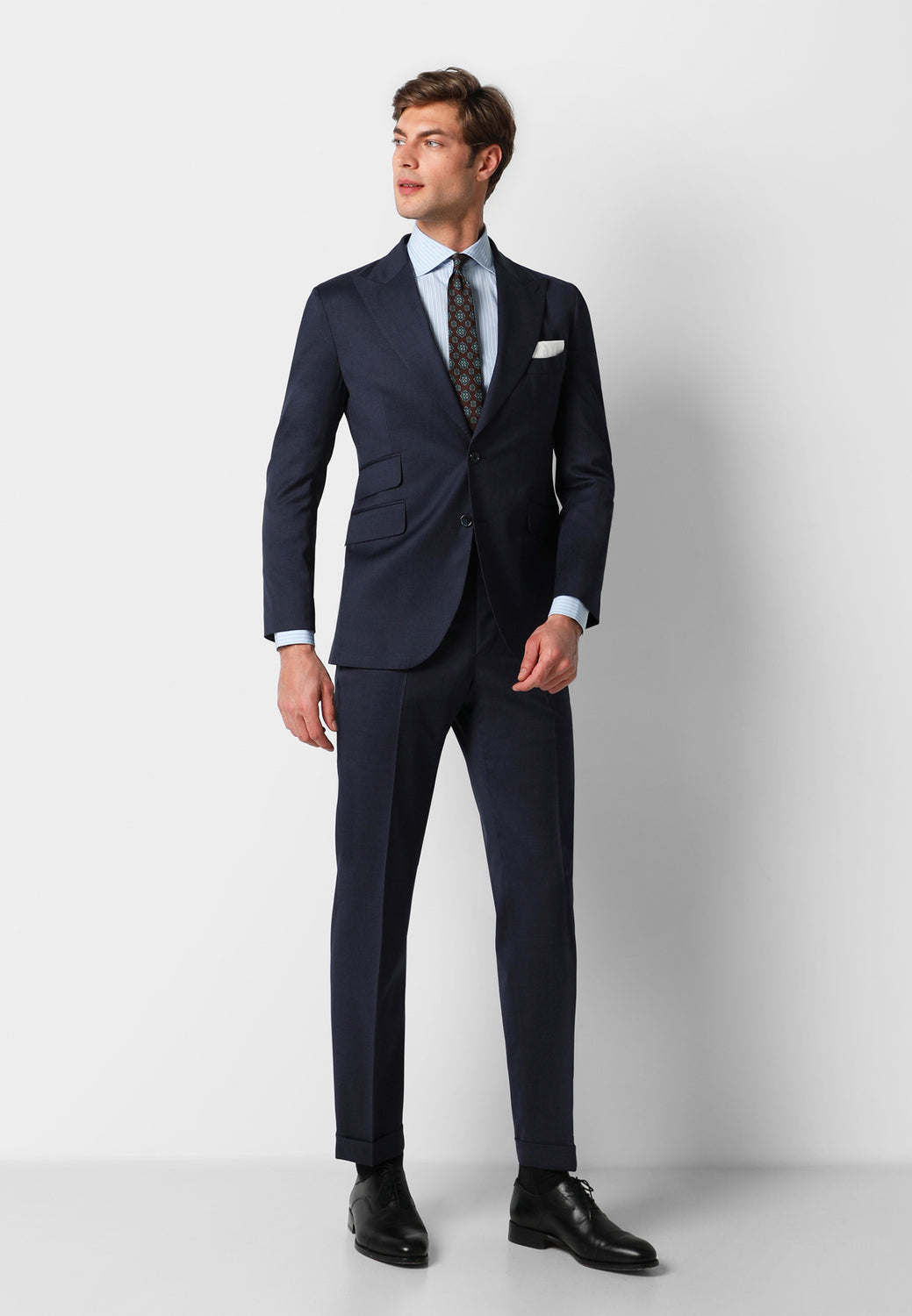 Traje confeccionado en tejido mezcla de lana. Blazer con corte Regular Fit, cuello con solapas punta de lanza y cierre con botones. Manga larga terminada en puño con botones y bolsillos con tapeta e insertado. Pantalón recto con cierre que prolonga en cinturilla y cremallera. Bolsillos laterales.