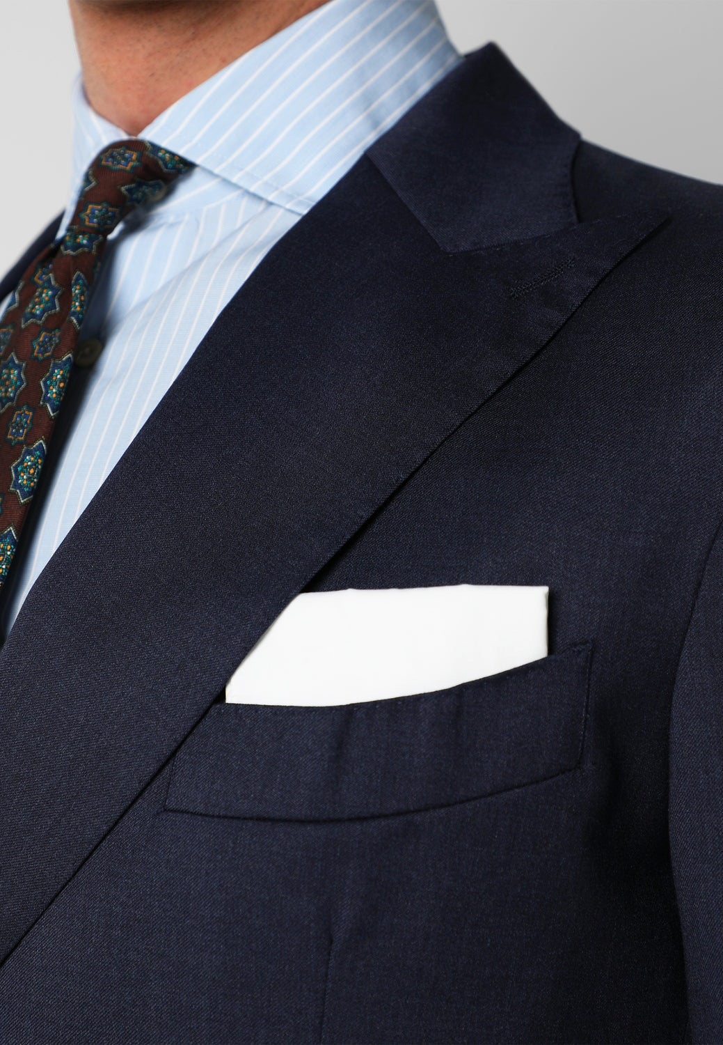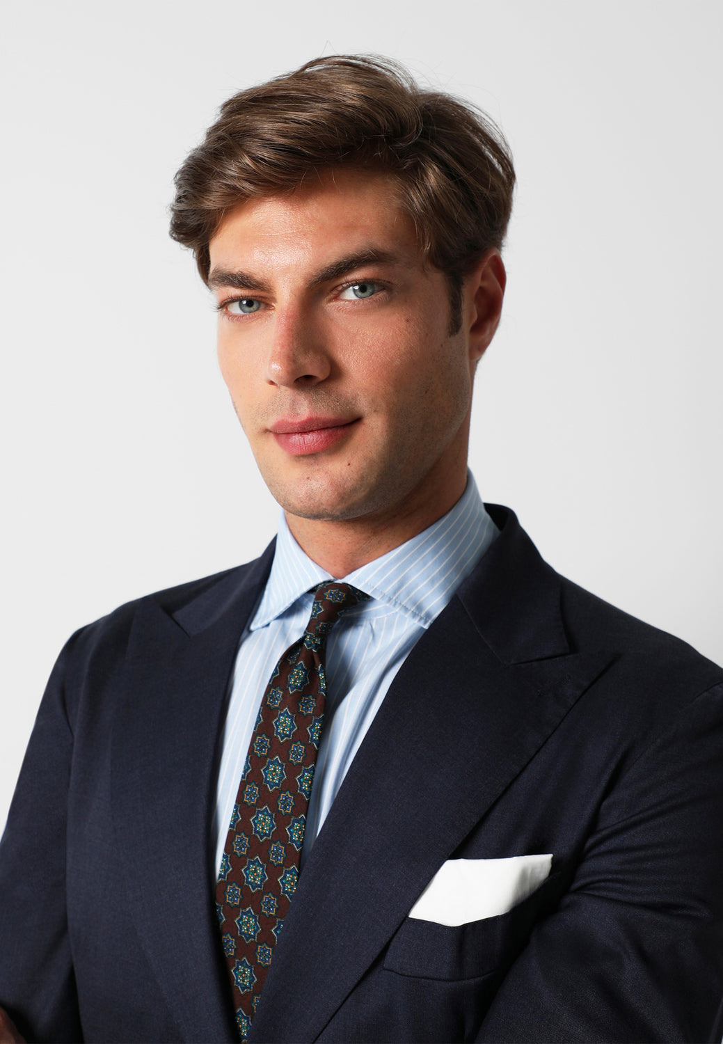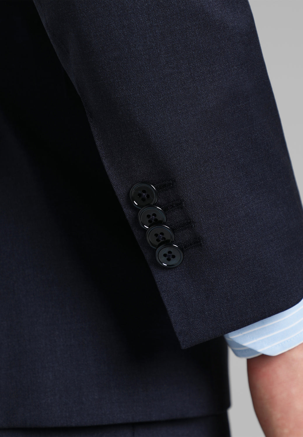 Traje confeccionado en tejido mezcla de lana. Blazer con corte Regular Fit, cuello con solapas punta de lanza y cierre con botones. Manga larga terminada en puño con botones y bolsillos con tapeta e insertado. Pantalón recto con cierre que prolonga en cinturilla y cremallera. Bolsillos laterales.