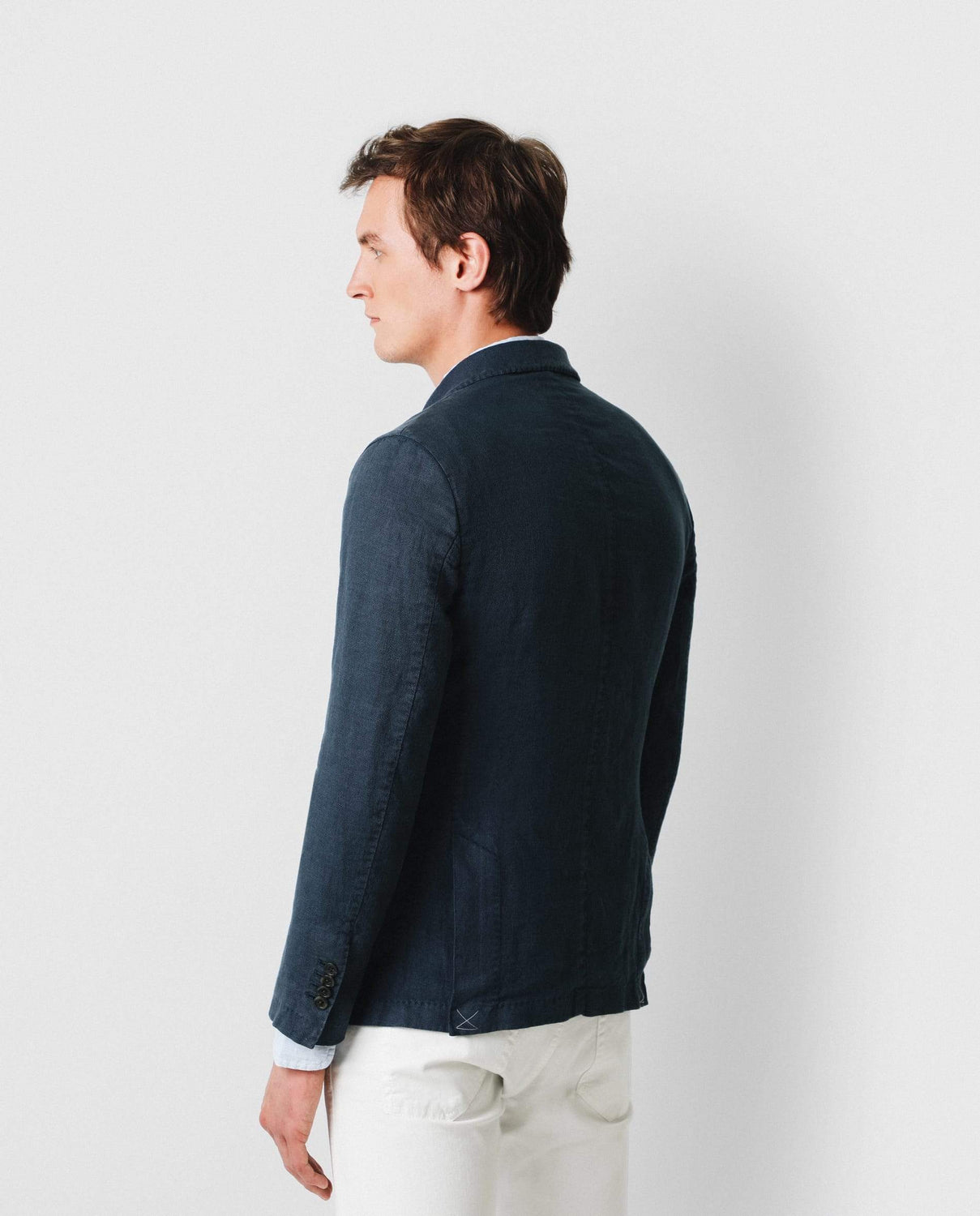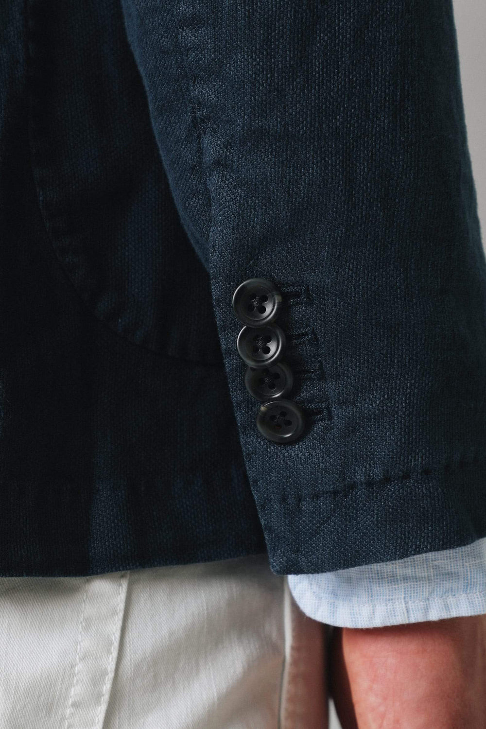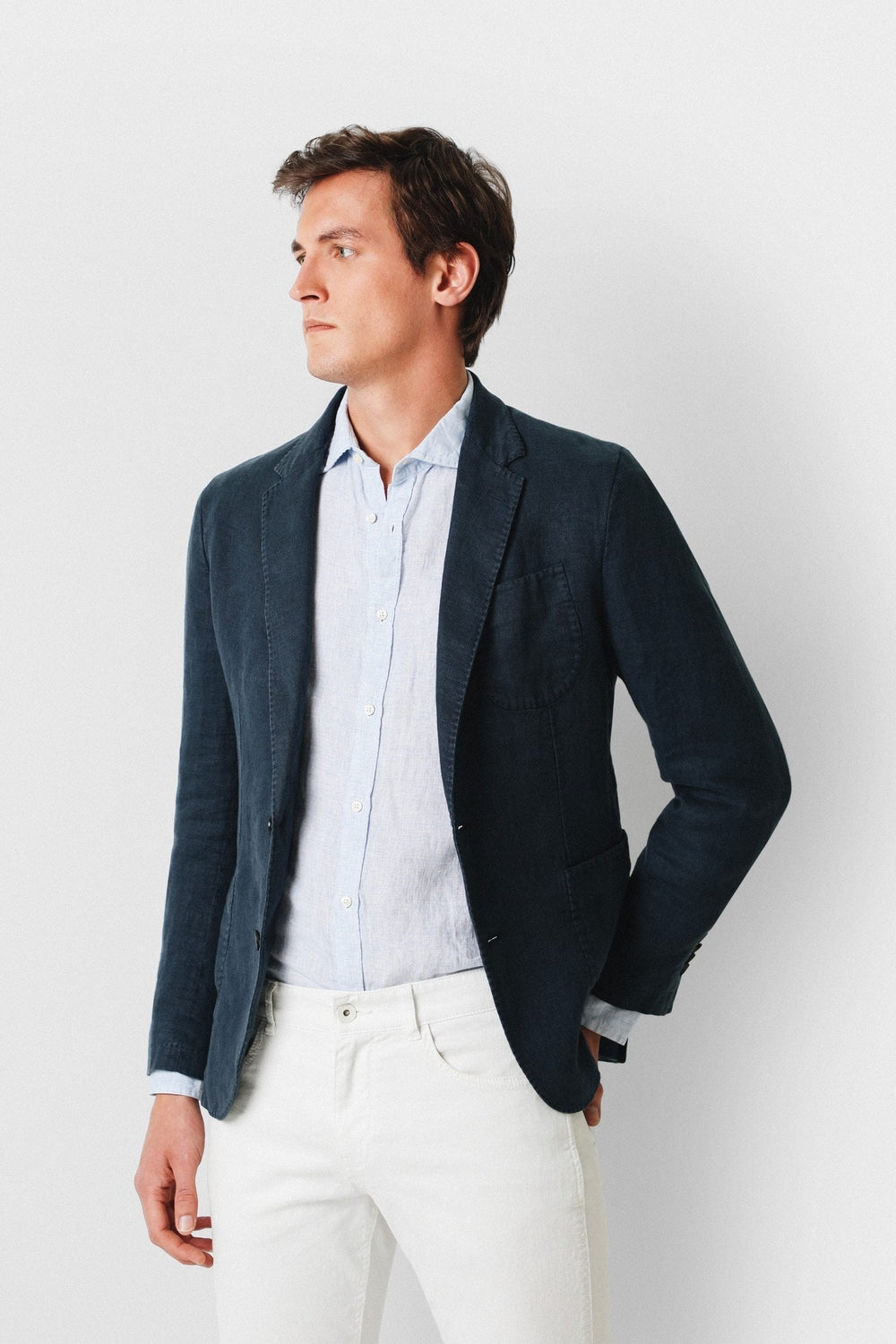Americana confeccionada en tejido 100% lino. Corte Slim Fit, cuello con solapas de muesca y ojal y cierre con dos botones. Manga larga terminada en puño de cuatro botones y bolsillos delanteros. Aberturas traseras y bolsillos interiores.