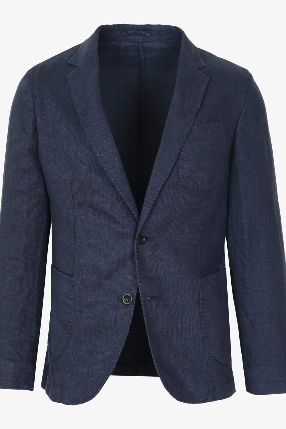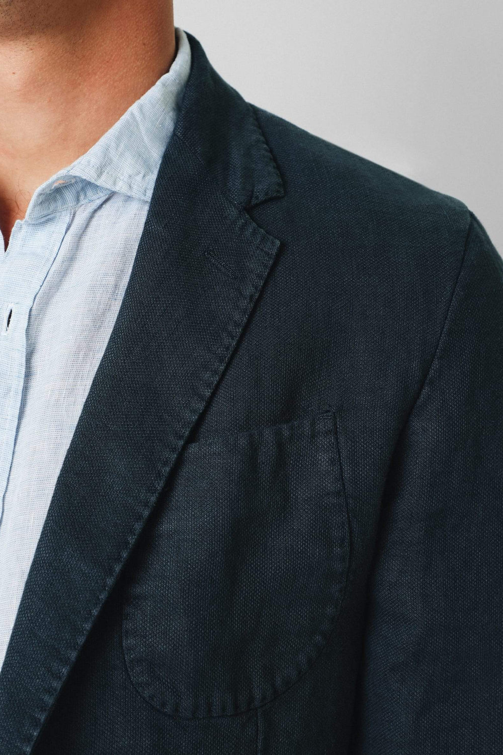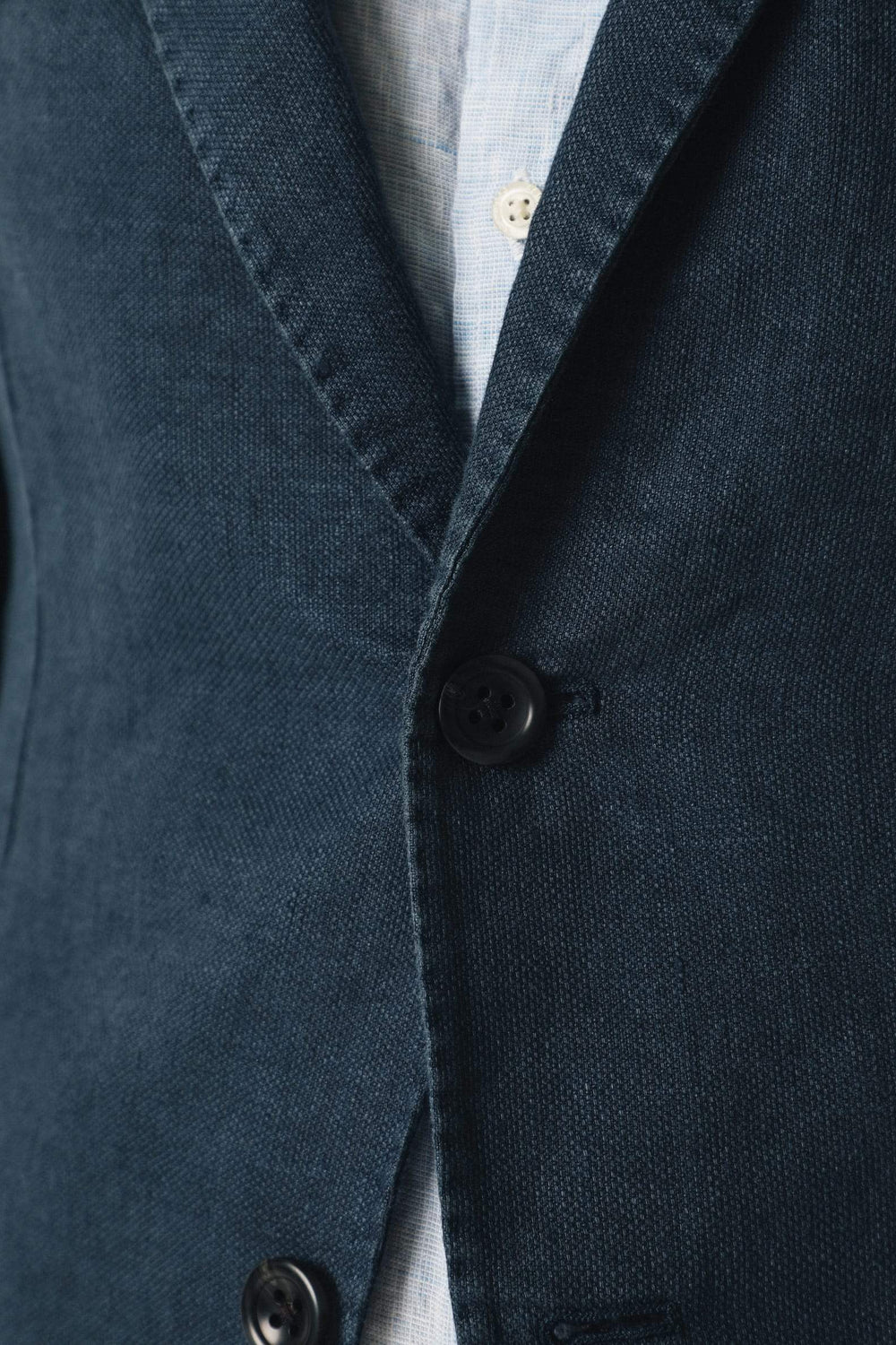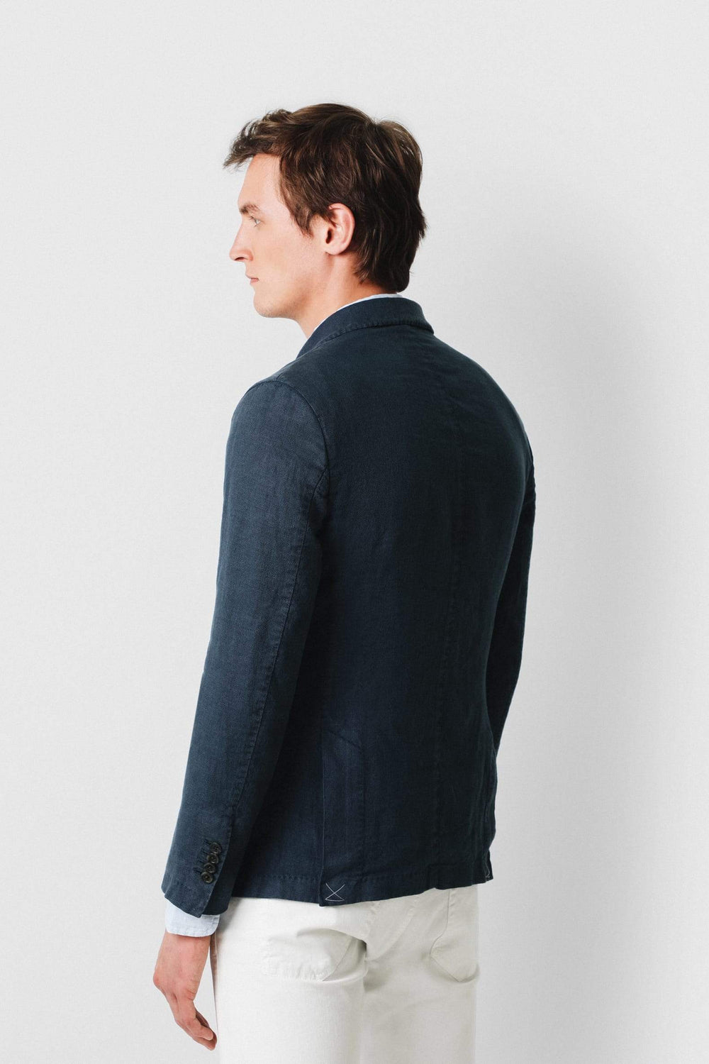 Americana confeccionada en tejido 100% lino. Corte Slim Fit, cuello con solapas de muesca y ojal y cierre con dos botones. Manga larga terminada en puño de cuatro botones y bolsillos delanteros. Aberturas traseras y bolsillos interiores.