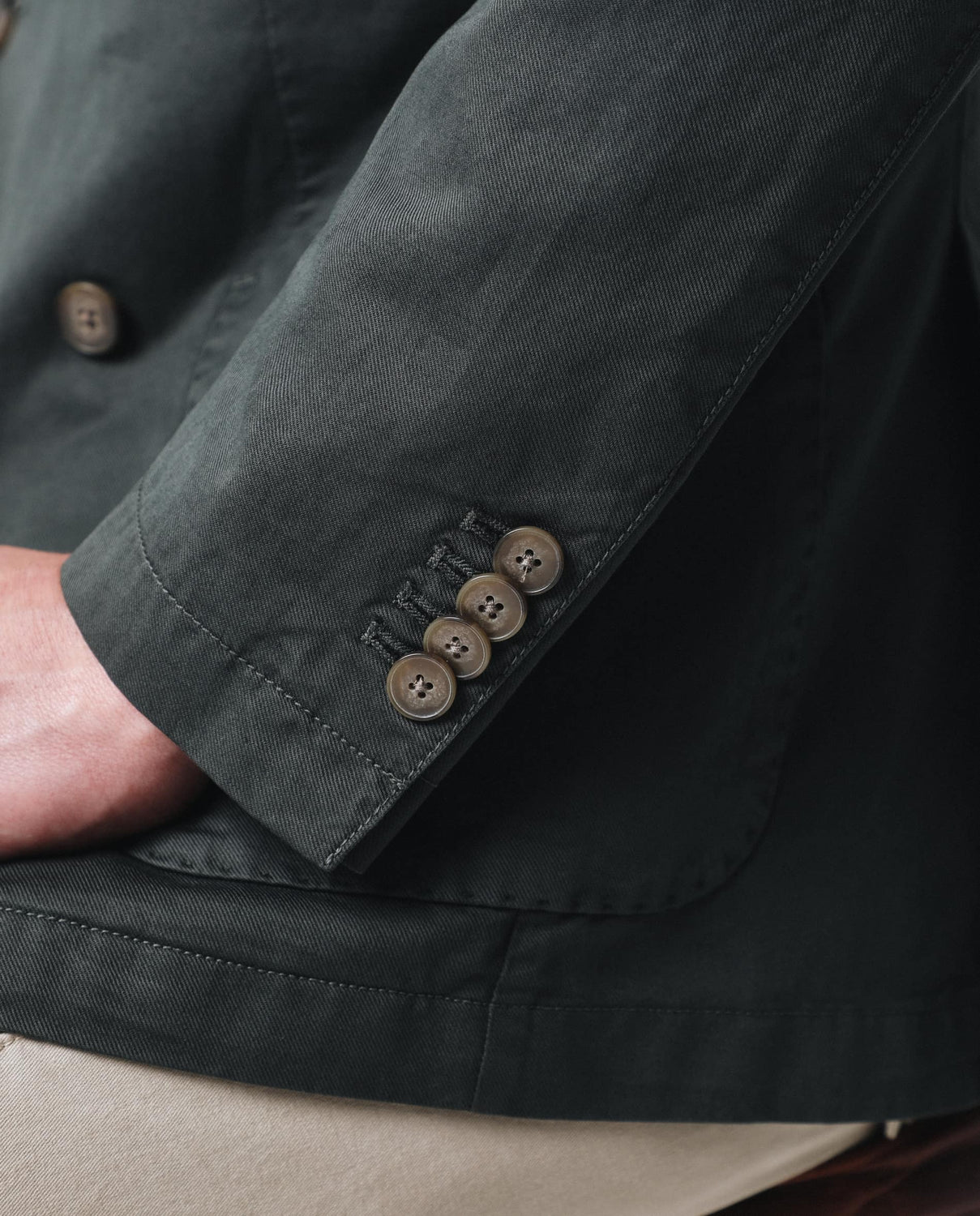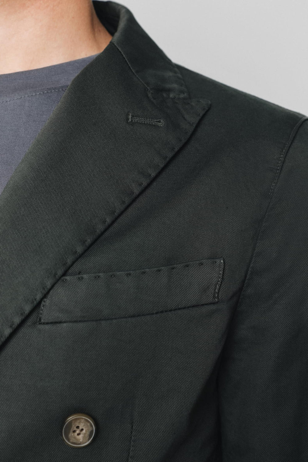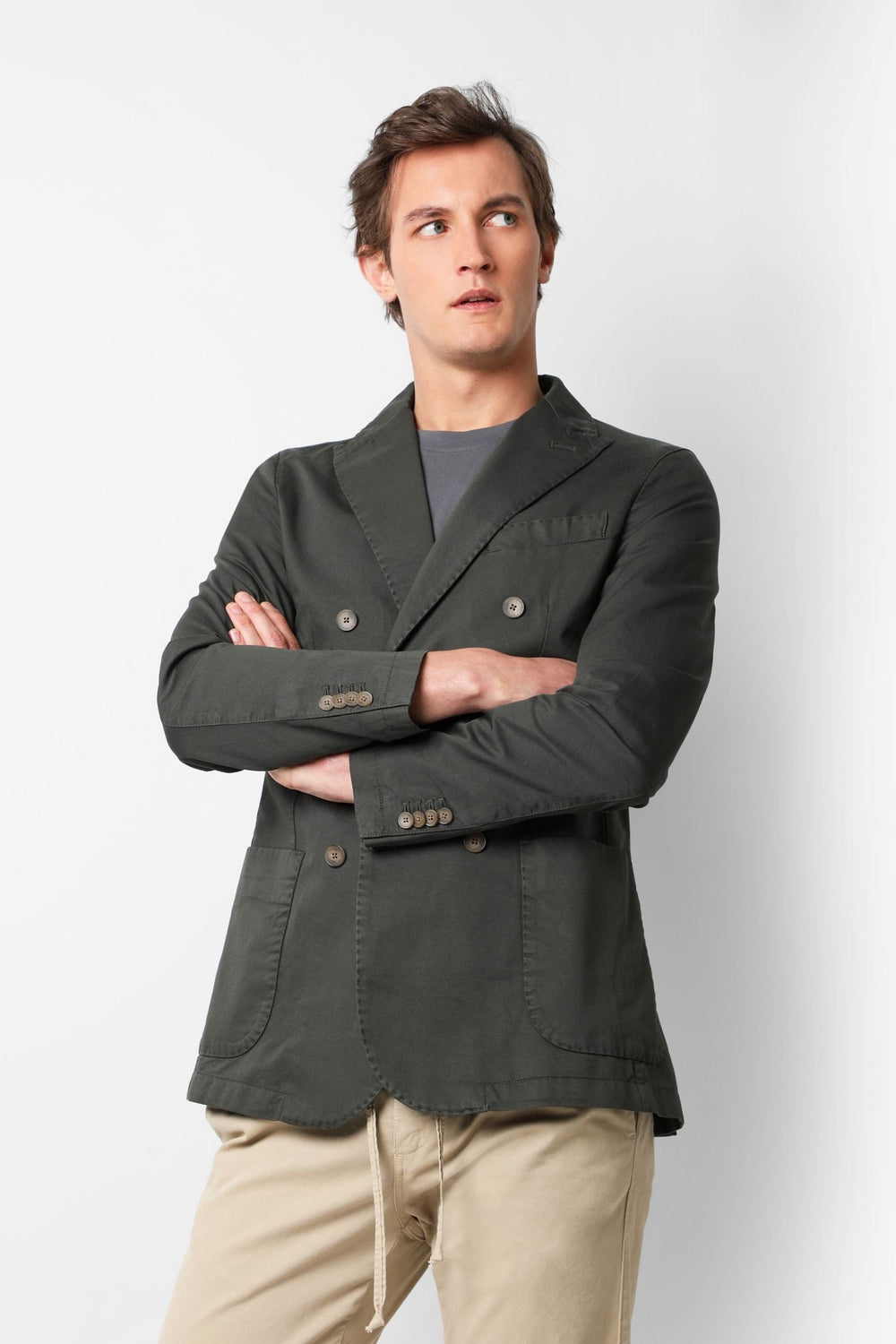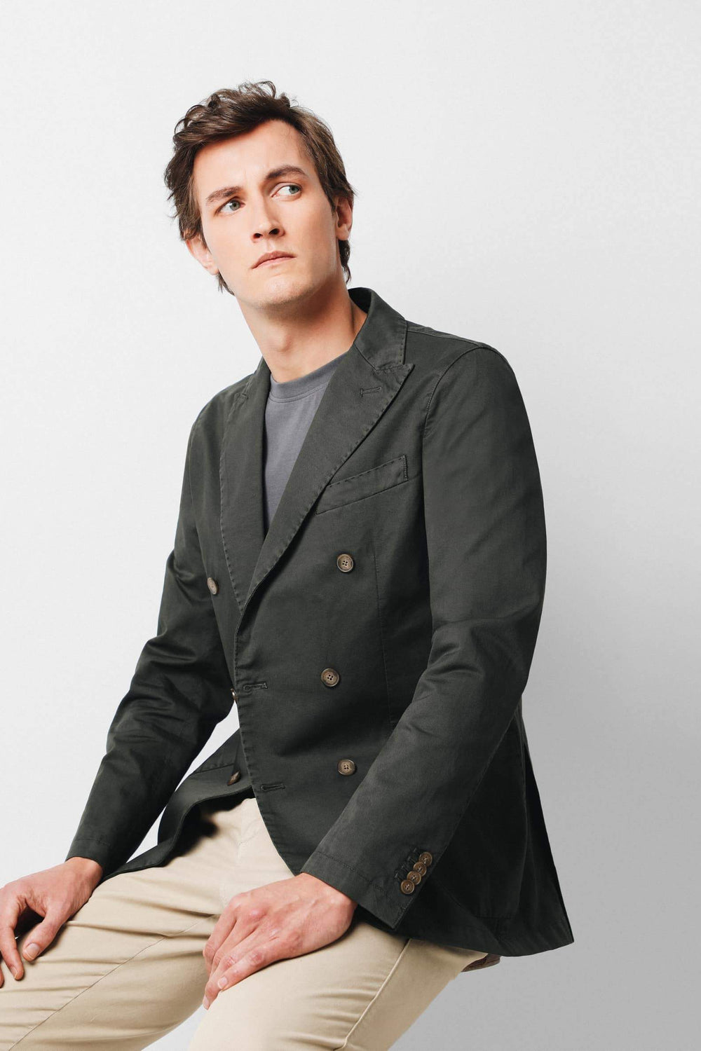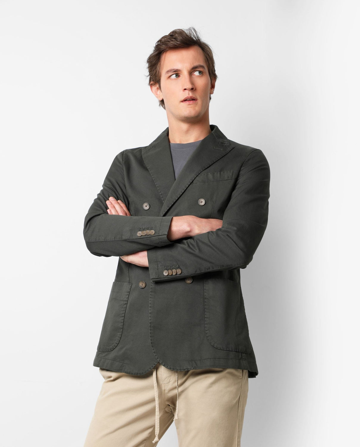 Americana confeccionada en tejido de algodón y lino. Corte Slim Fit, cuello con solapa punta de lanza y cierre con botones cruzado. Manga larga terminada en botones y bolsillos de plastrón.