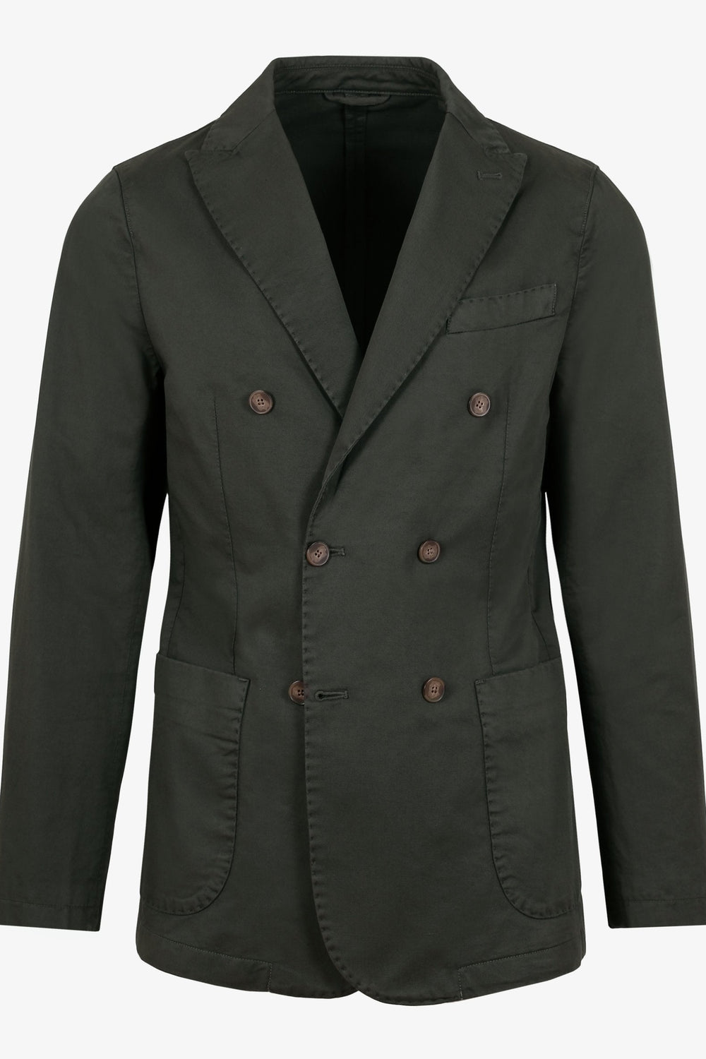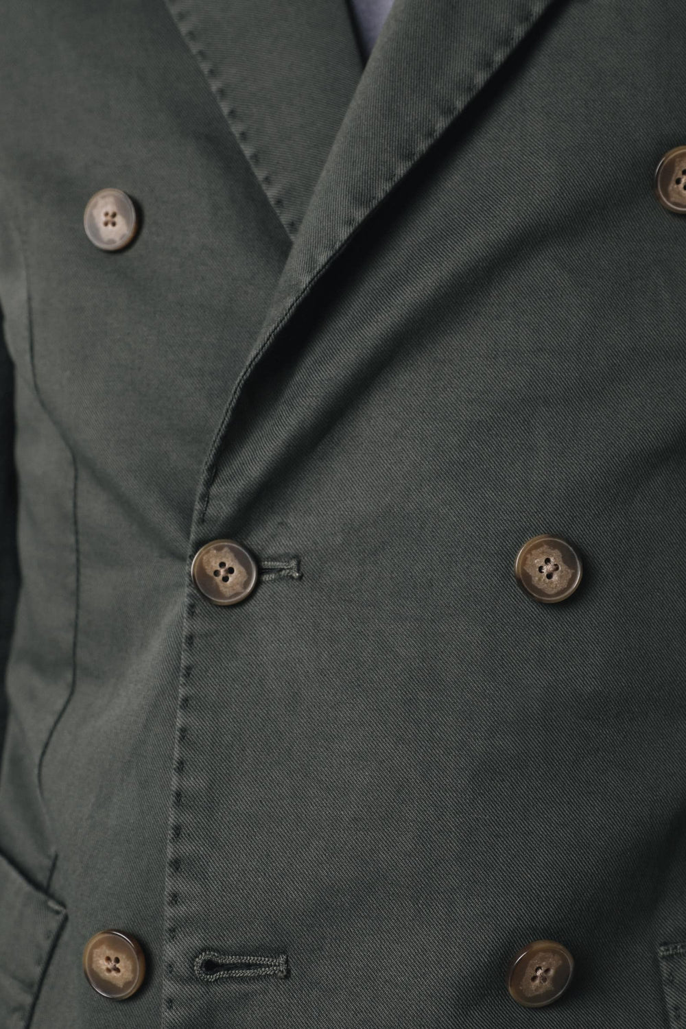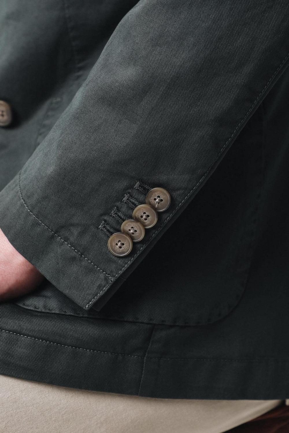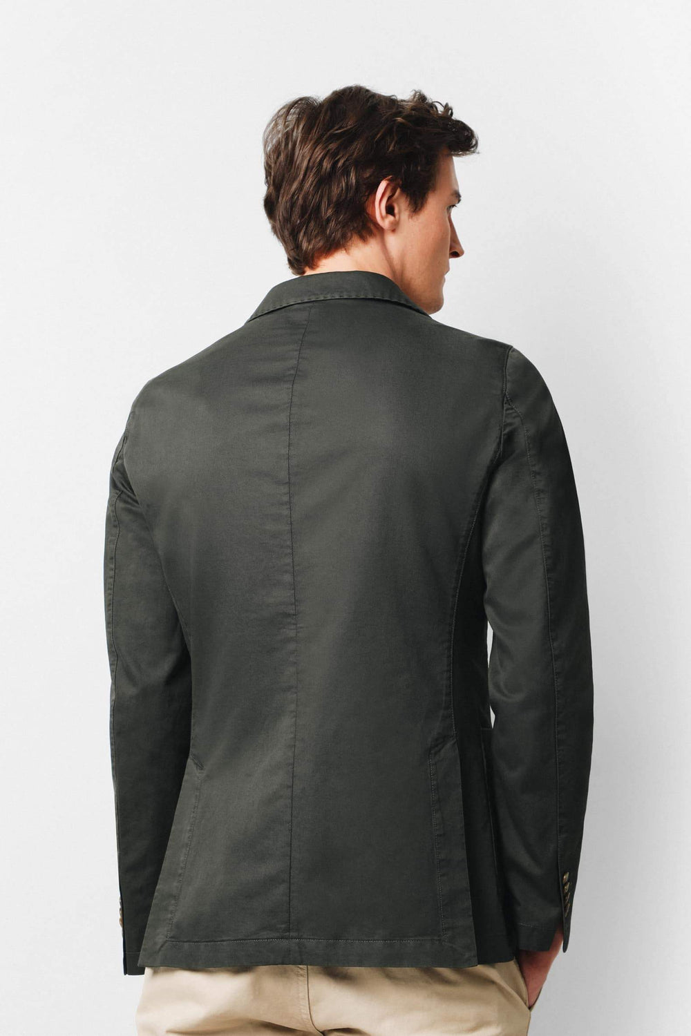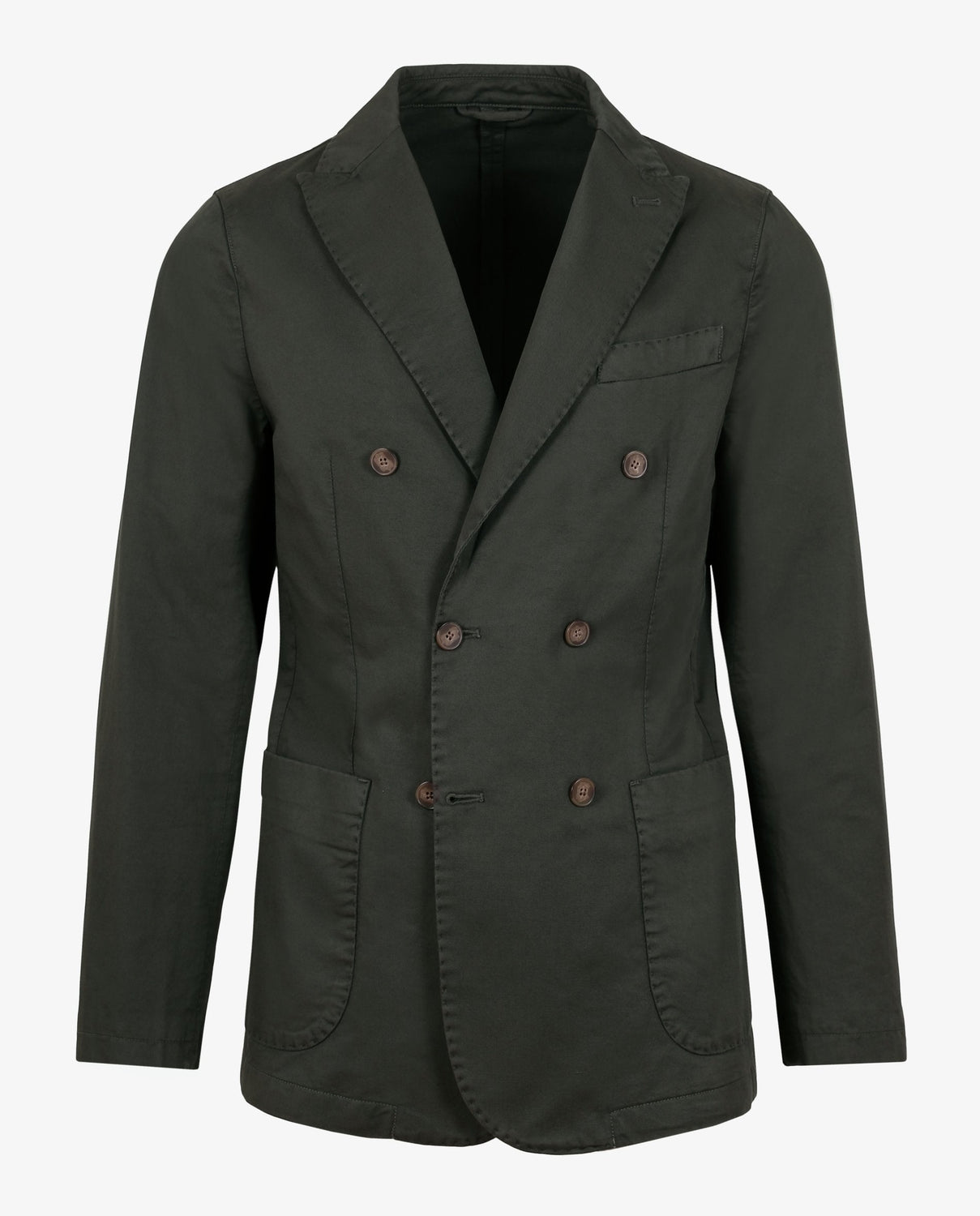 Americana confeccionada en tejido de algodón y lino. Corte Slim Fit, cuello con solapa punta de lanza y cierre con botones cruzado. Manga larga terminada en botones y bolsillos de plastrón.