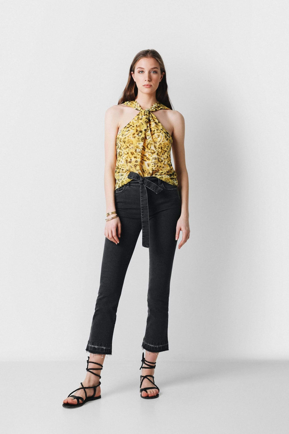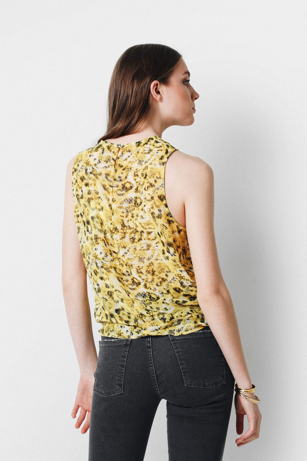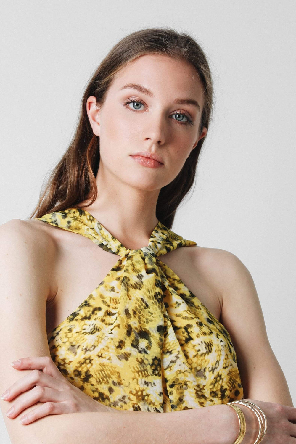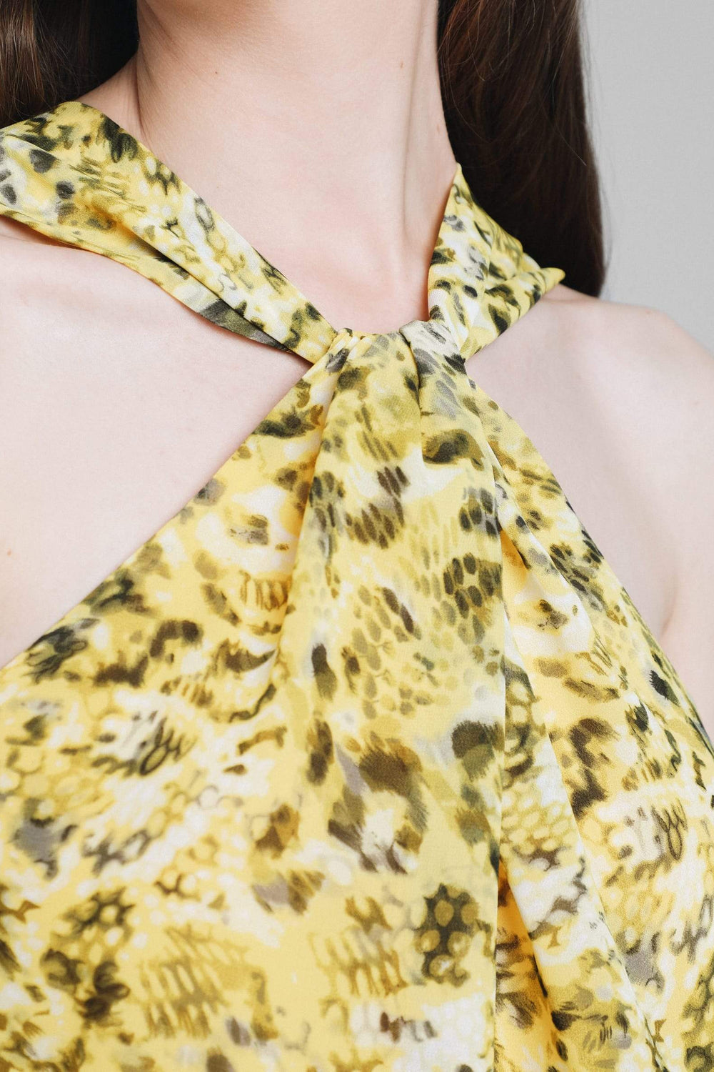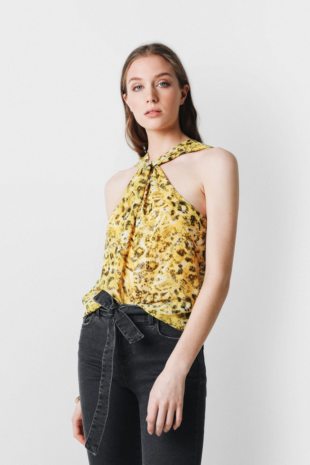 Top con estampado de serpiente. Corte Slim Fit, cuello con escote halter y cierre trasero con botón.