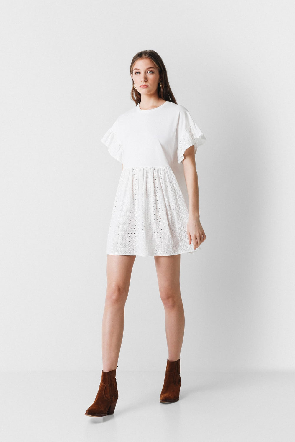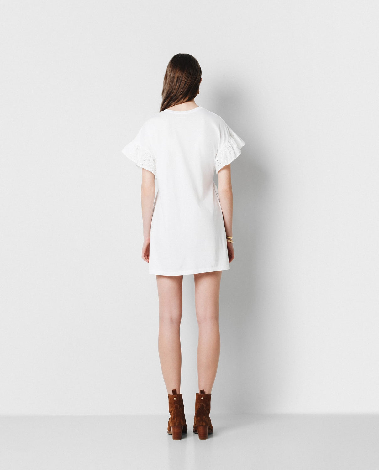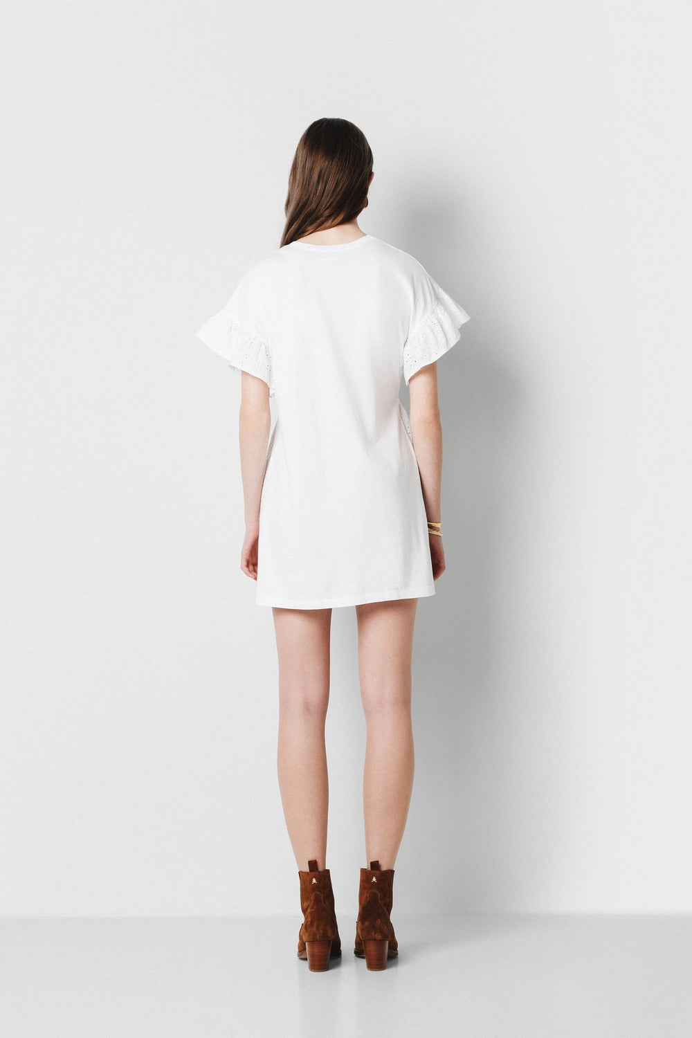 Vestido confeccionado en tejido 100% algodón. Corte oversize, cuello redondo y manga corta. Bordado inglés en mangas y bajo.