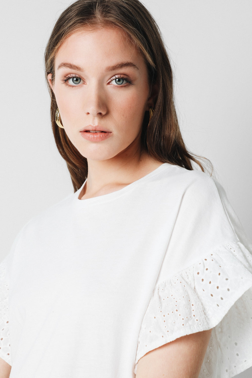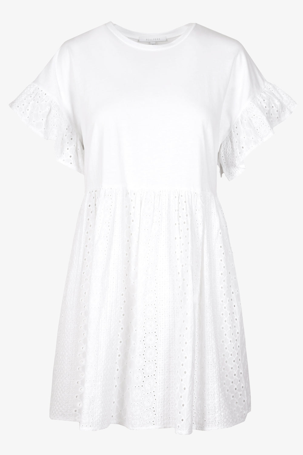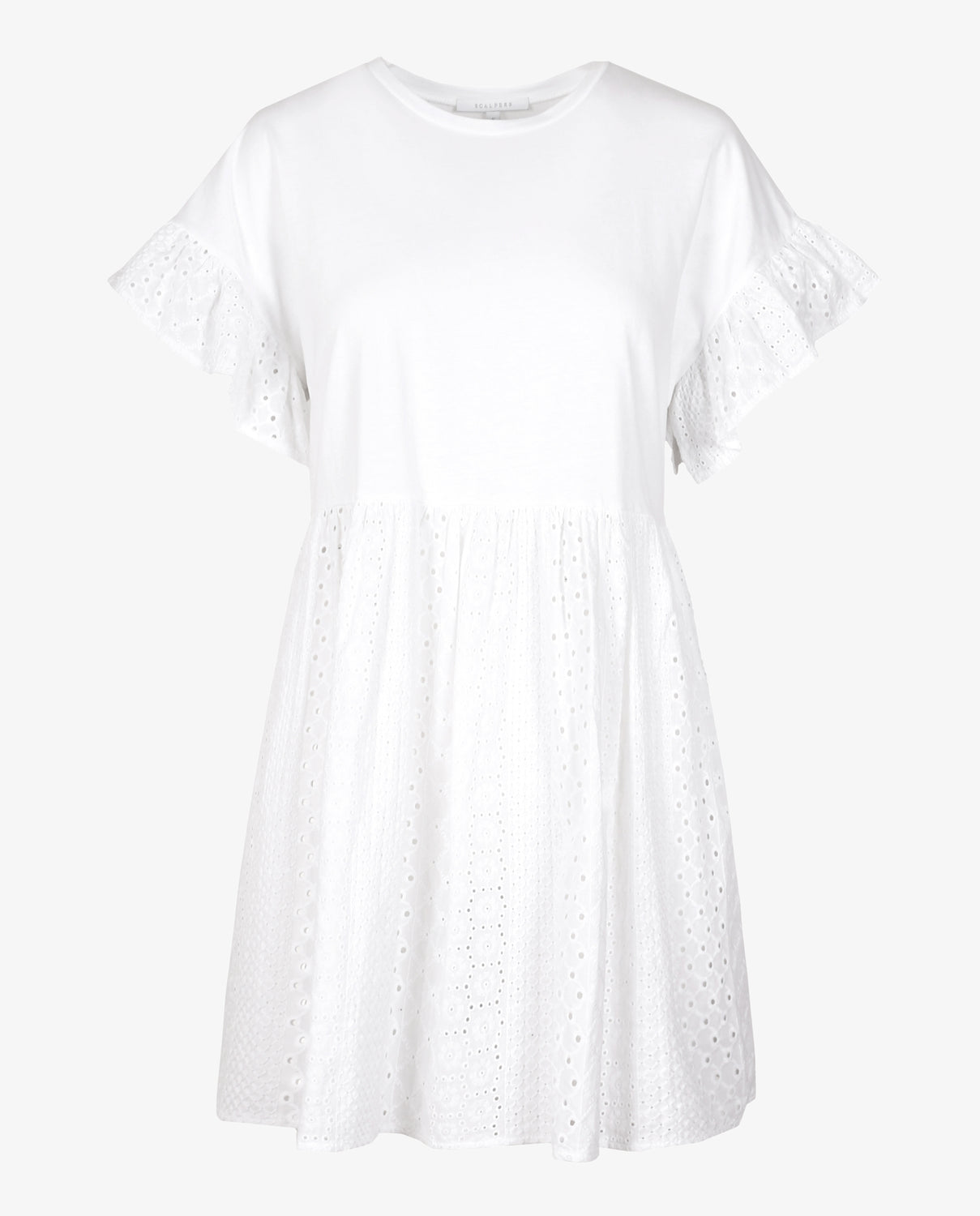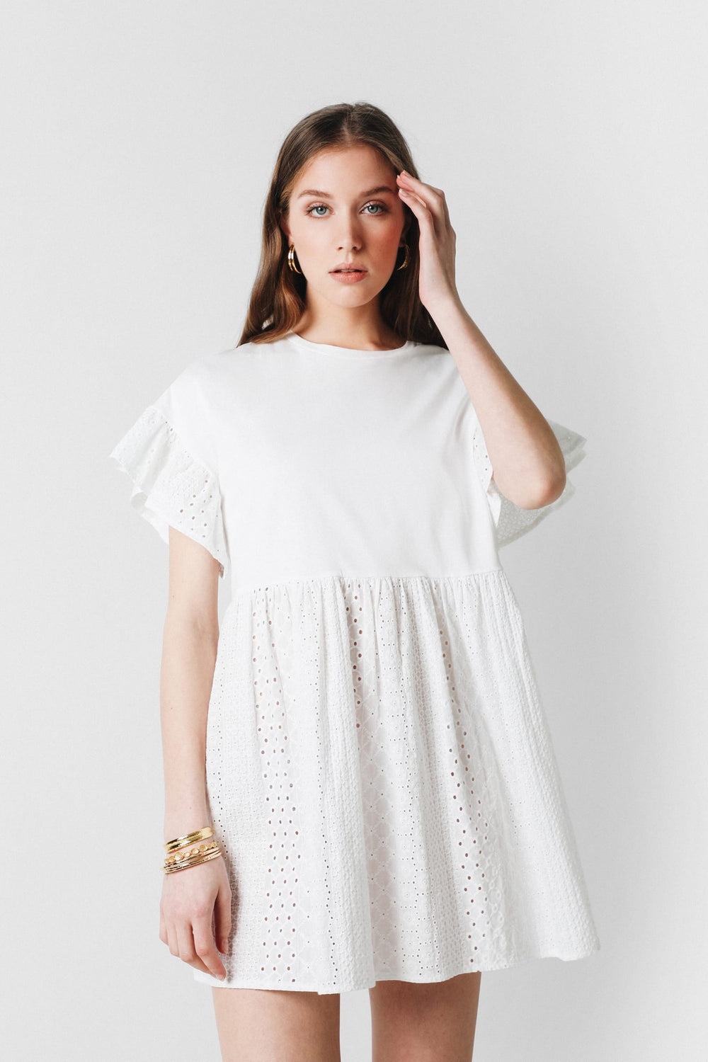 Vestido confeccionado en tejido 100% algodón. Corte oversize, cuello redondo y manga corta. Bordado inglés en mangas y bajo.