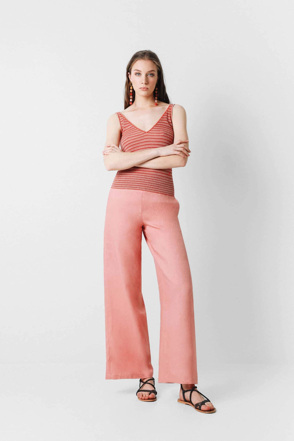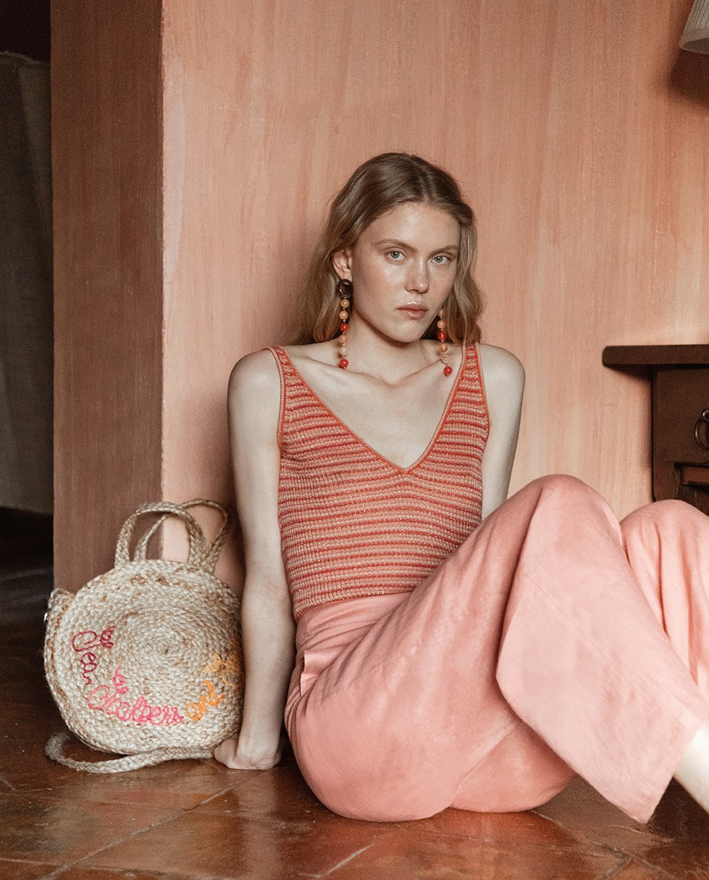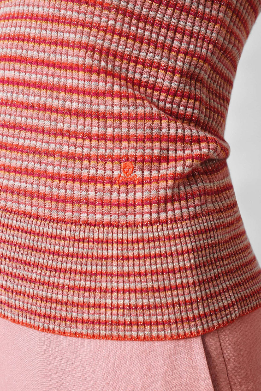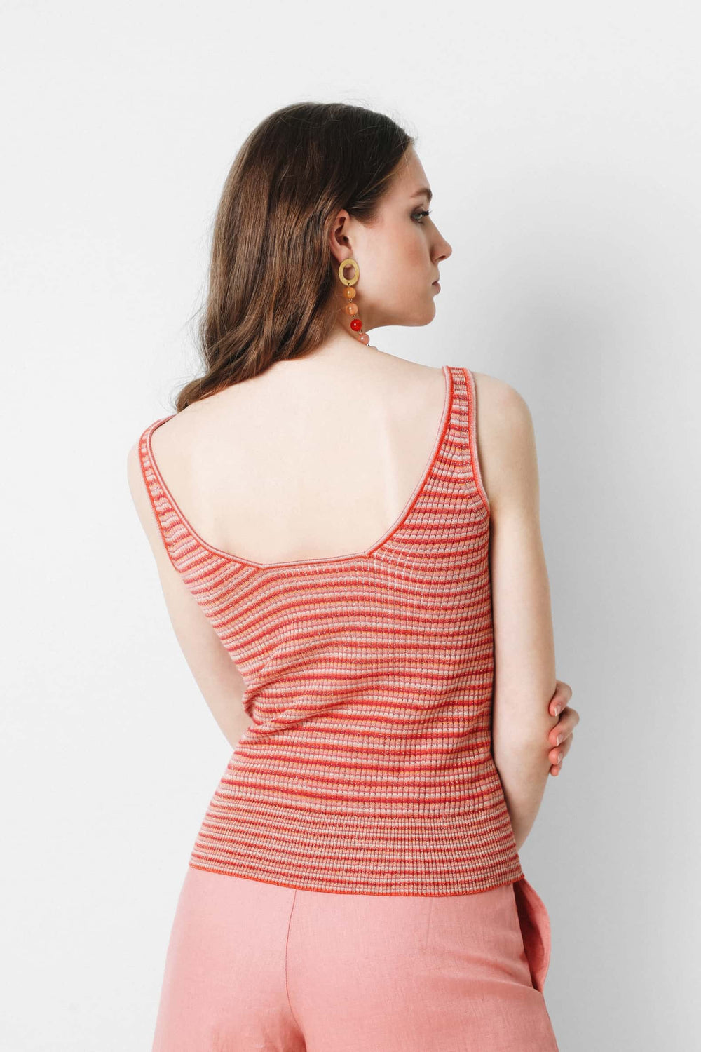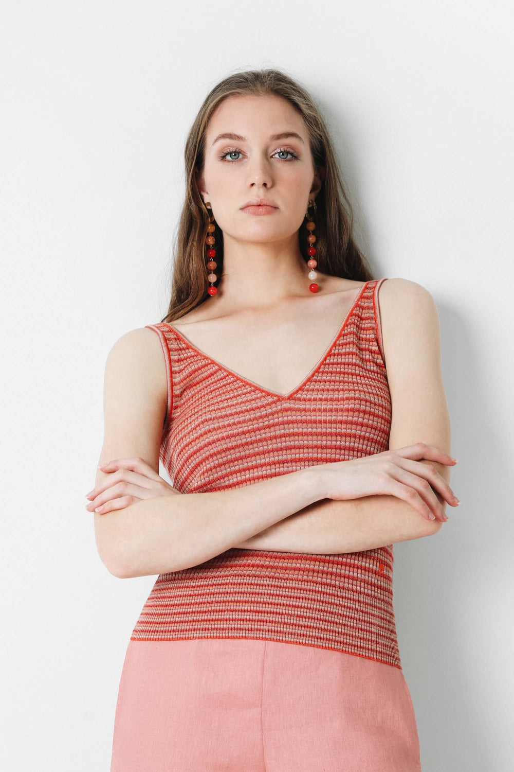Top confeccionado en punto con hilos metálicos. Corte Slim Fit, cuello de pico y tirantes.
