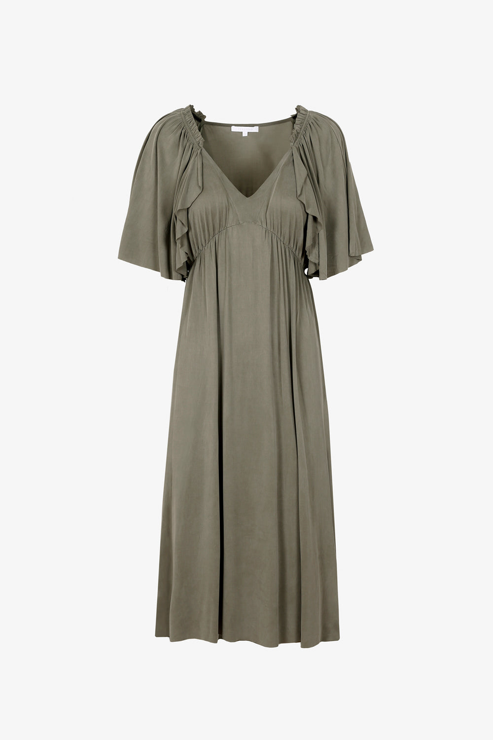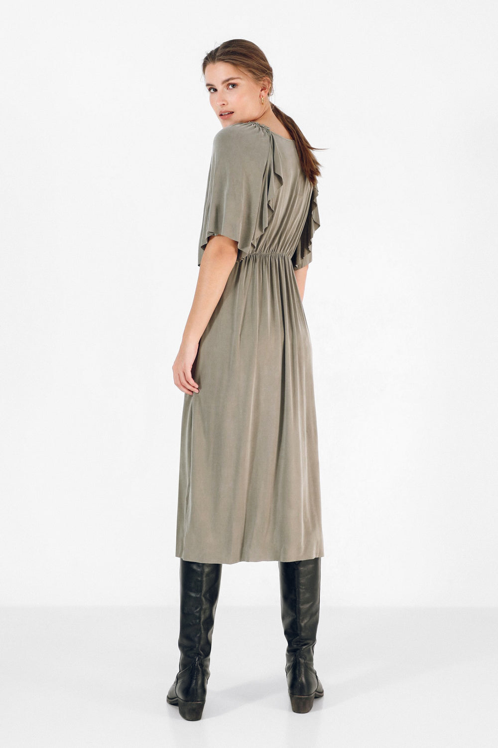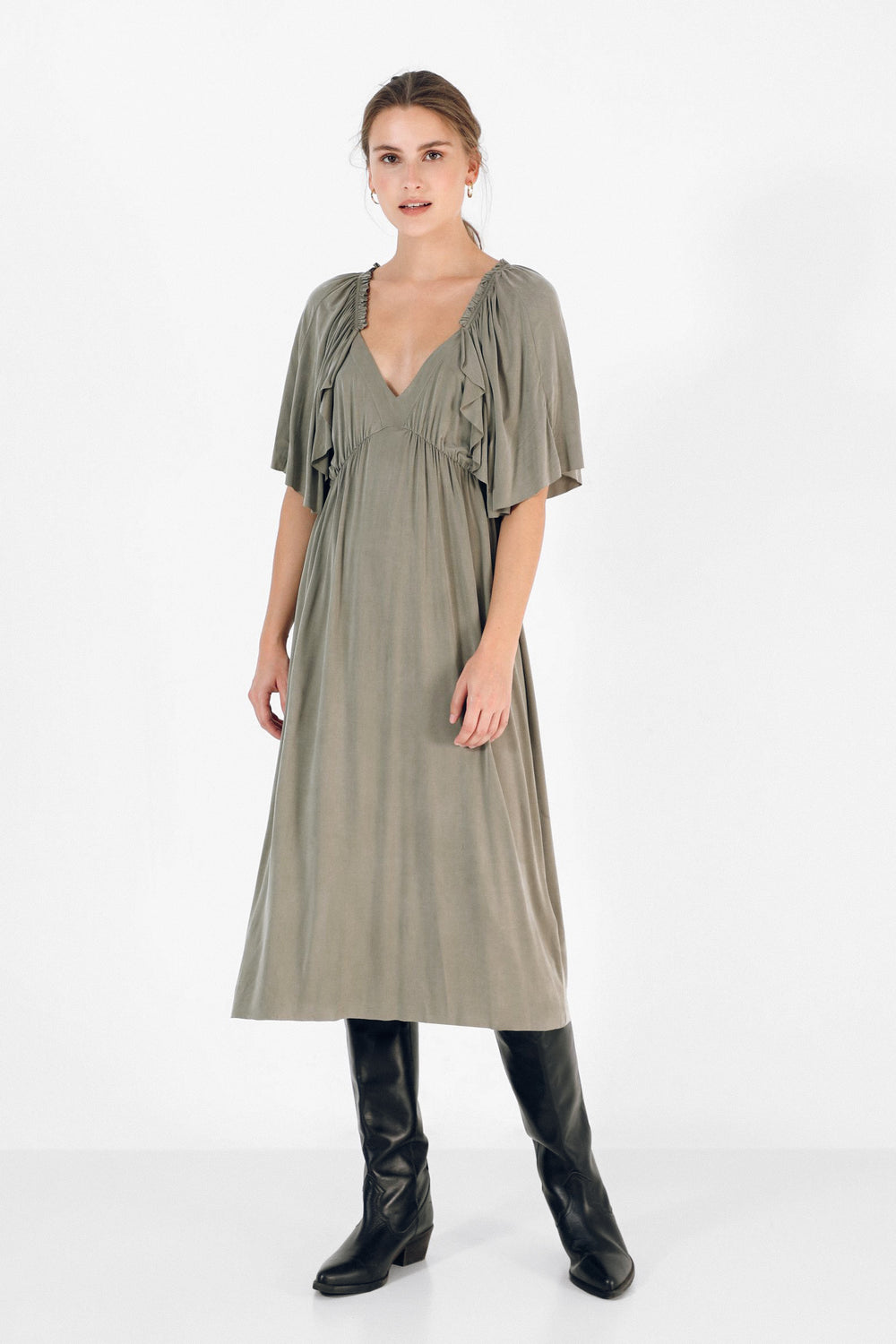 Vestido midi confeccionado en tejido de cupro. Corte en el pecho, cuello con escote de pico y manga corta con detalle de volantes.