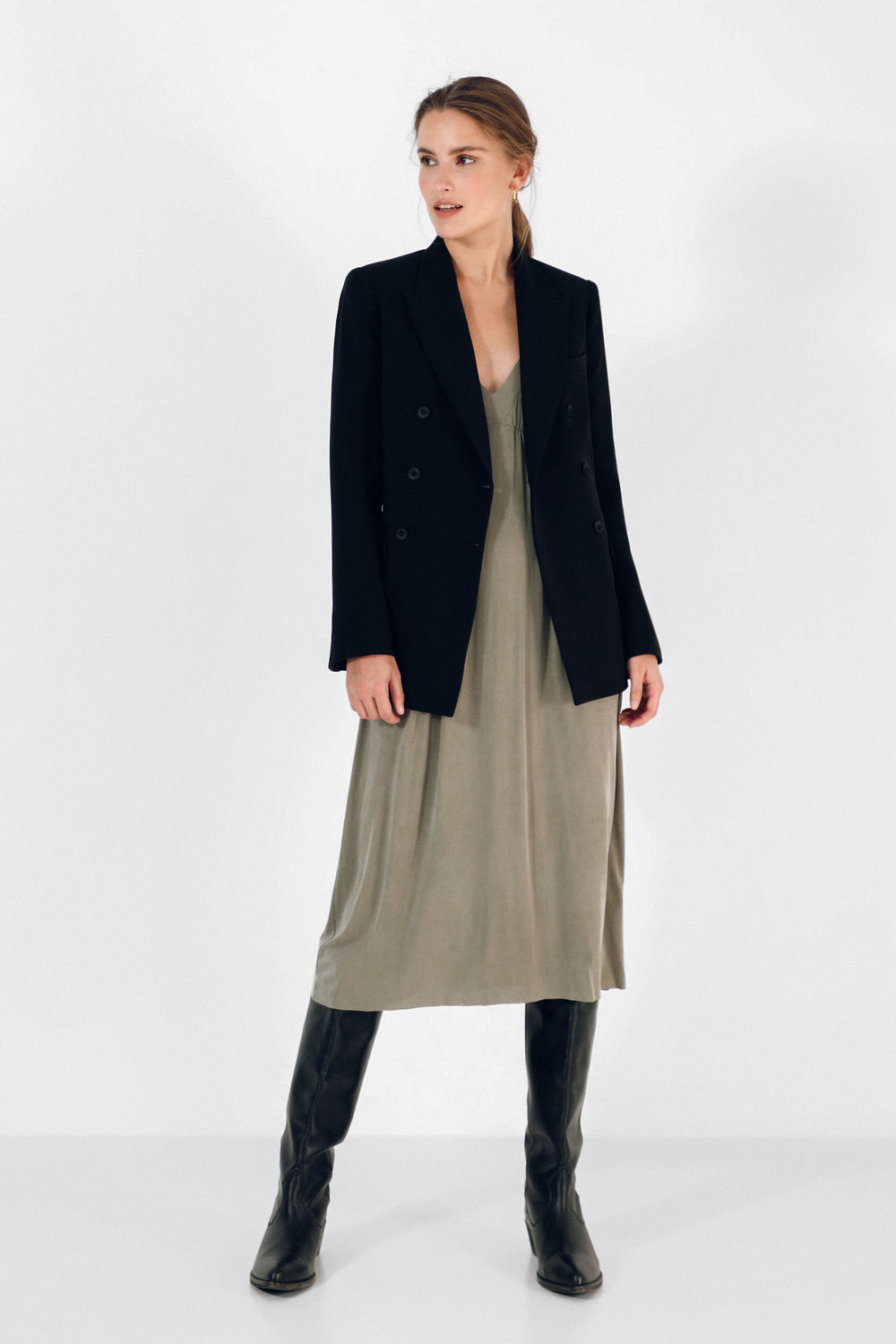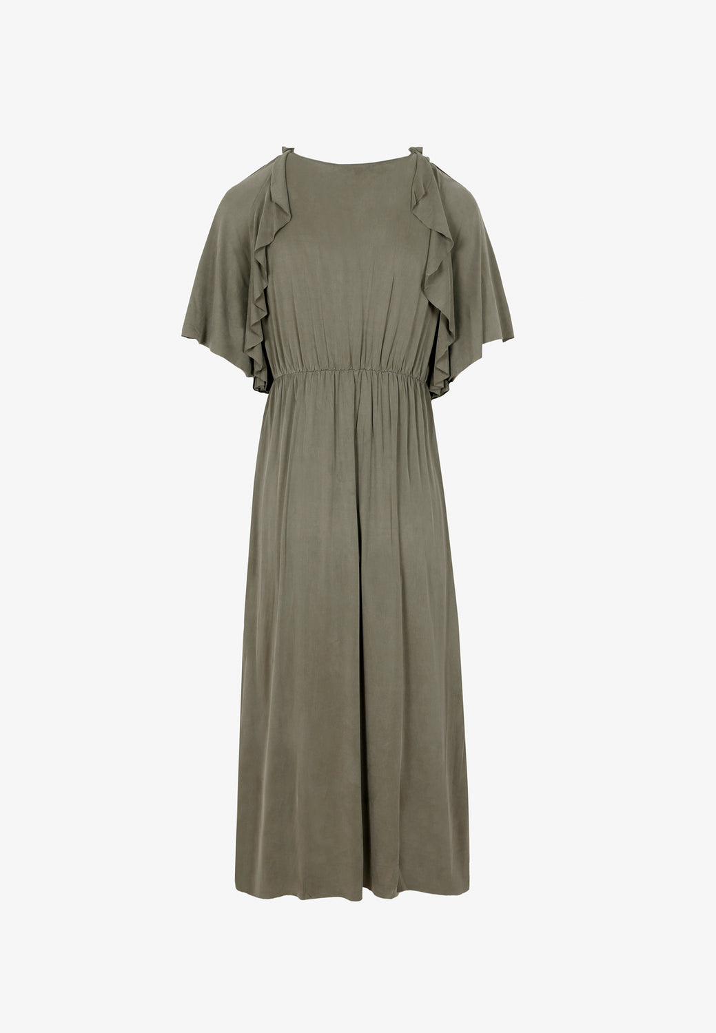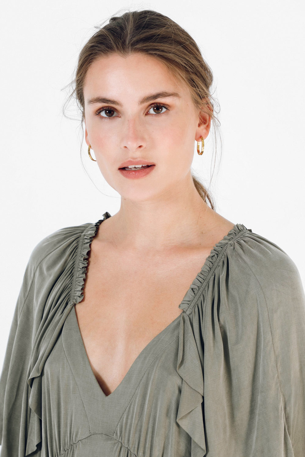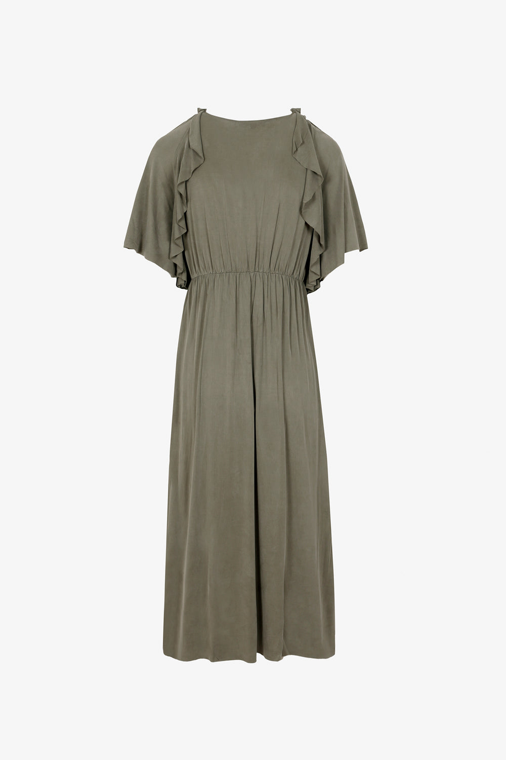 Vestido midi confeccionado en tejido de cupro. Corte en el pecho, cuello con escote de pico y manga corta con detalle de volantes.