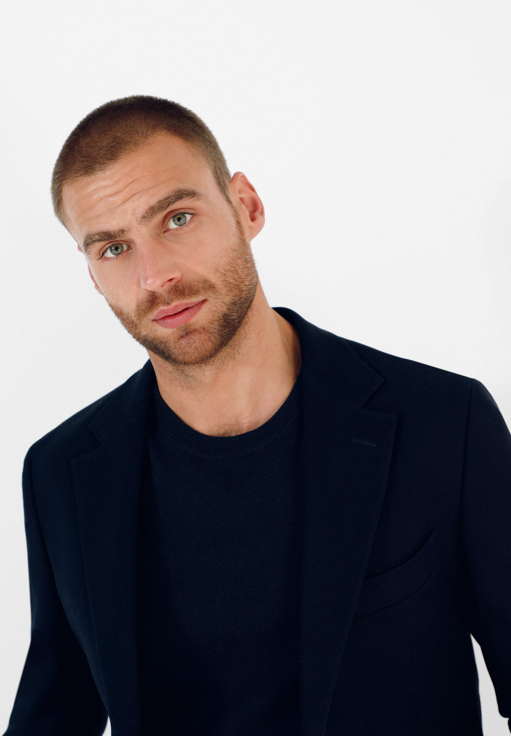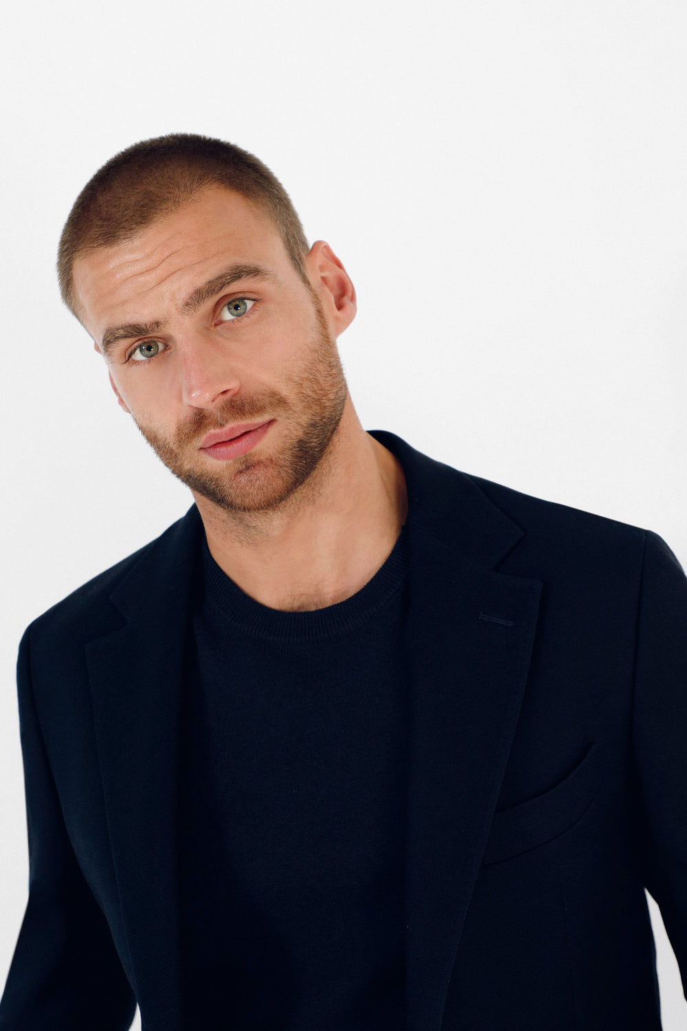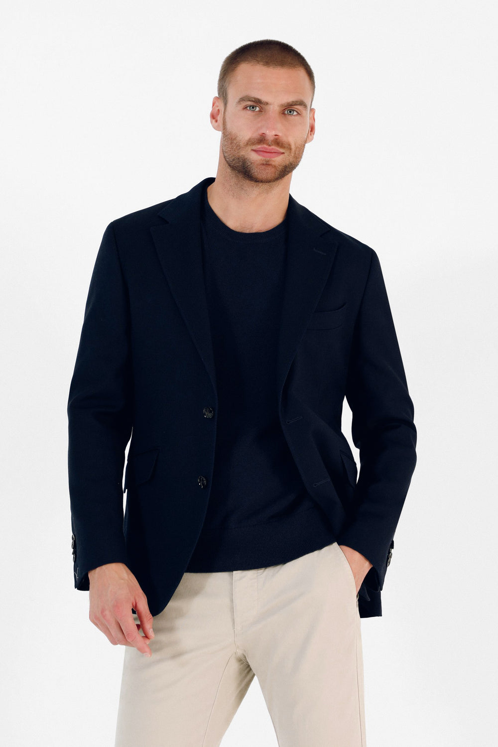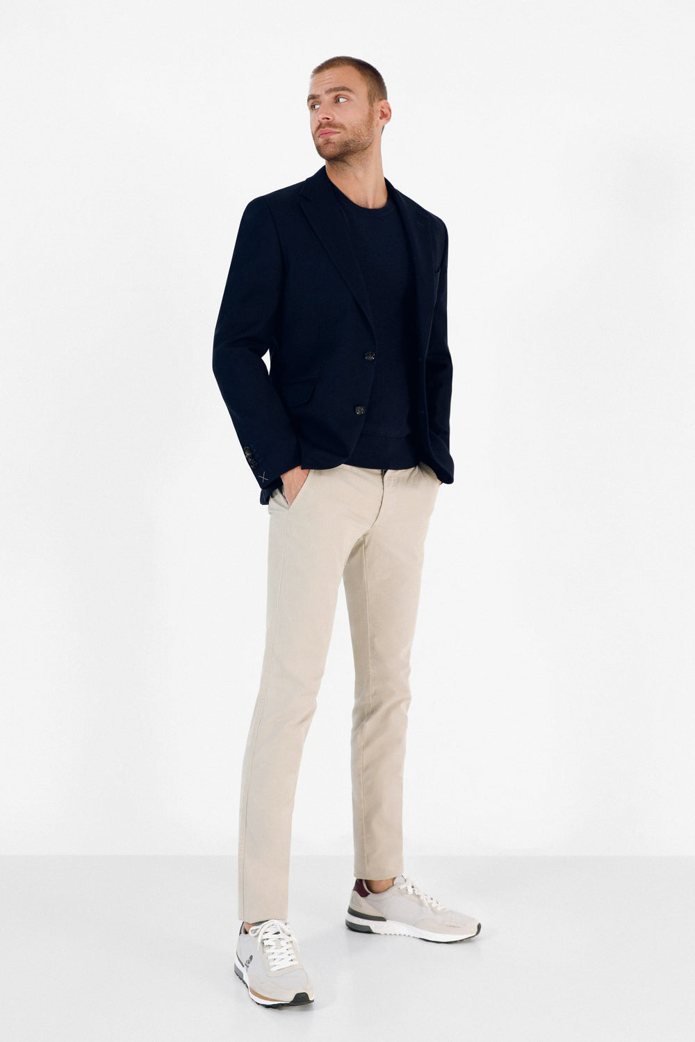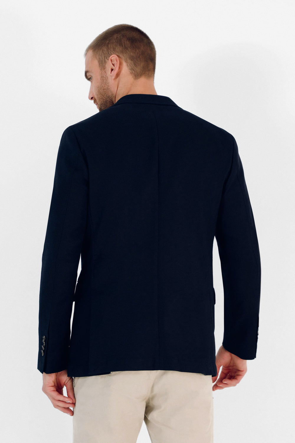 Americana confeccionada en tejido de algodón. Corte Slim Fit, cuello con solapa y ojala y cierre con dos botones. Manga larga terminada en puño con botones y bolsillos frontales de parche.