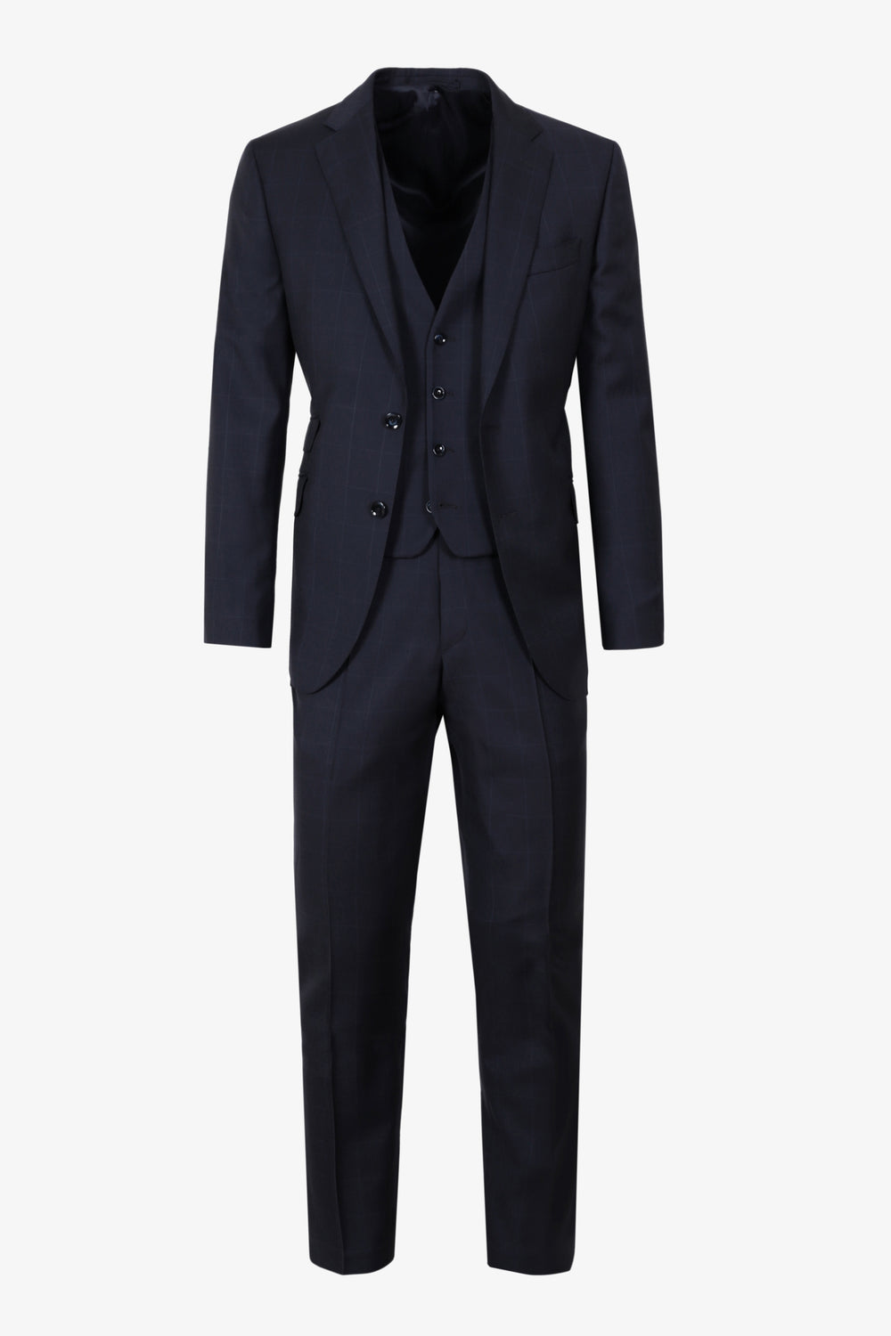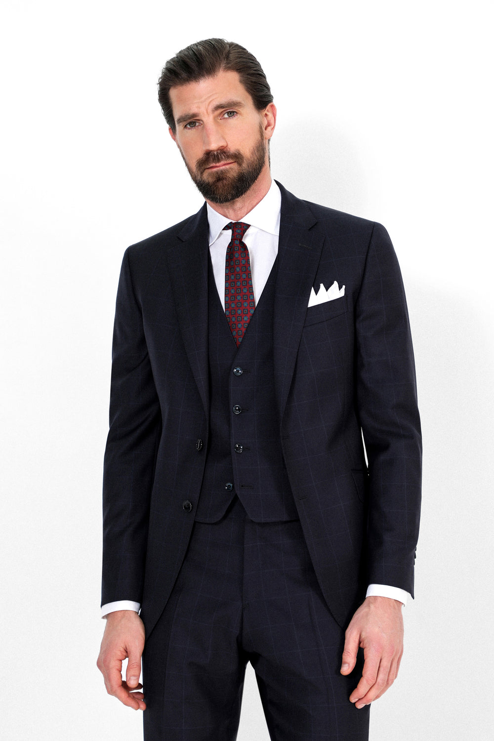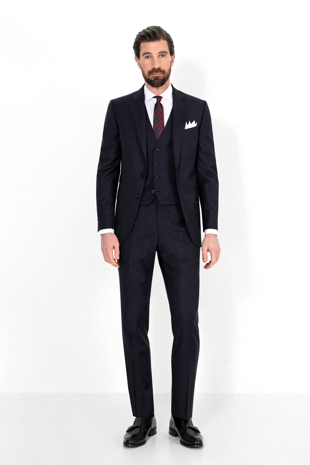 Traje de tres piezas de cuadros confeccionada en tejido 100% lana. Americana de corte Regular Fit, cuello con solapas de muesca y cierre con botones. Manga larga terminada en puño con botones y bolsillo insertado. Bolsillo insertado en el pecho. Chaleco clásico con botones. Pantalón de corte Regular Fit, cierre con botón y cremallera y bolsillos laterales.