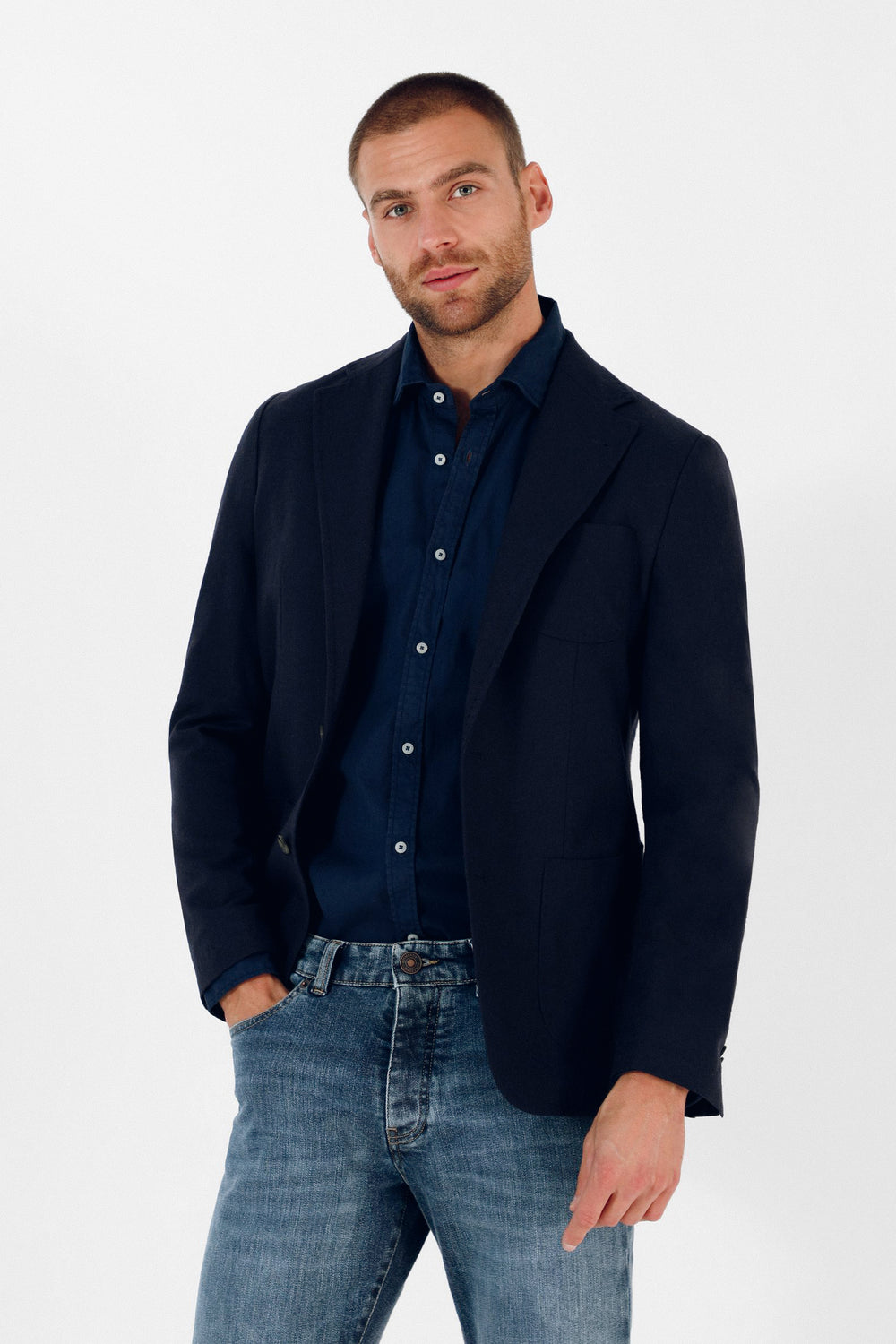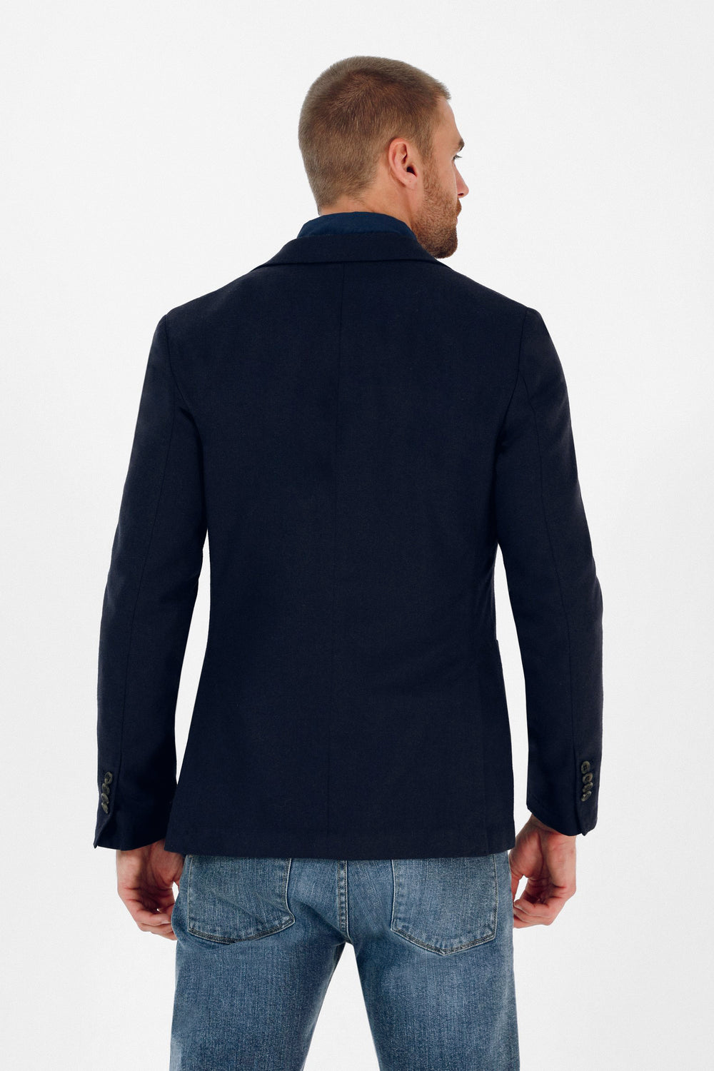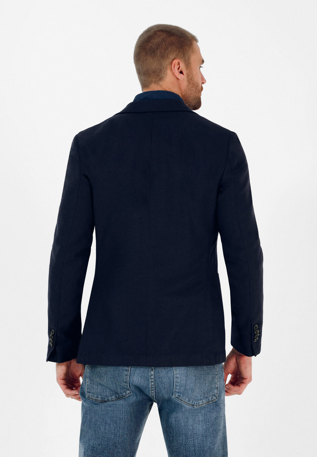 Americana casual confeccionada en tejido mezcla de lana. Corte Regular Fit, cuello con solapa y cierre con botones. Manga larga terminada en puño con botones y bolsillos laterales de plastrón.