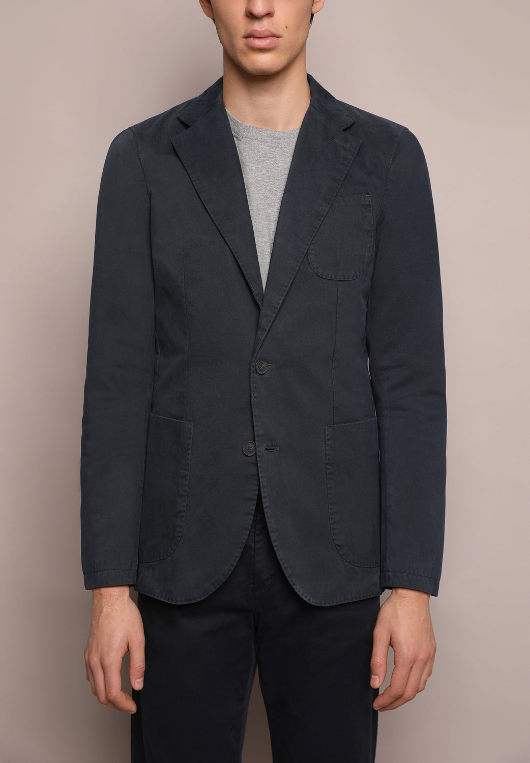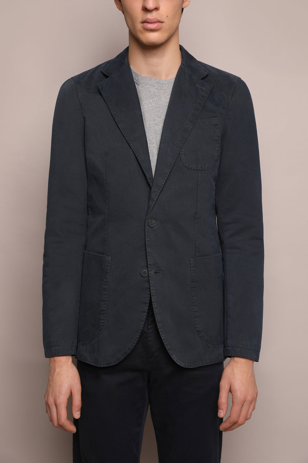 Americana confeccionada en tejido 100% algodón. Corte Regular Fit, cuello con solapas y cierre con botones. Manga larga terminada en puño con botones y bolsillos de parche.
