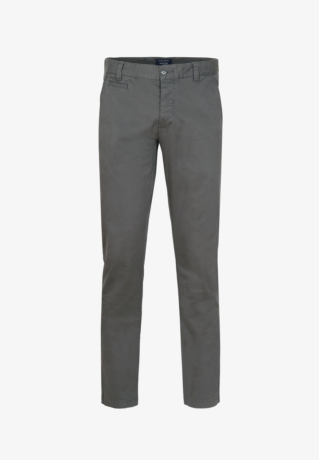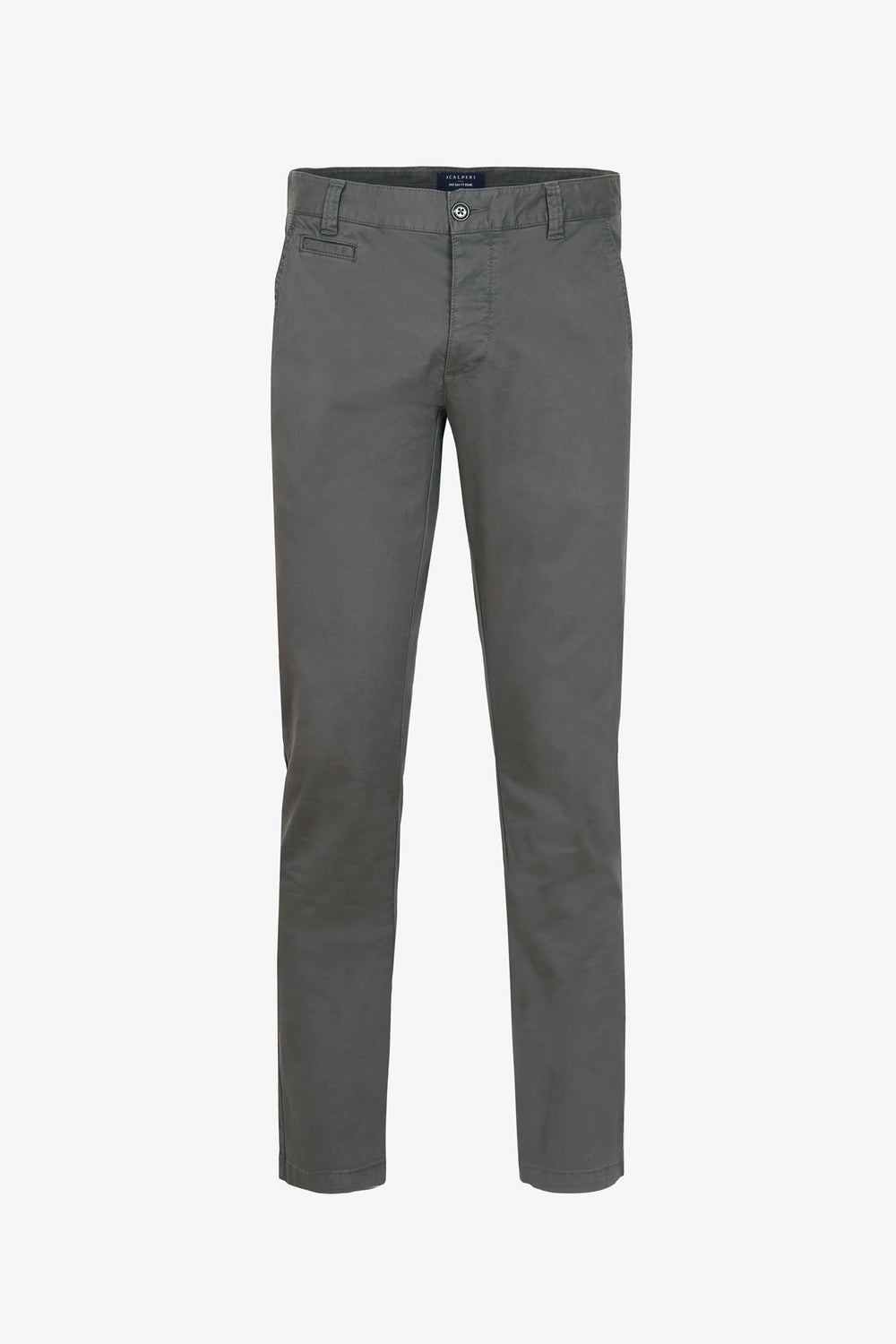 Pantalón chino confeccionado en tejido de algodón garment dyed. Corte Regular Fit, cierre mediante cremallera oculta por tapeta y botón. Bolsillos delanteros y traseros con botón y trabillas para el cinturón.