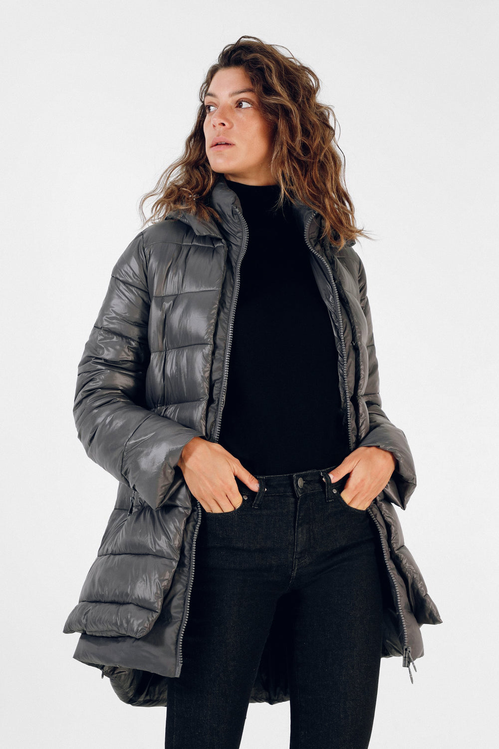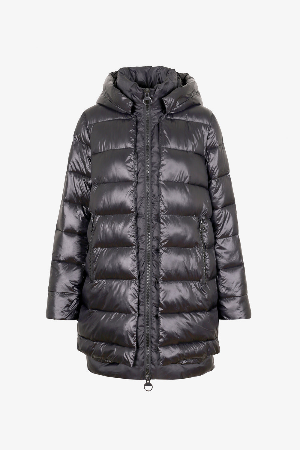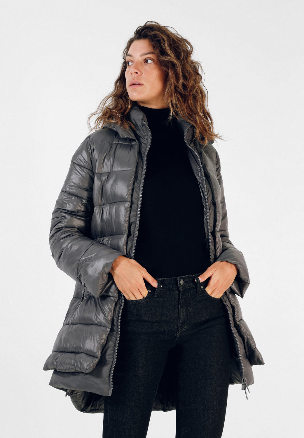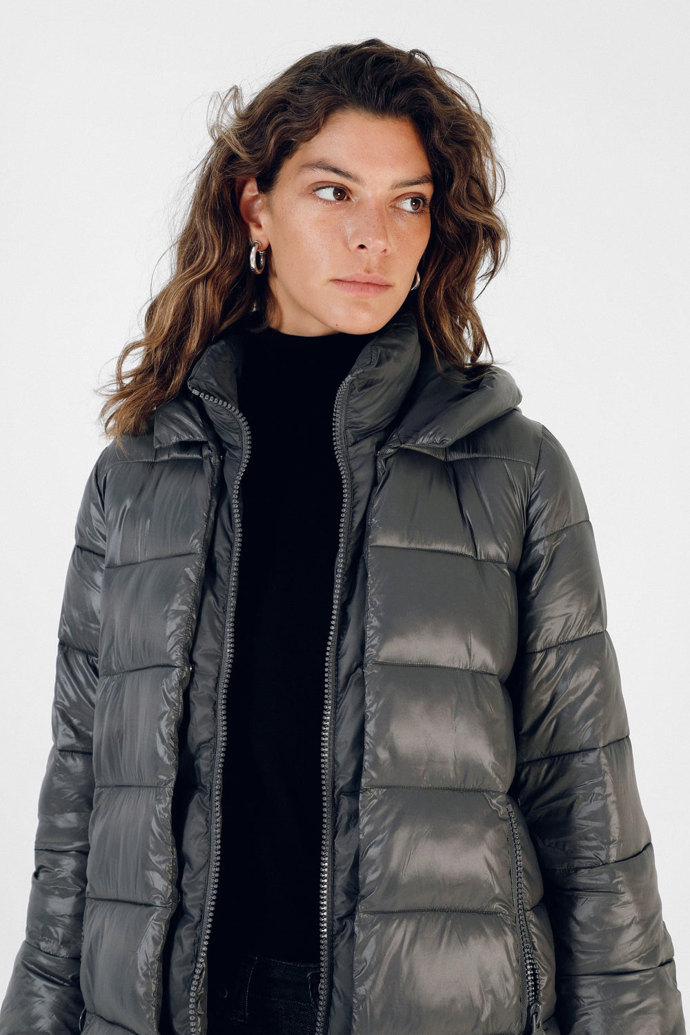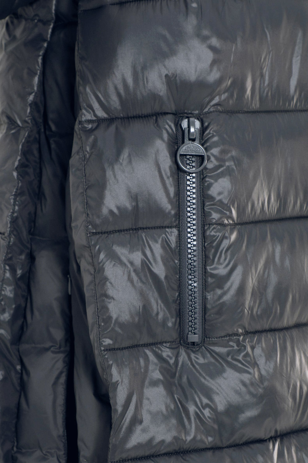 Abrigo acolchado confeccionado en tejido de nailon. Corte tres cuartos, cuello con capucha y cierre con cremallera de doble carro. Manga larga y bolsillos laterales. Aberturas laterales con cremallera y contraste de tela en brillo y mate.