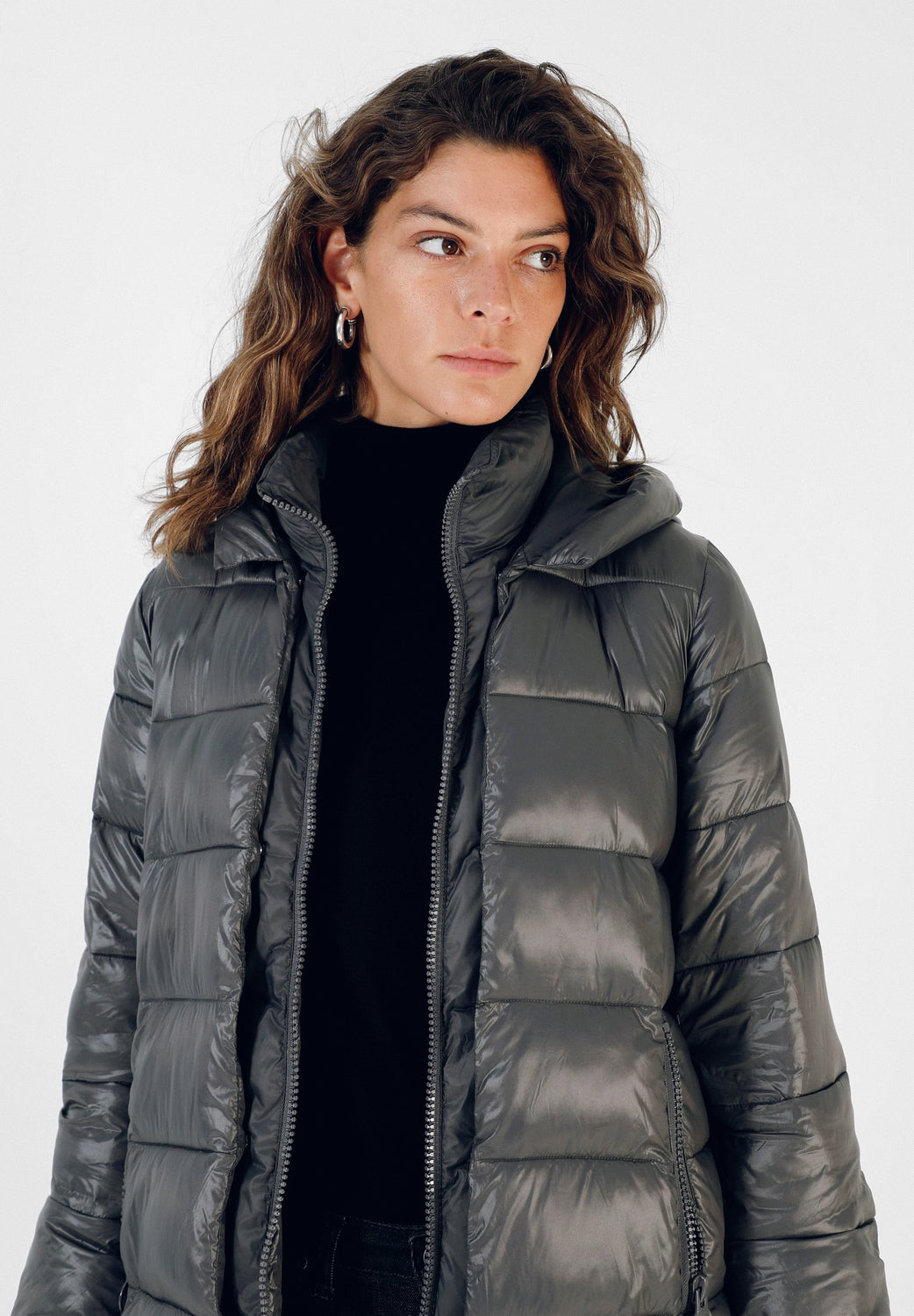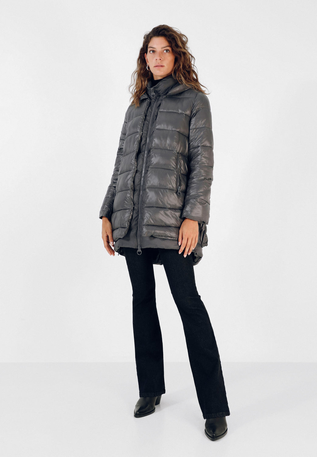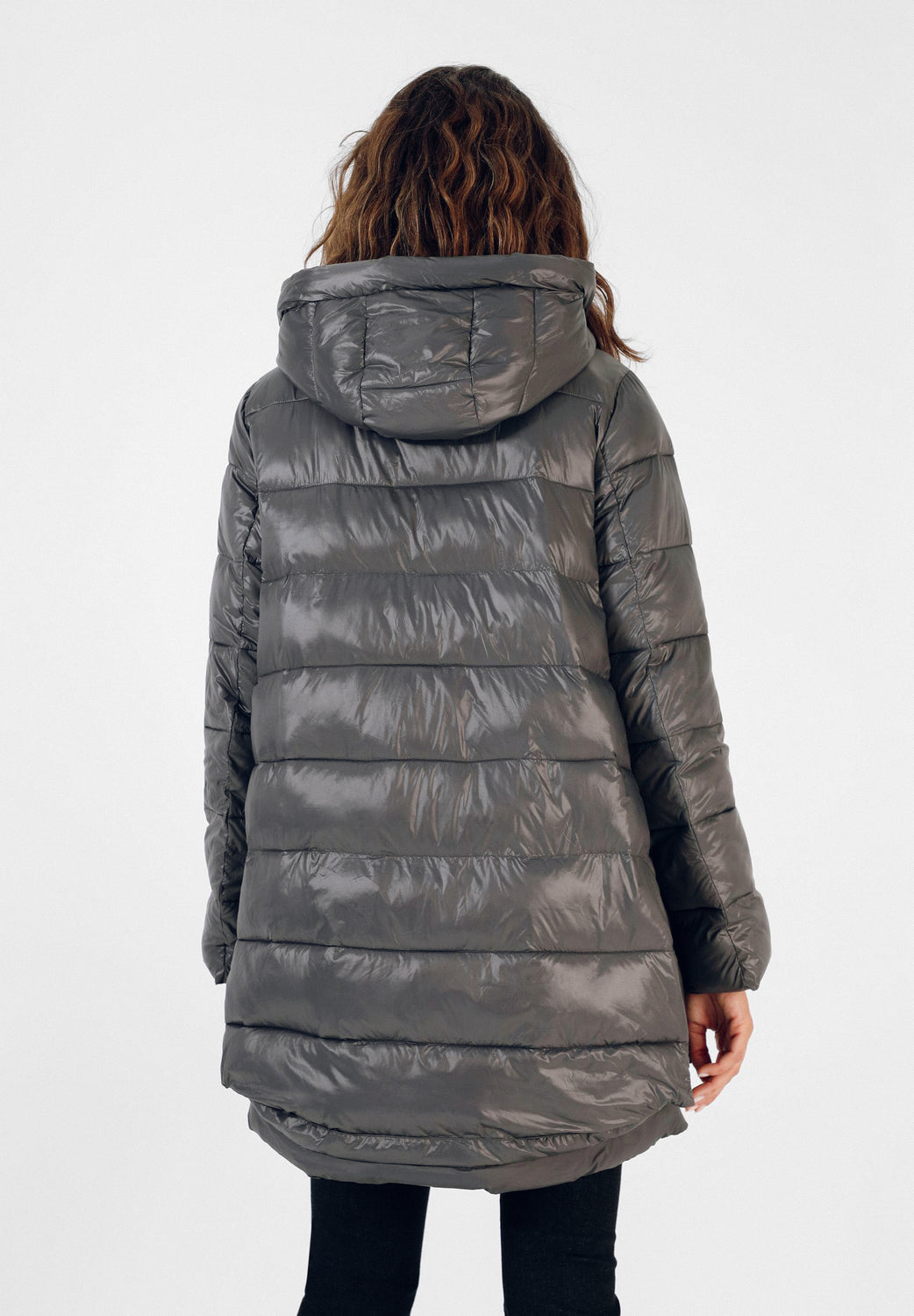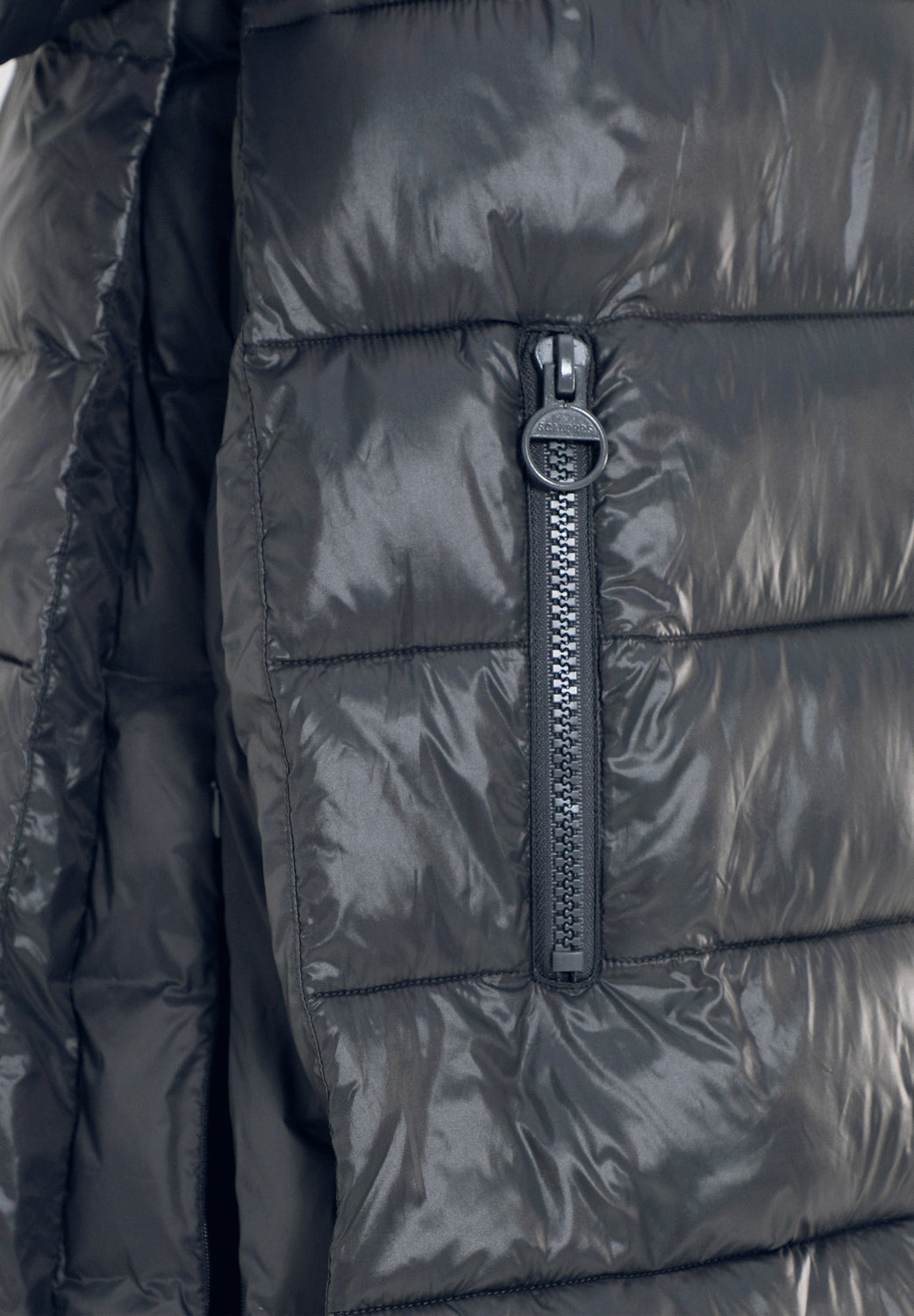 Abrigo acolchado confeccionado en tejido de nailon. Corte tres cuartos, cuello con capucha y cierre con cremallera de doble carro. Manga larga y bolsillos laterales. Aberturas laterales con cremallera y contraste de tela en brillo y mate.