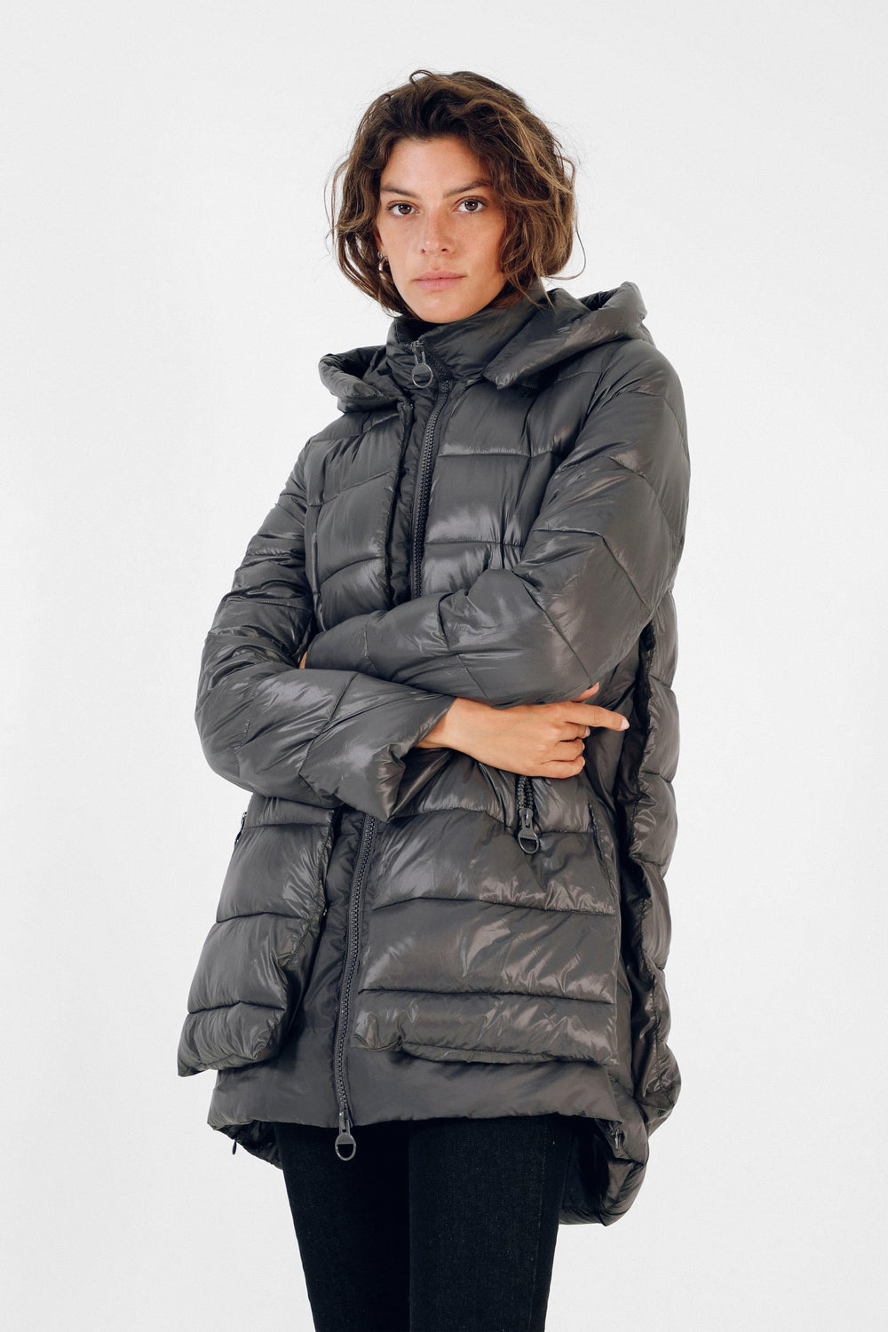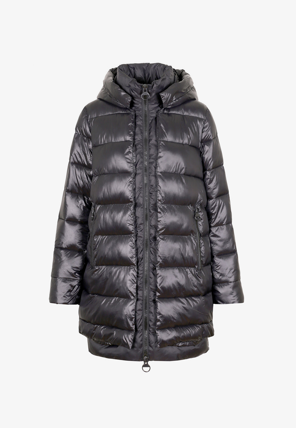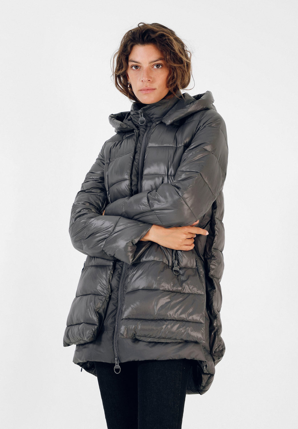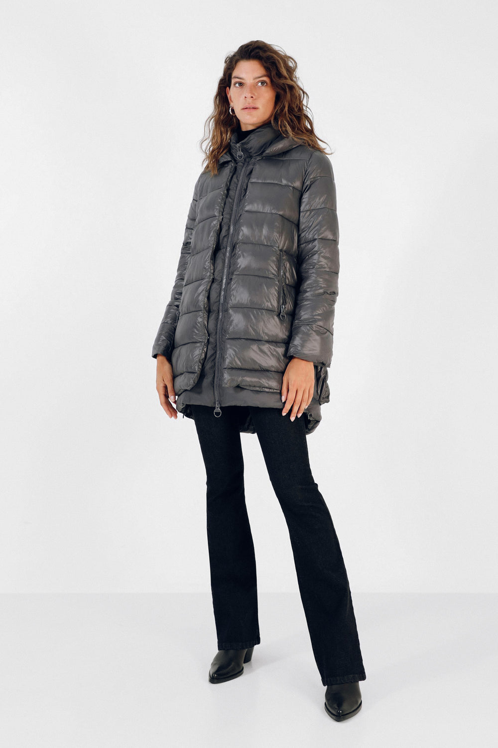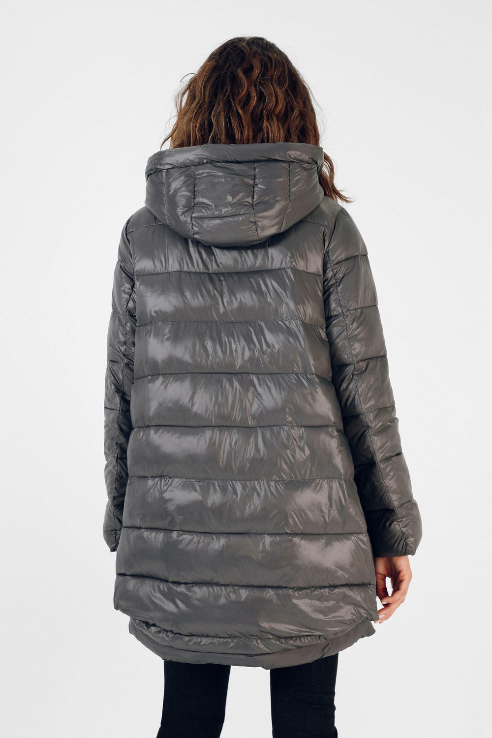 Abrigo acolchado confeccionado en tejido de nailon. Corte tres cuartos, cuello con capucha y cierre con cremallera de doble carro. Manga larga y bolsillos laterales. Aberturas laterales con cremallera y contraste de tela en brillo y mate.