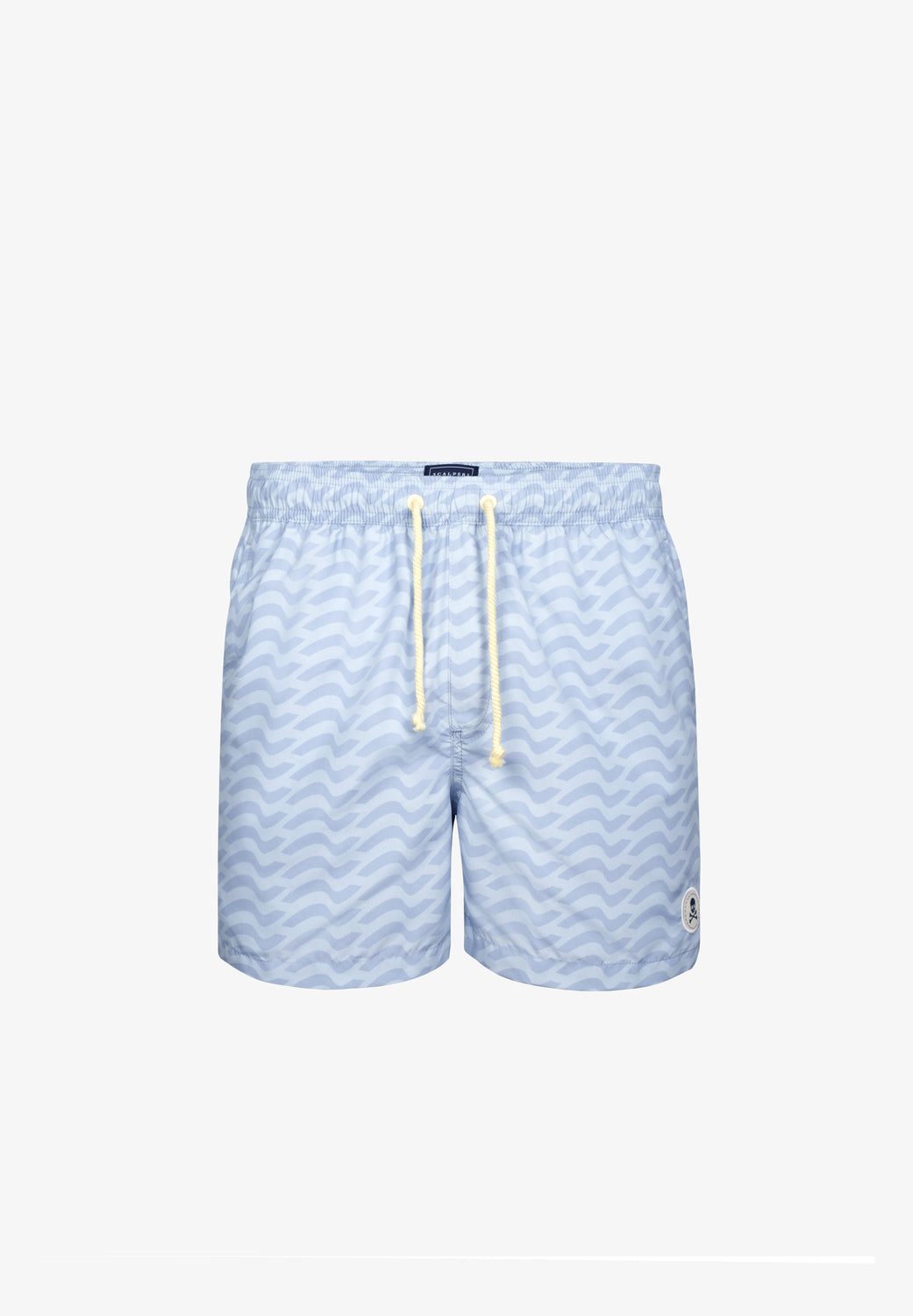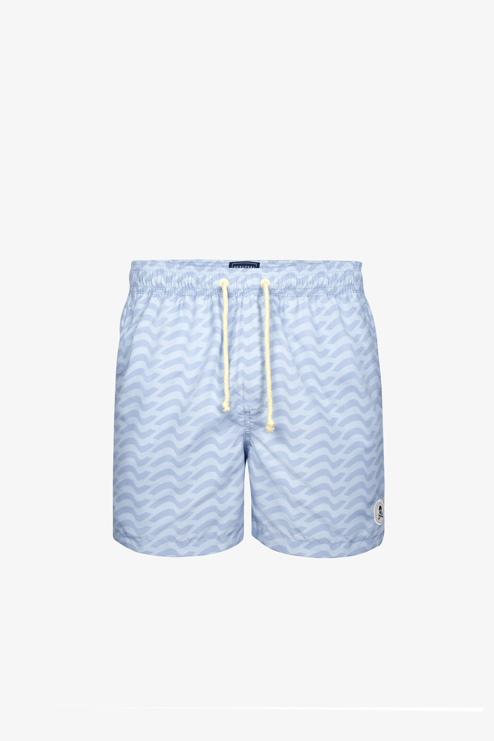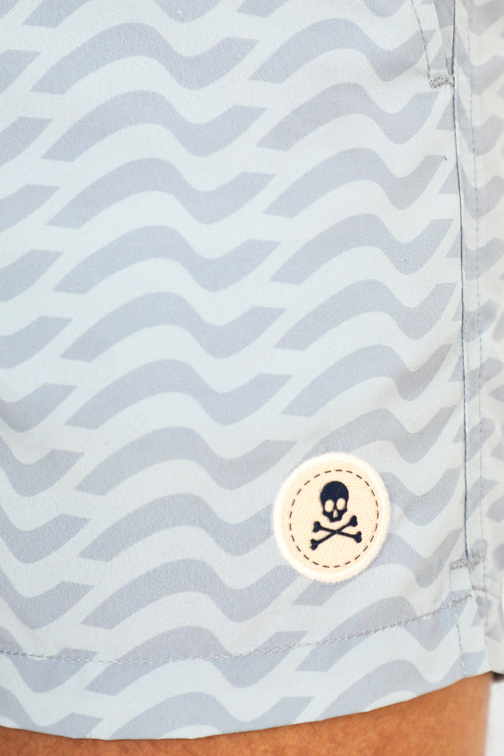 Bañador con estampado de ondas confeccionado en tejido de poliéster. Corte Regular Fit, cierre con cordón y velcro. Detalle de calavera engomada en el bajo y bolsillos laterales y trasero.