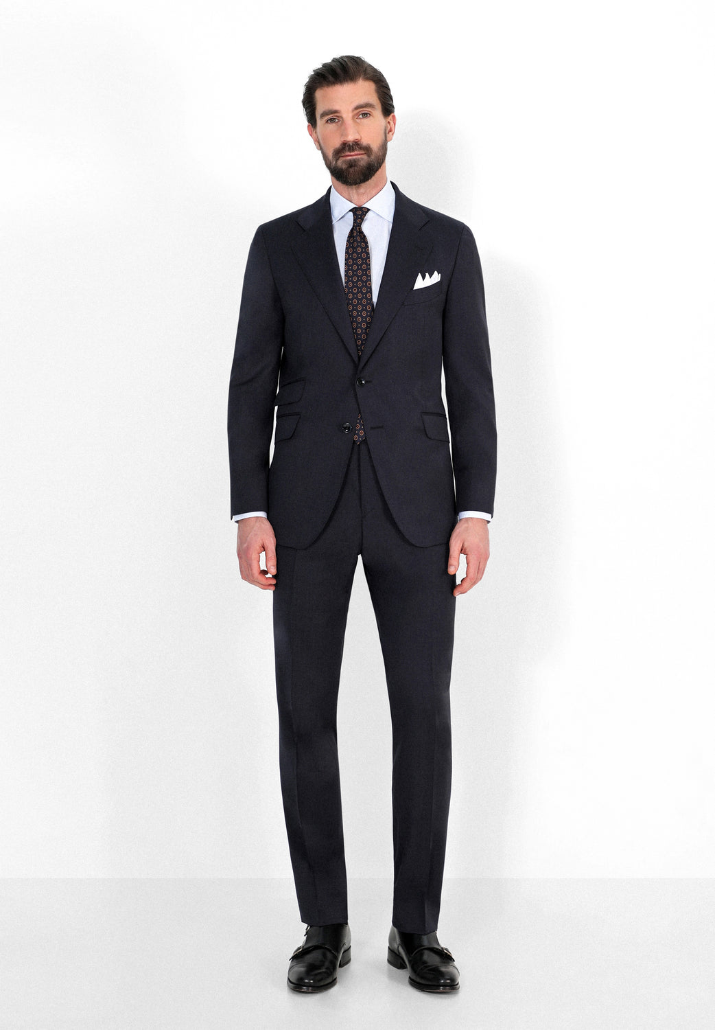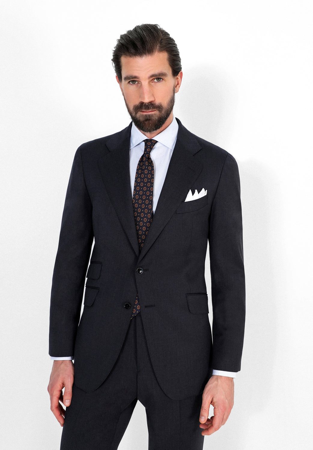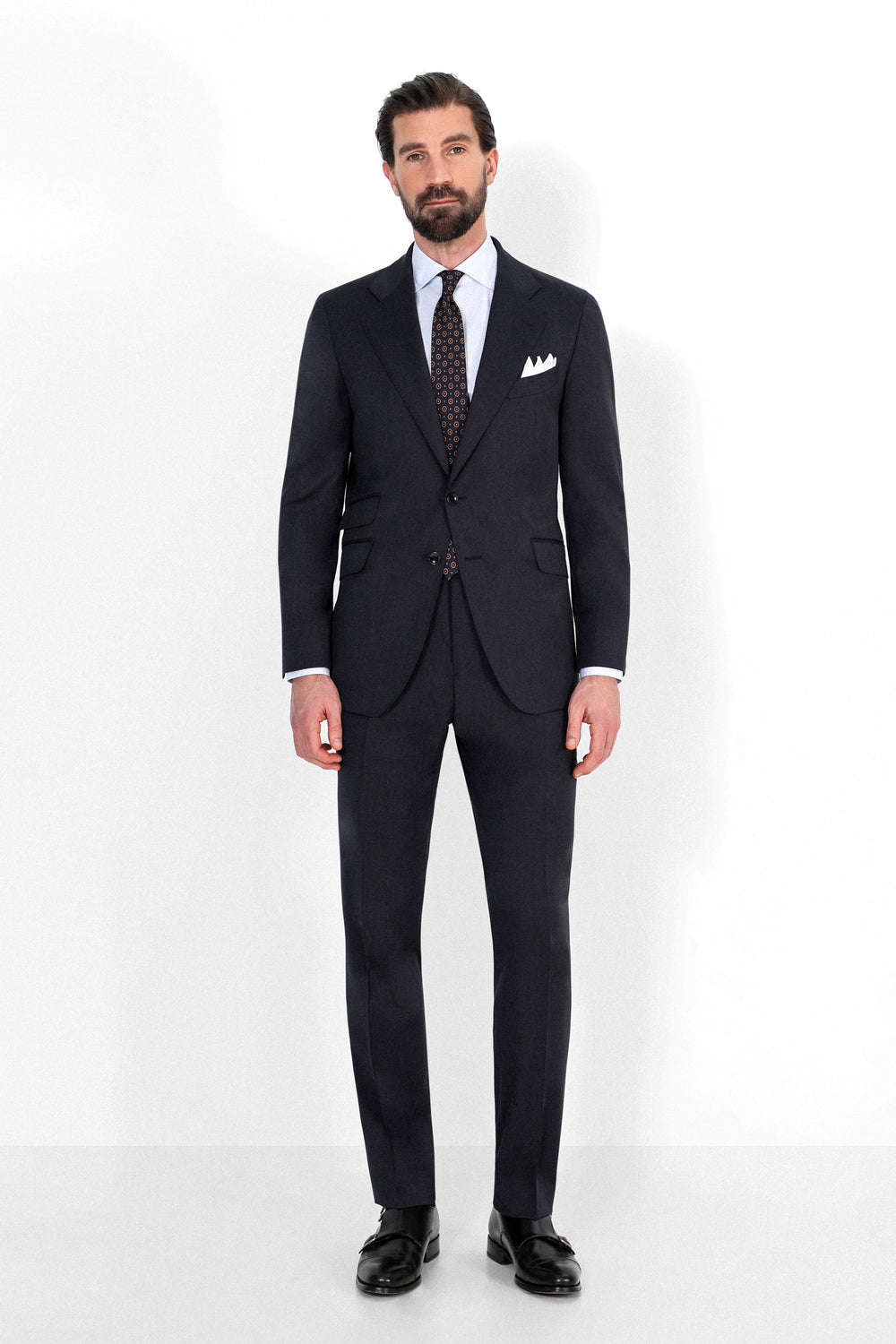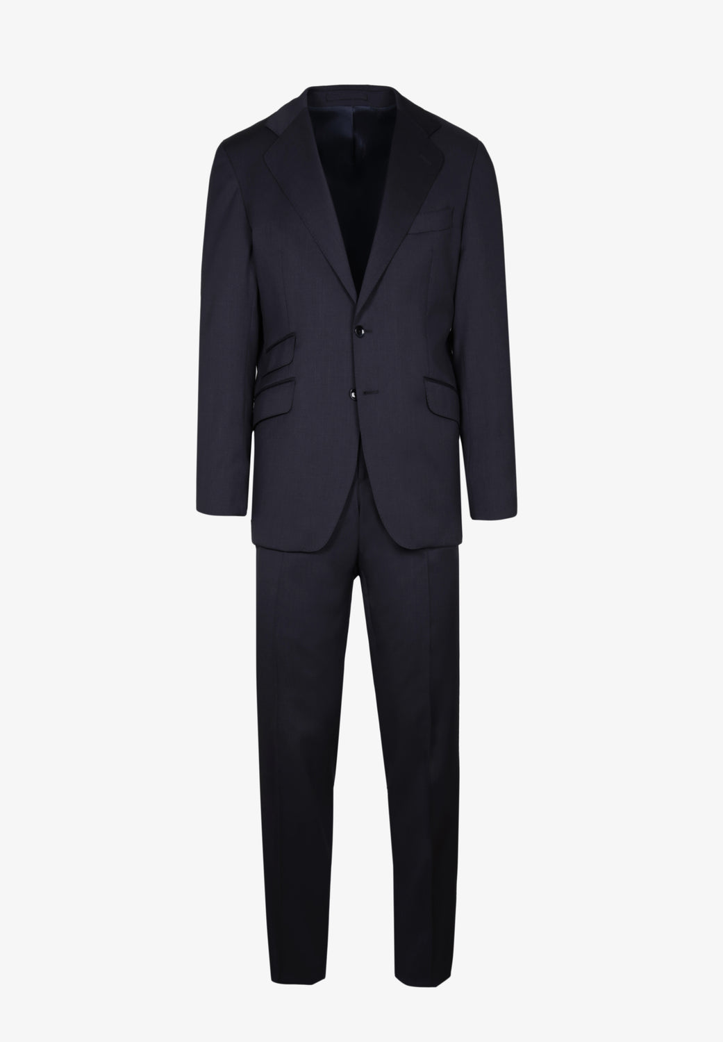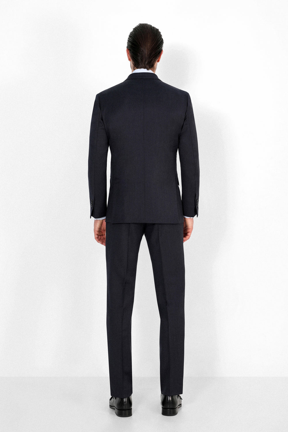 Traje confeccionada en tejido 100% lana. Americana de corte Regular Fit, cuello con solapas de muesca y cierre con botones, manga larga terminada en puño con botones y bolsillo insertado. Pantalón de corte Regular Fit, cierre con botón y cremallera y bolsillos laterales.