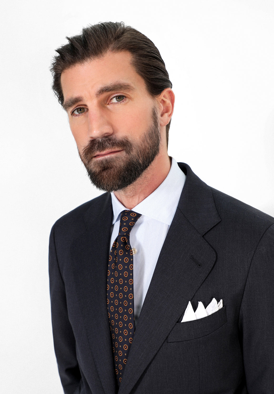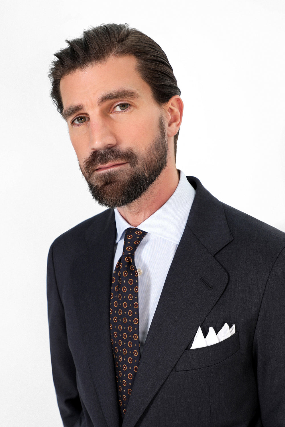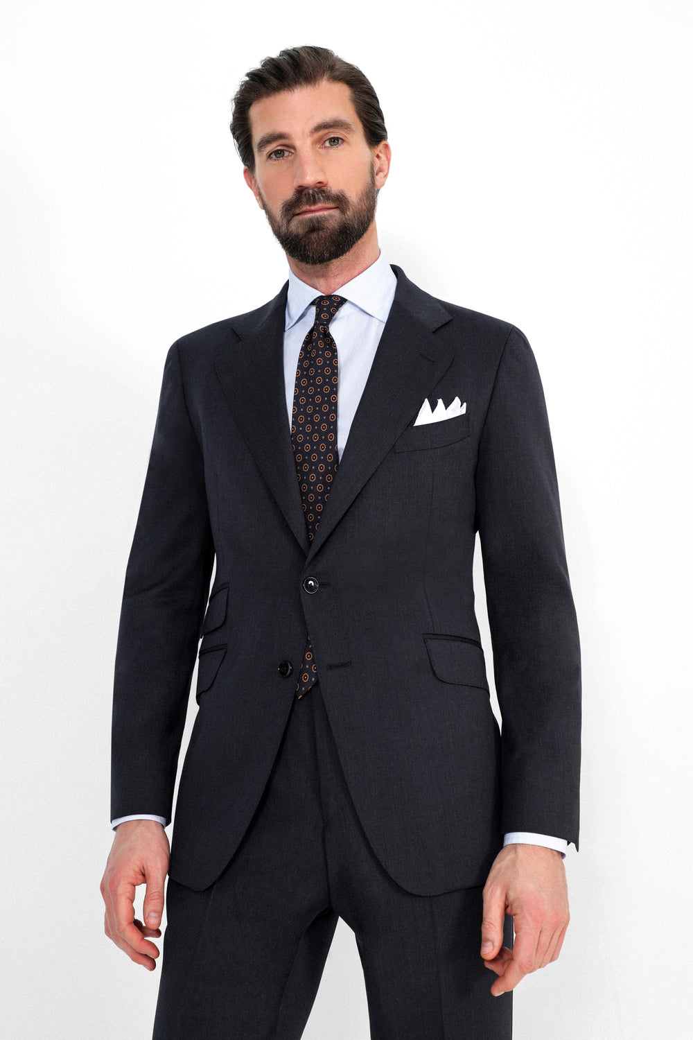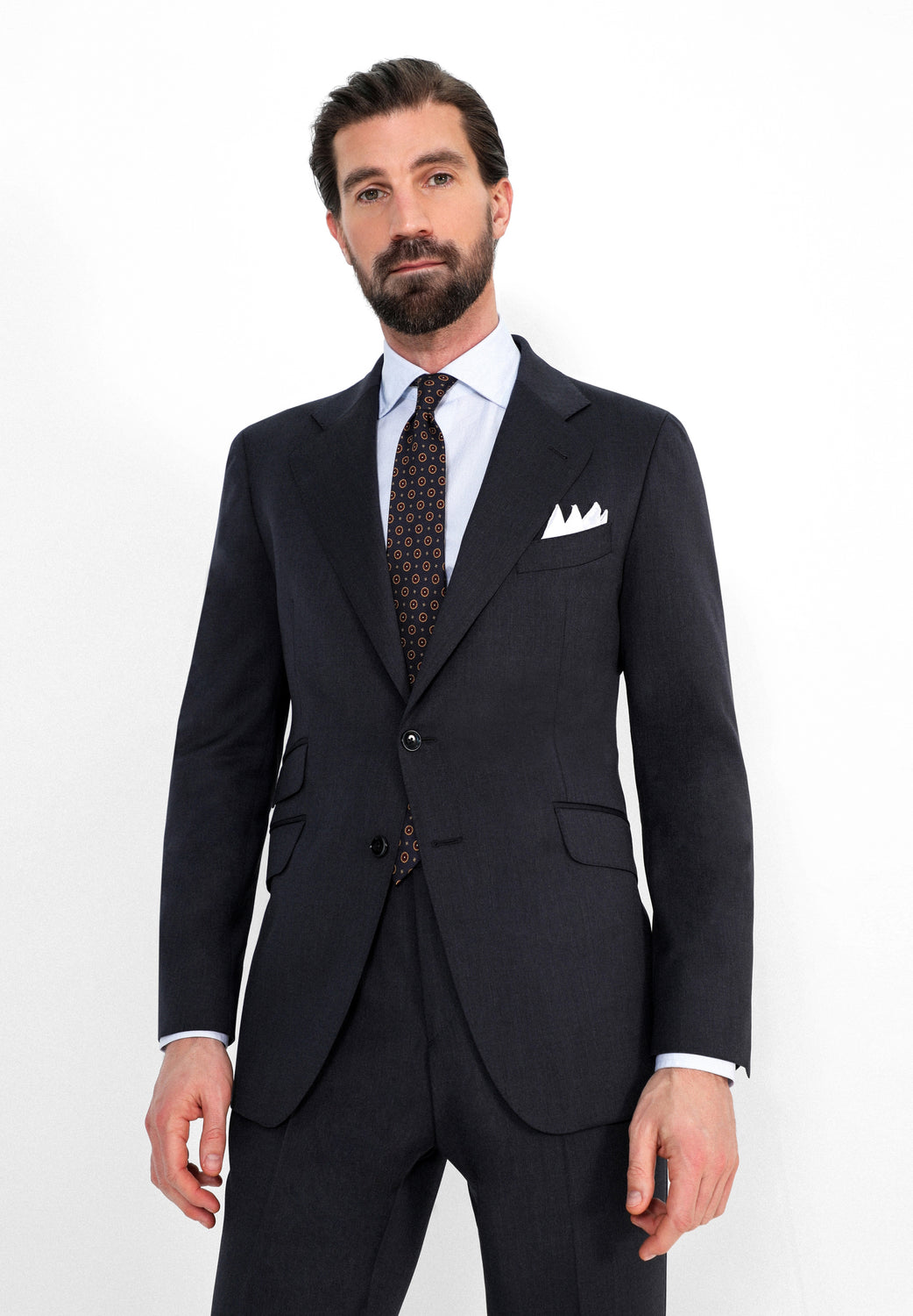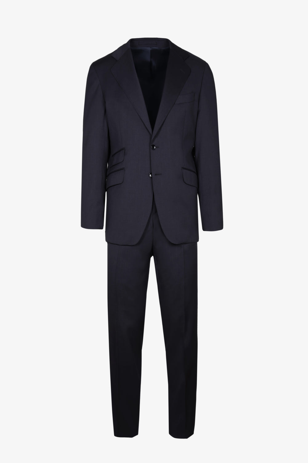 Traje confeccionada en tejido 100% lana. Americana de corte Regular Fit, cuello con solapas de muesca y cierre con botones, manga larga terminada en puño con botones y bolsillo insertado. Pantalón de corte Regular Fit, cierre con botón y cremallera y bolsillos laterales.