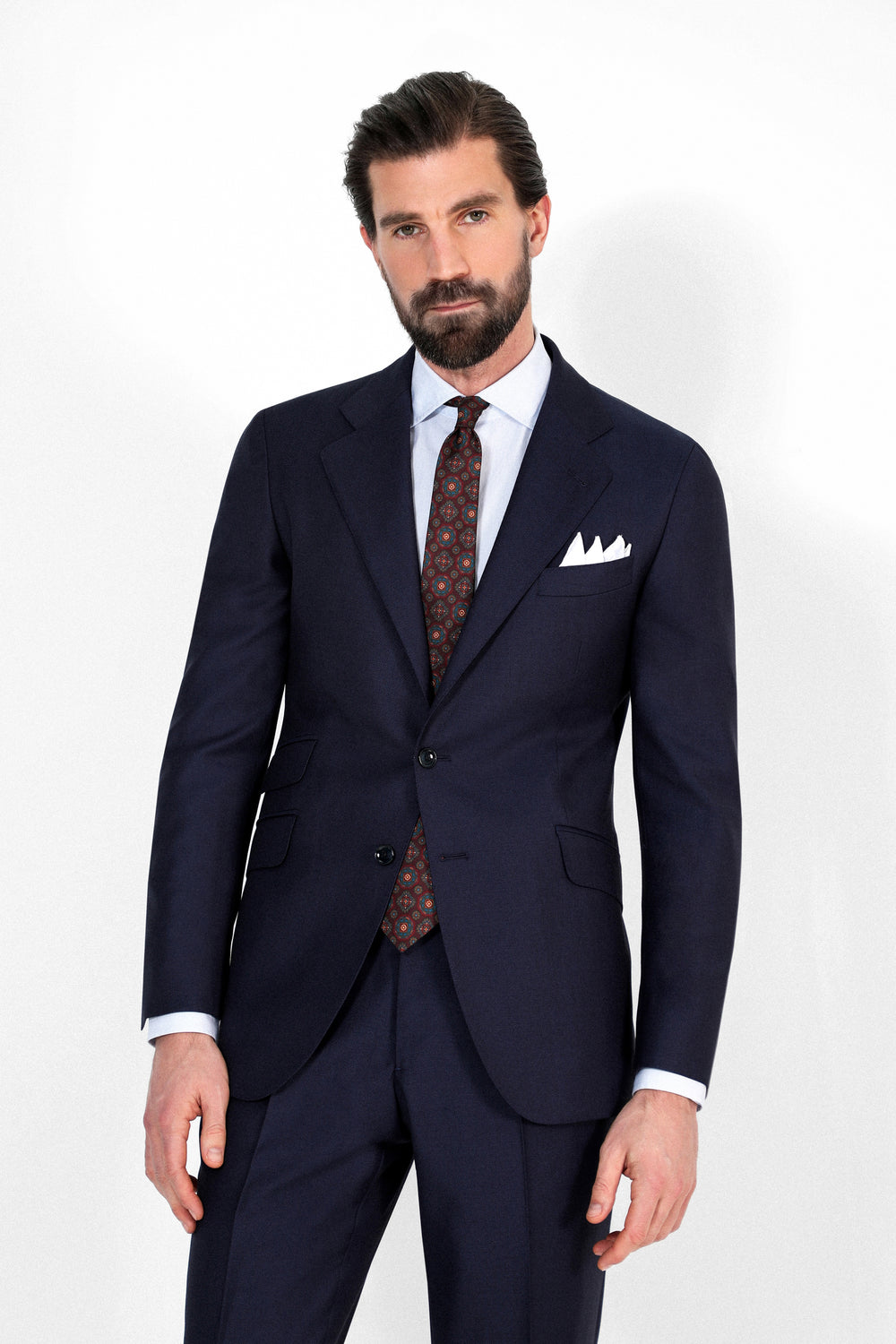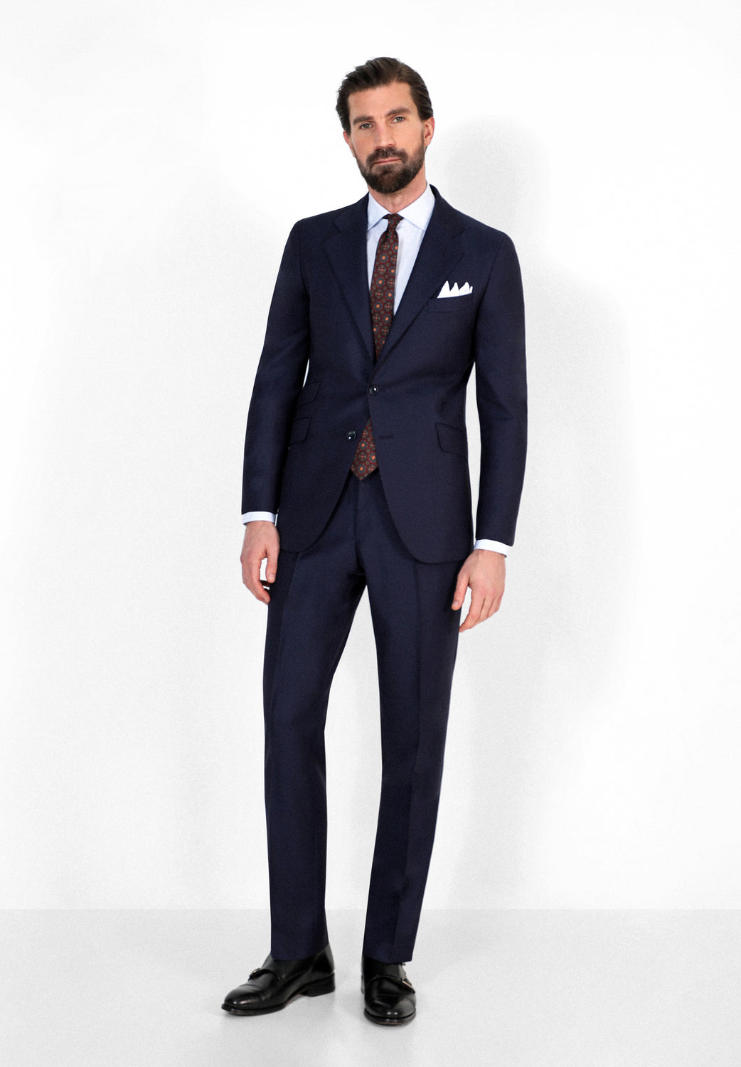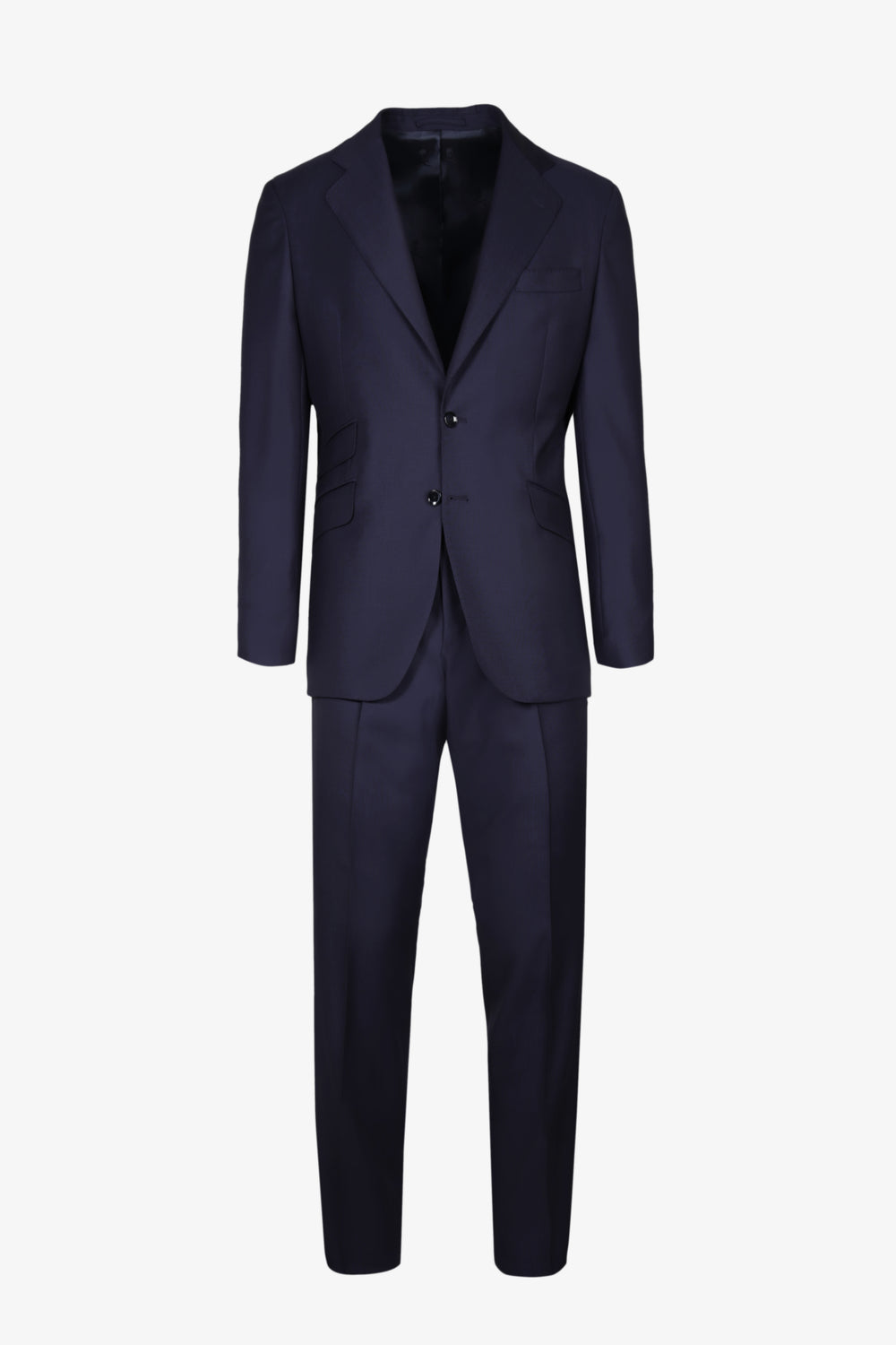Traje confeccionada en tejido 100% lana. Americana de corte Regular Fit, cuello con solapas de muesca y cierre con botones, manga larga terminada en puño con botones y bolsillo insertado. Pantalón de corte Regular Fit, cierre con botón y cremallera y bolsillos laterales.