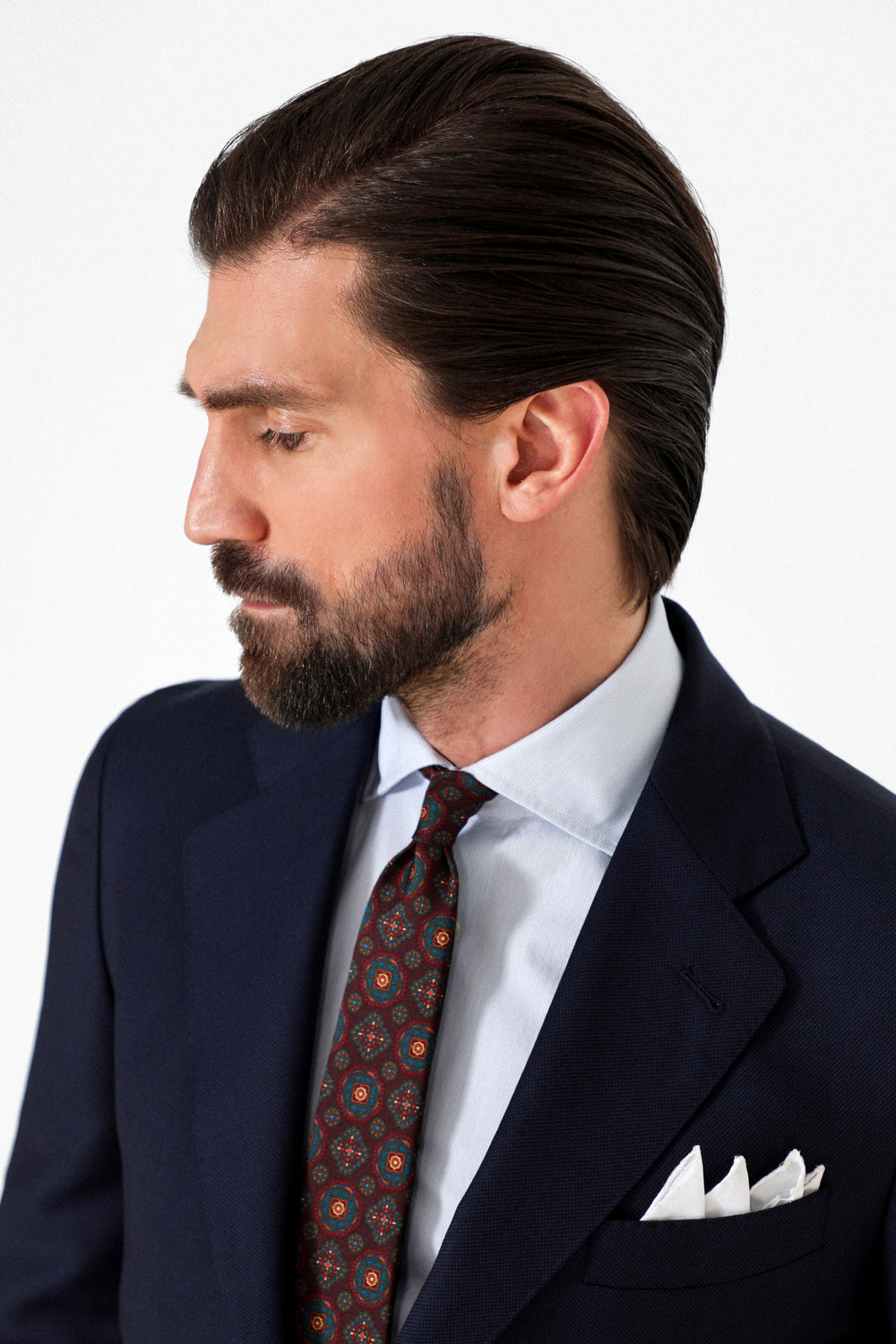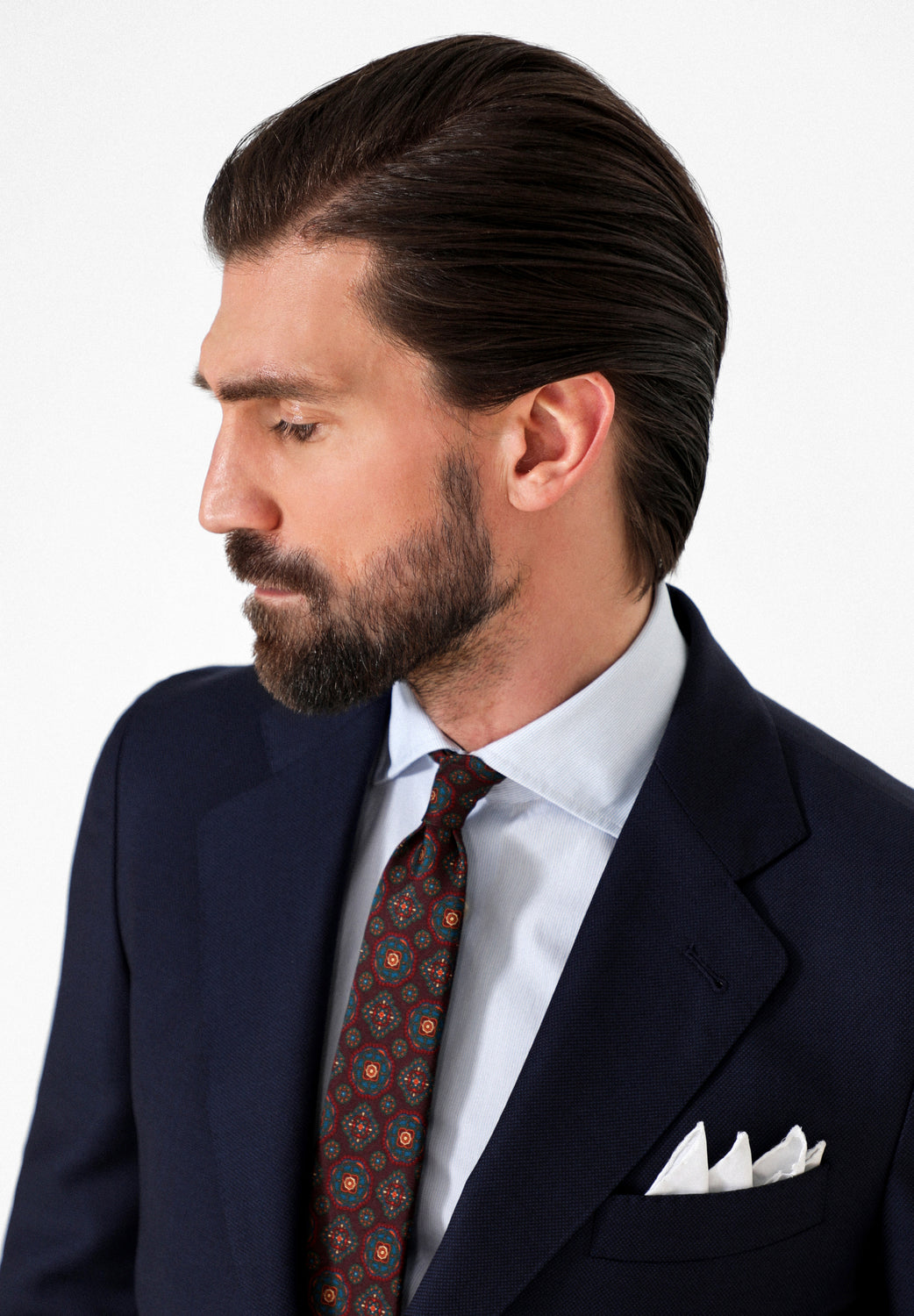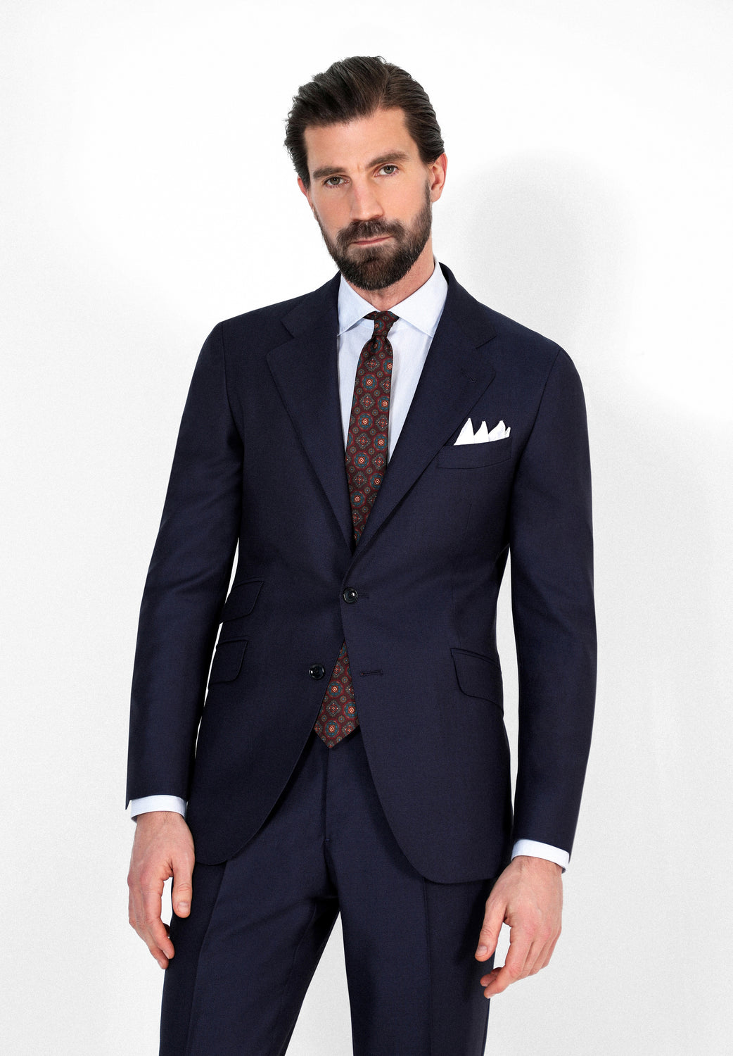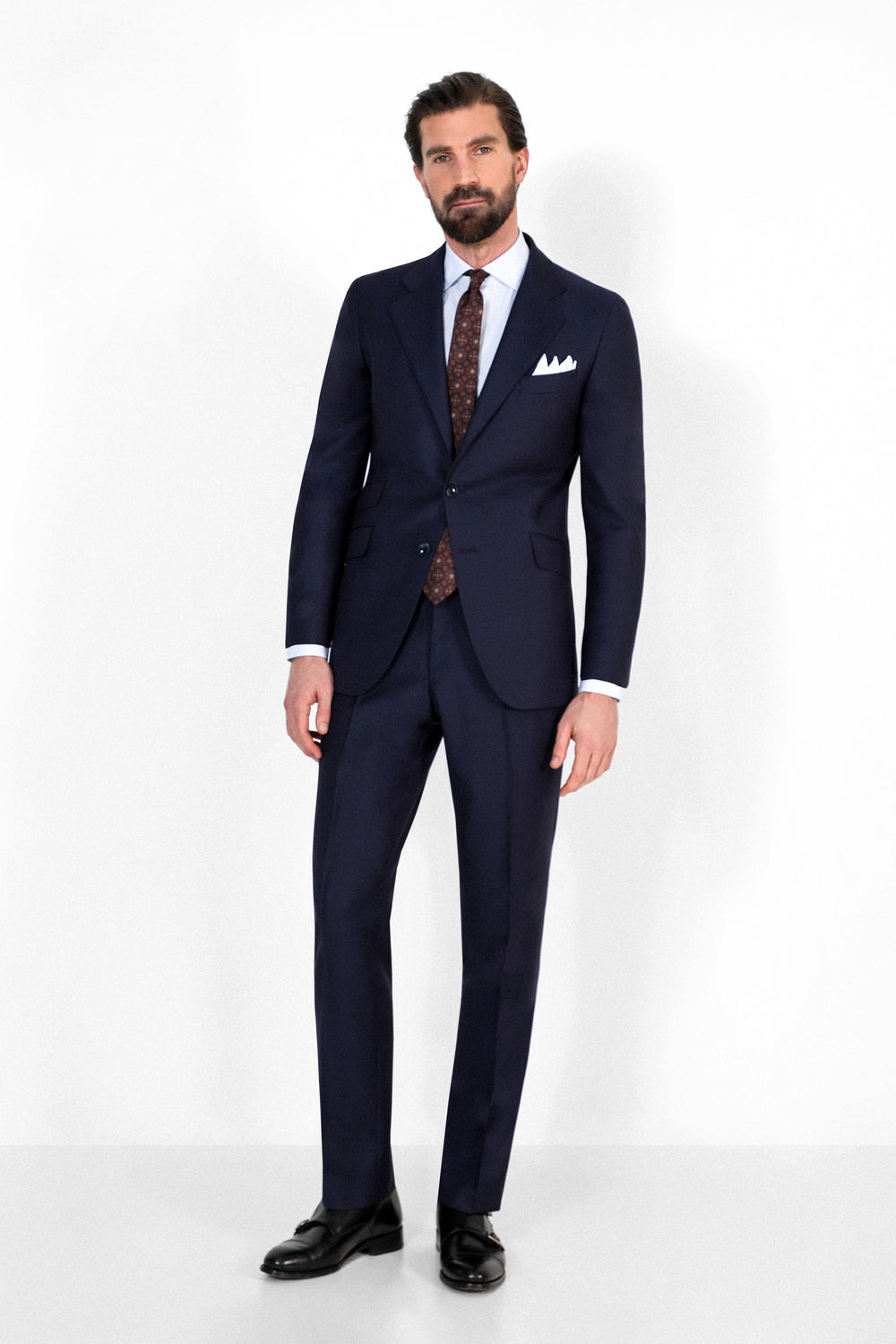 Traje confeccionada en tejido 100% lana. Americana de corte Regular Fit, cuello con solapas de muesca y cierre con botones, manga larga terminada en puño con botones y bolsillo insertado. Pantalón de corte Regular Fit, cierre con botón y cremallera y bolsillos laterales.