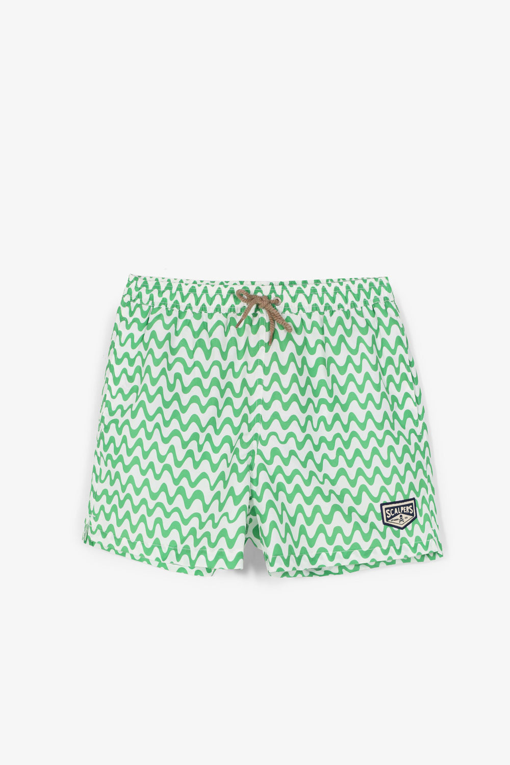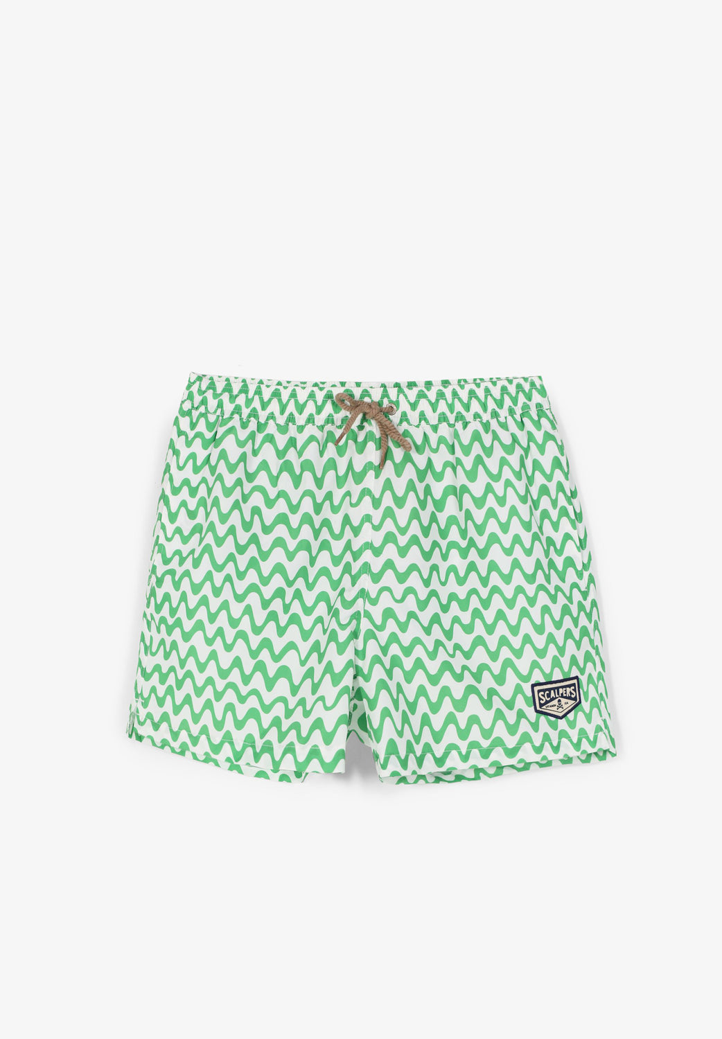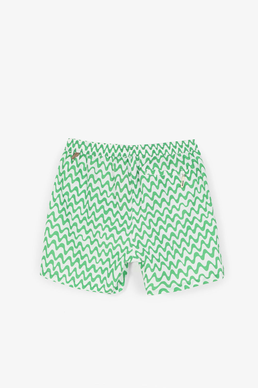 Bañador con estampado de ondas. Cintura elástica y cierre con cordón. Tiene dos bolsillos laterales y un parche en el bajo.