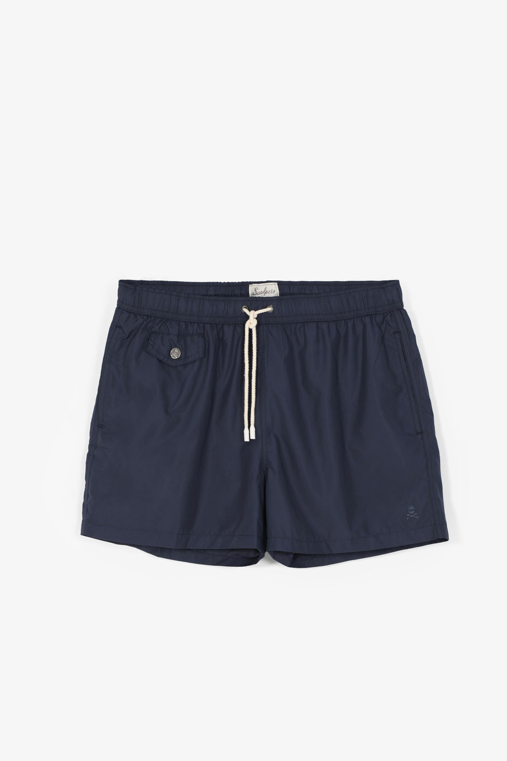 Bañador confeccionado en tejido 100% poliéster reciclado. Corte Regular Fit con cinturilla elástica, cierre con cordón y bolsillo delantero con botón y trasero con tapeta y snap. Detalle de calavera en el bajo.