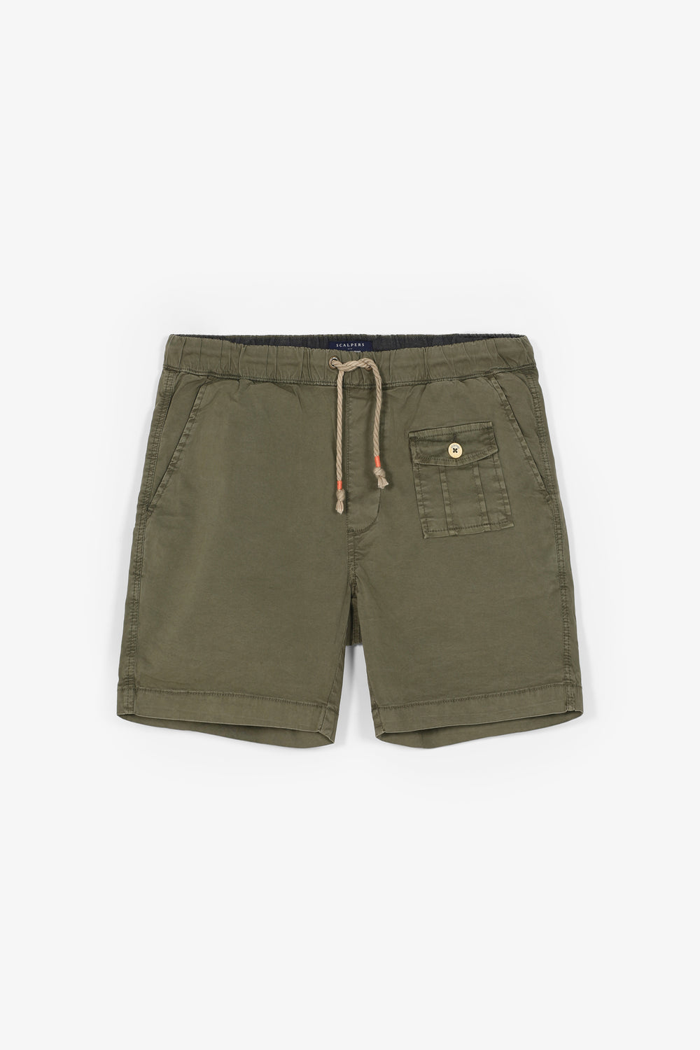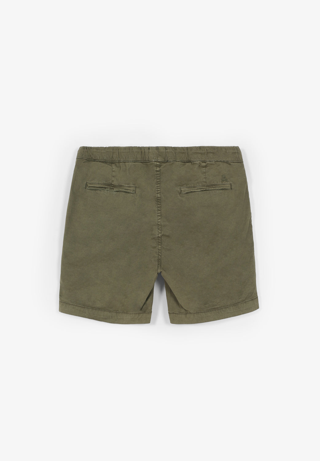 Bermudas confeccionadas en tejido de algodón ligeramente elástico. Corte Regular Fit con cinturilla elástica, cierre con cordón y bolsillo delantero de plastrón con tapeta. Bolsillos laterales y bolsillo insertado.
