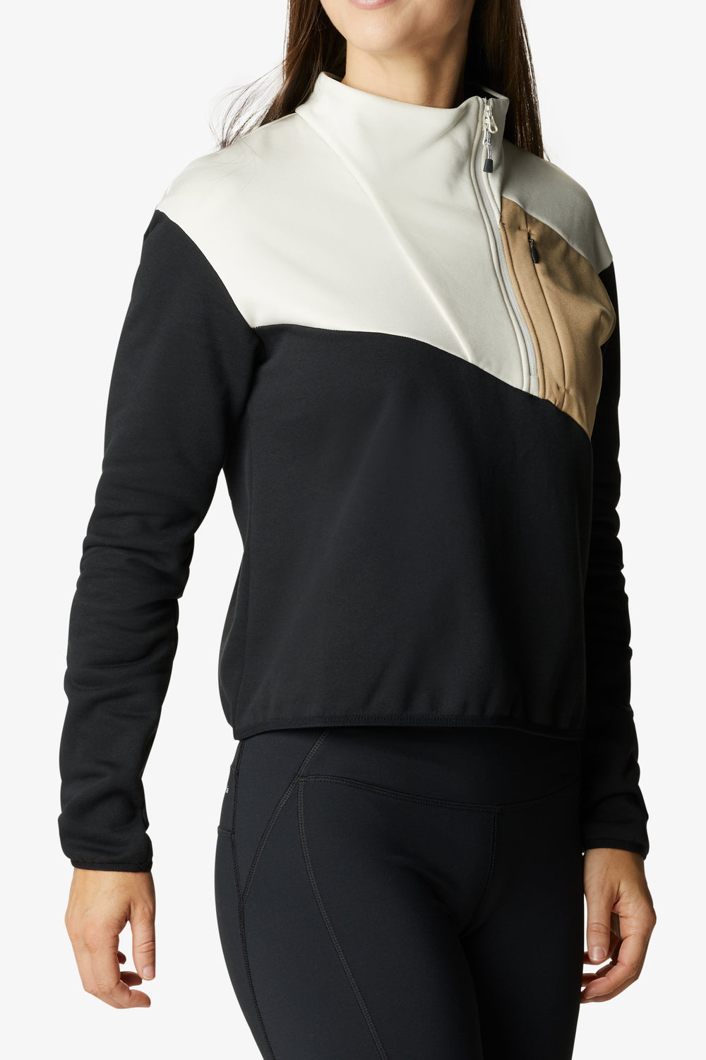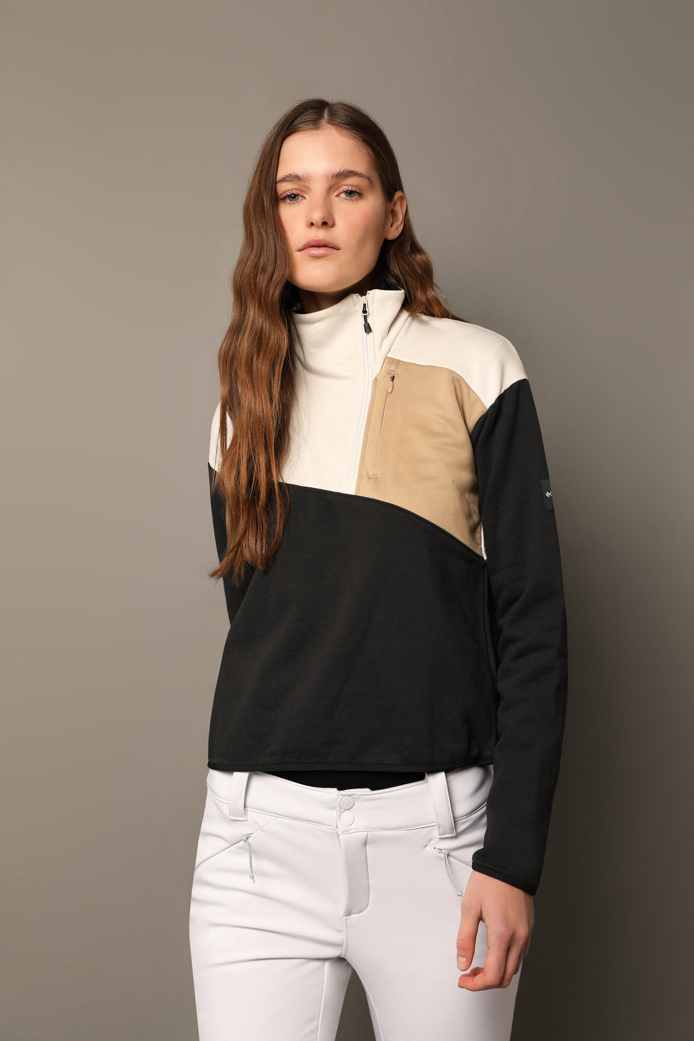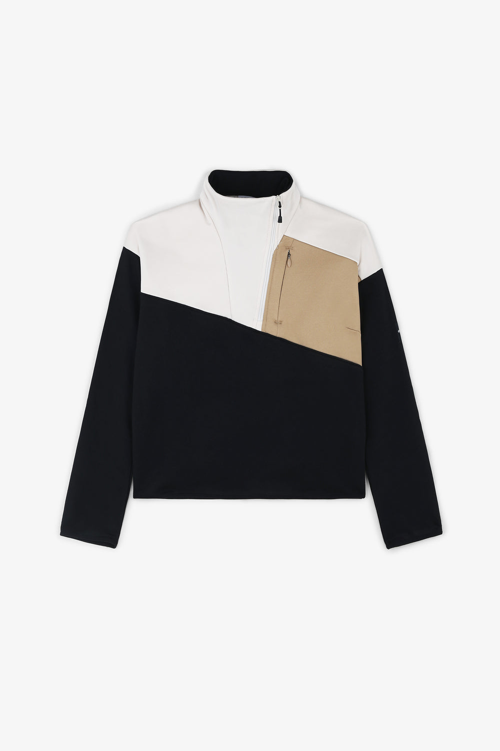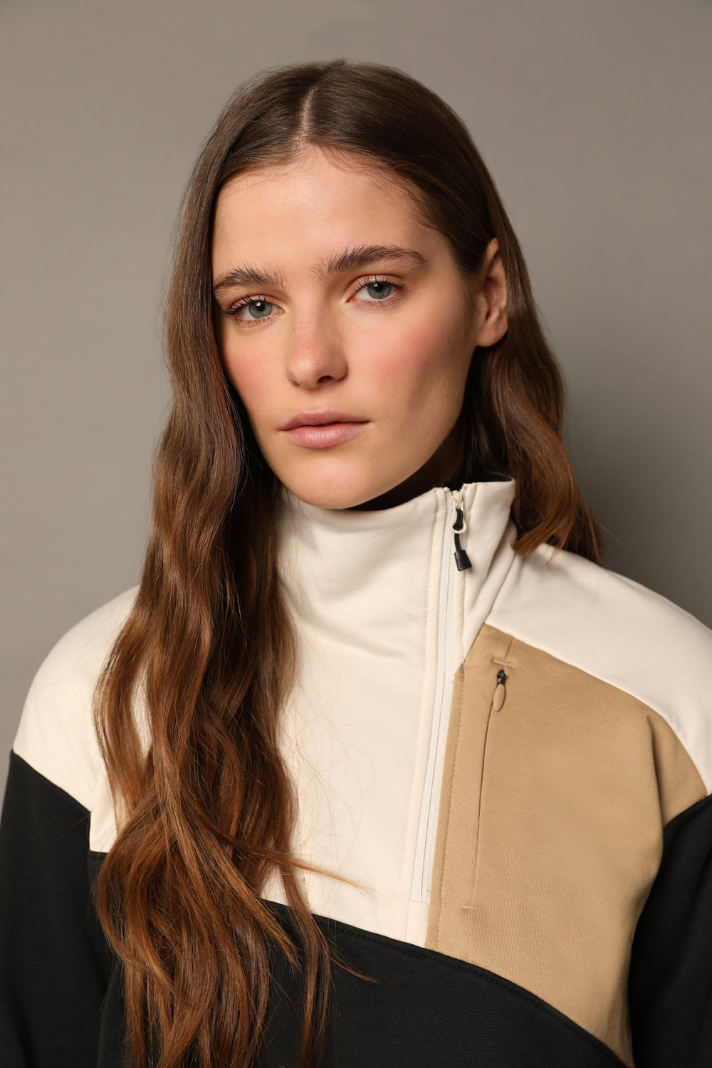 - Protector de mentón, media cremallera asimétrica y dobladillo corto.
