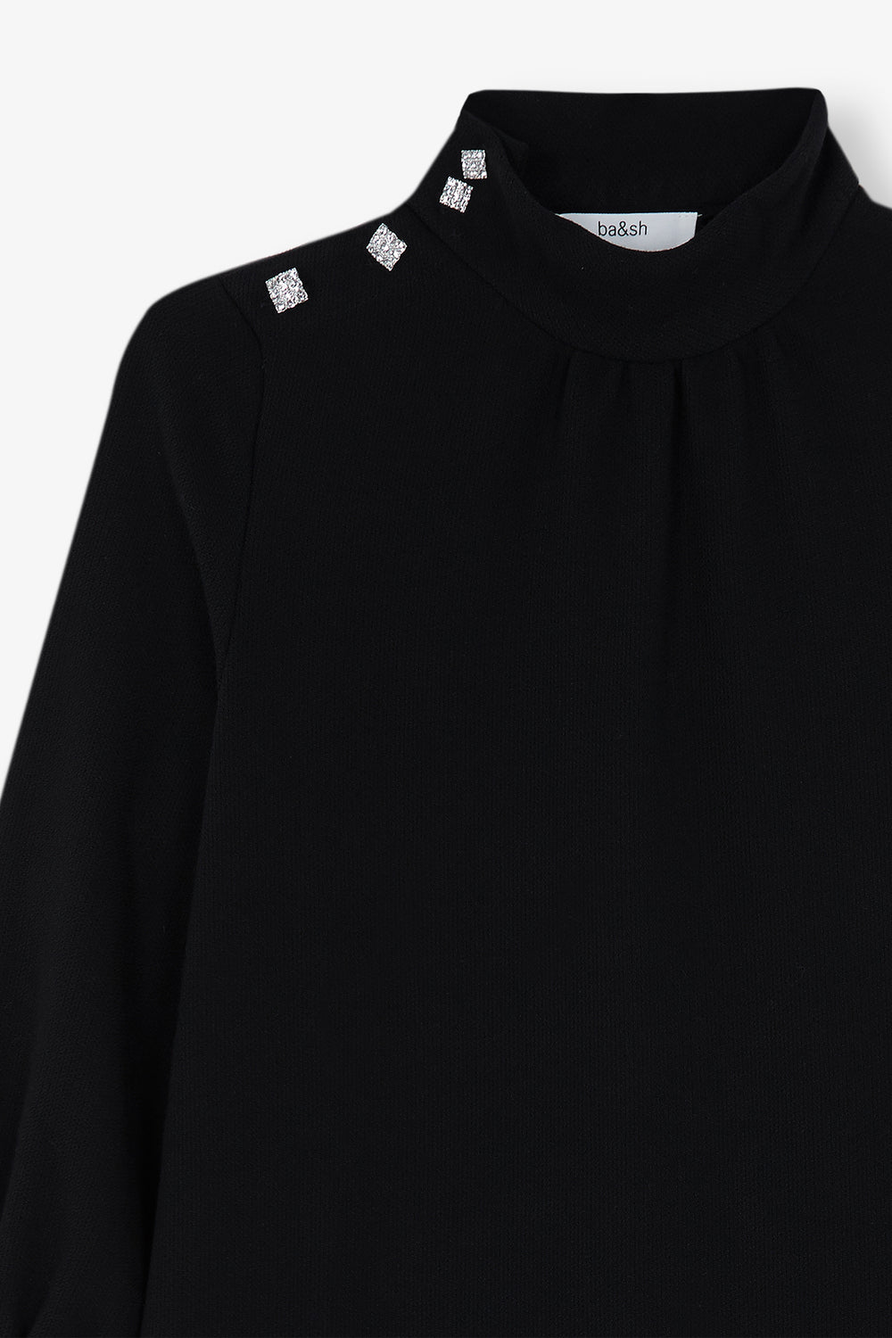 - Detalle de botones joya de dos tamaños en el cuello y en el hombro.