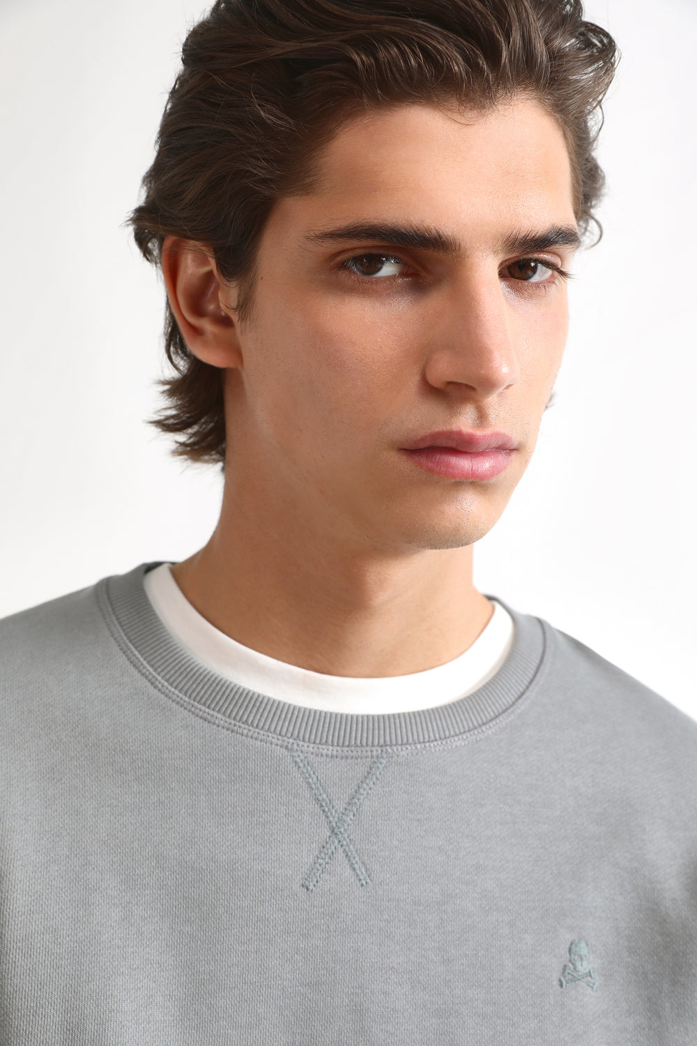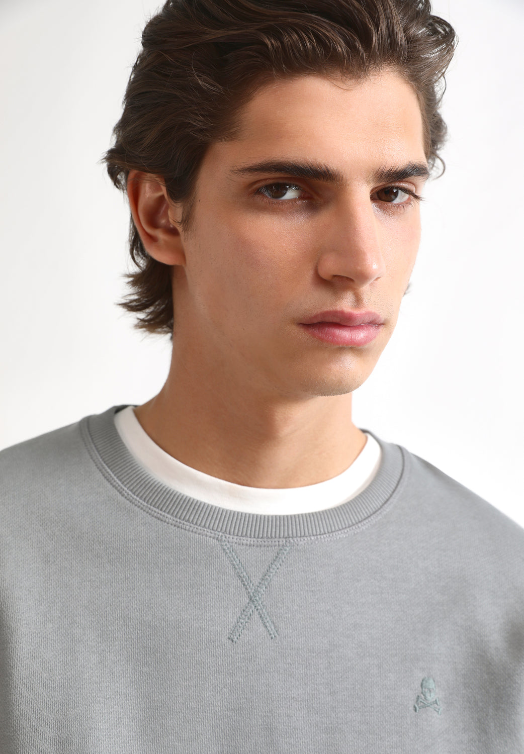 • Calavera bordada a tono en el pecho.