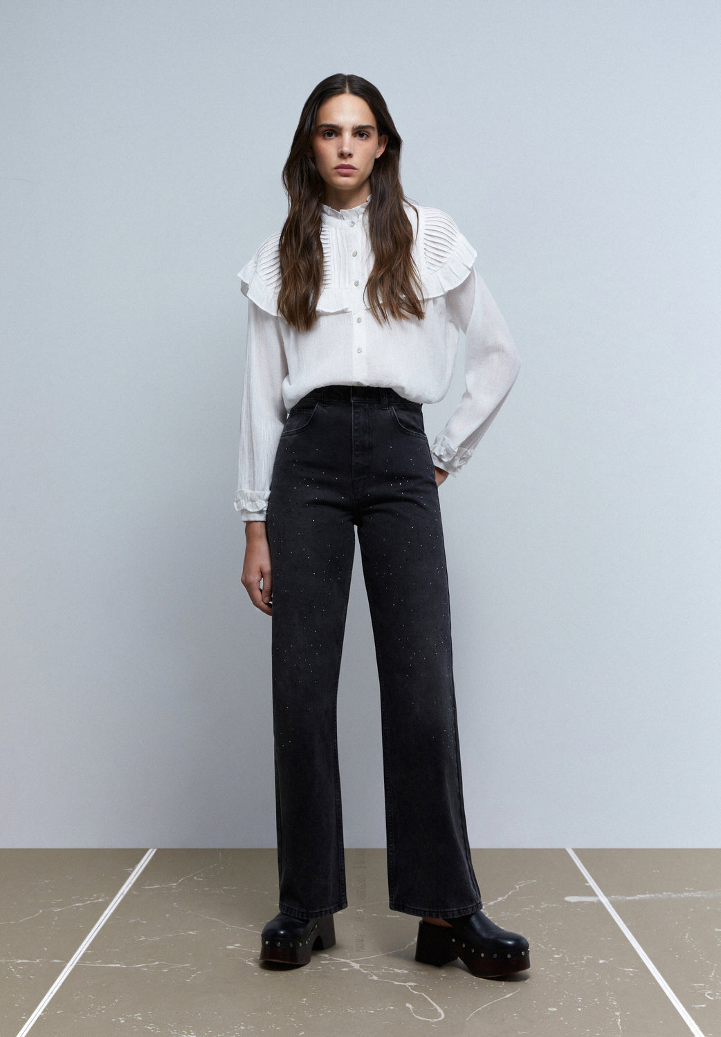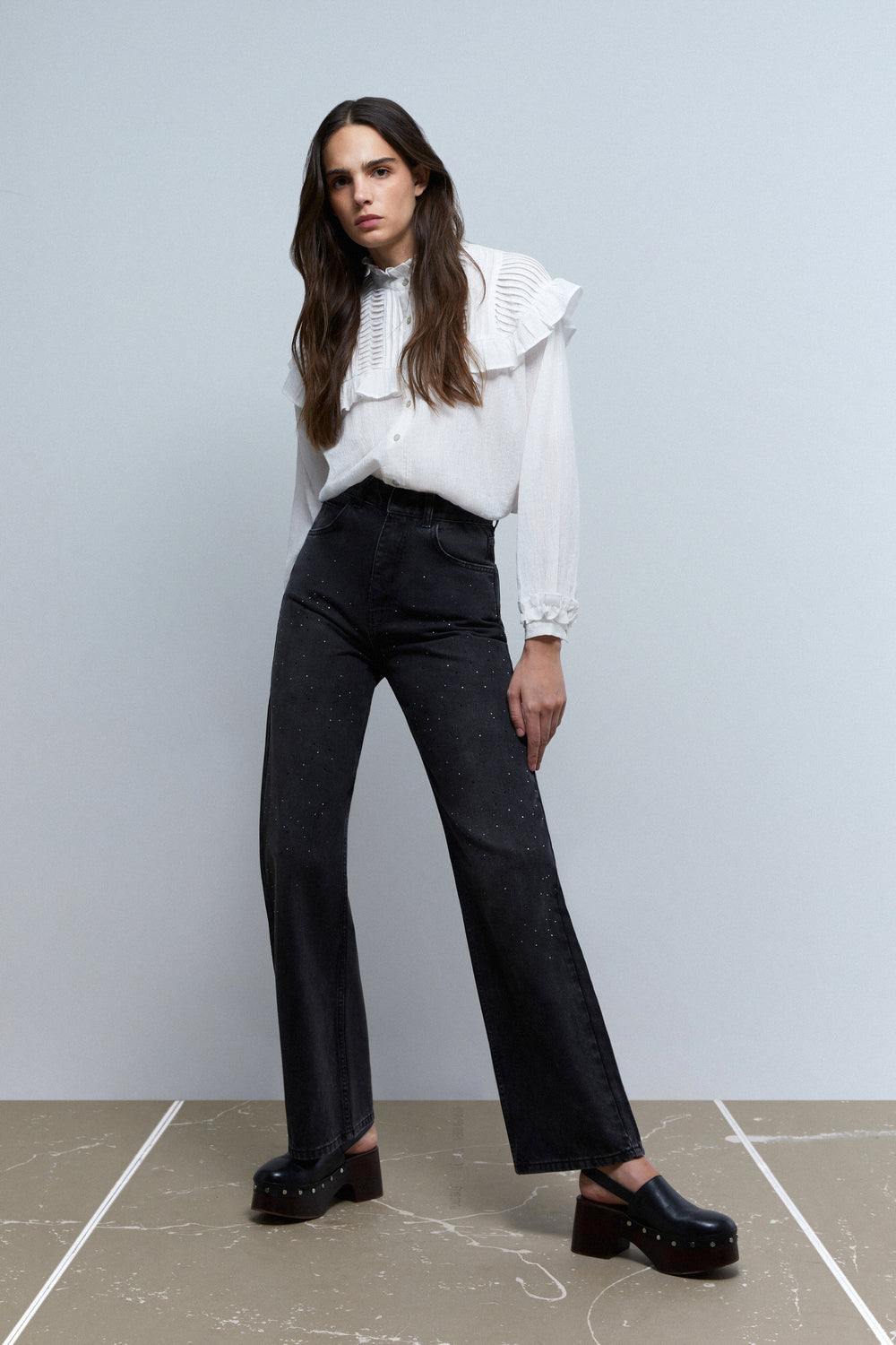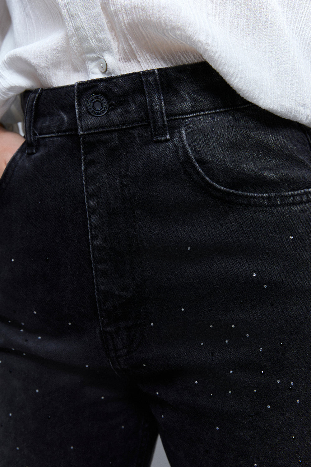 Jeans wide leg con ligeros detalles de aplicación de brillos en parte frontal