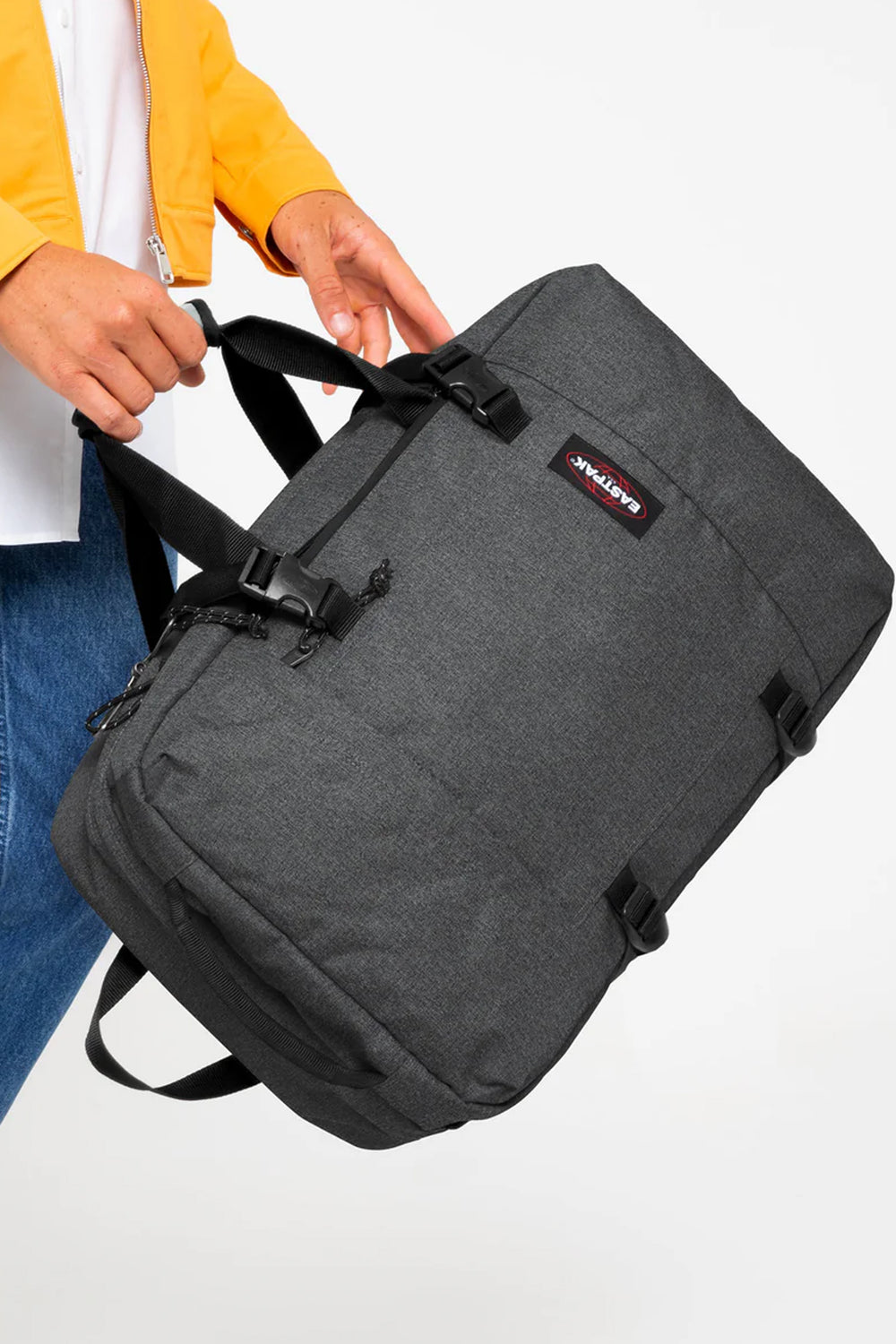 Mochila Eastpak confeccionada en 100% poliéster. Presenta dos compartimentos principales y bolsillo frontal con cremallera, correas de hombro acolchadas y ocultables, asas de transporte ocultables, funda acolchada compatible con dispositivos de hasta de 17". Modelo aceptado como equipaje de mano en la mayoría de aerolíneas.